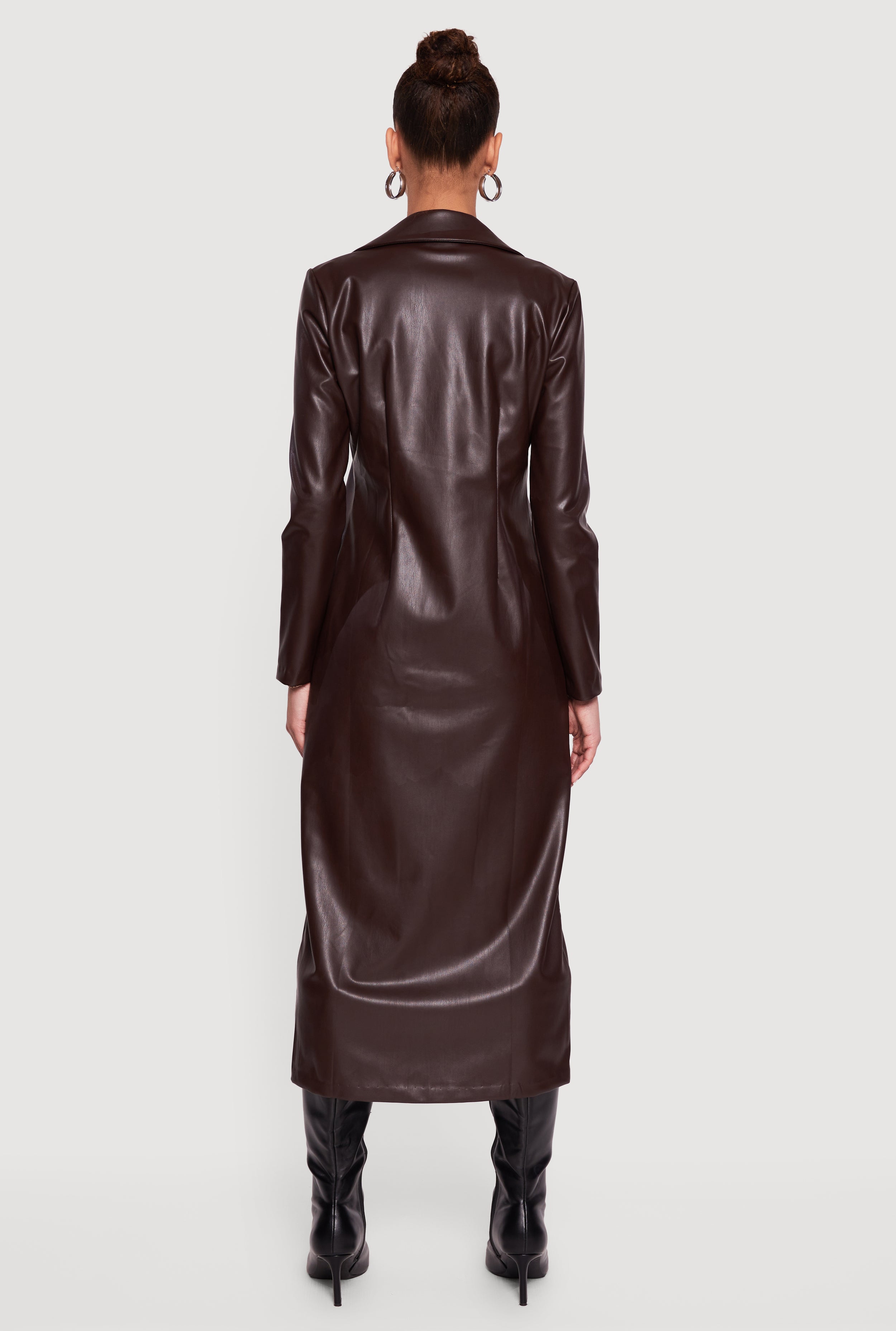 This longline coat features a sharp collar and an open front design for effortless layering. Crafted from faux leather with a fleece lining, it offers a sleek silhouette that extends to mid-calf. Perfect for adding edge to any outfit while keeping warmth in cooler weather.