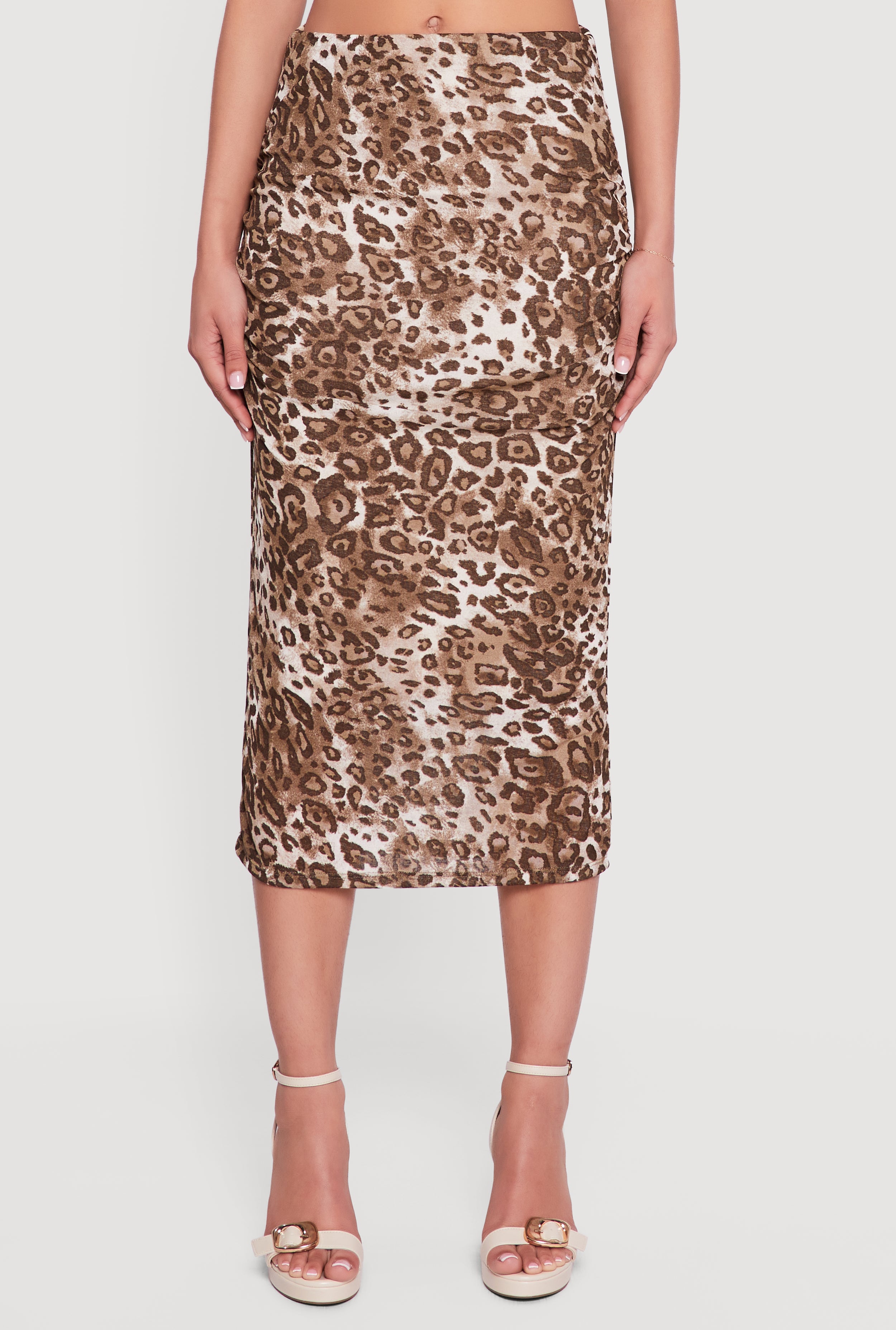 Unleash your wild side with this Leopard Print Ruched High Waisted Midi Skirt. Designed to hug your curves in all the right places, this pencil skirt features chic ruching and a flattering high waist that elongates your silhouette. Perfect for a night out or party, it combines bold animal print with sleek style to keep you turning heads wherever you go.