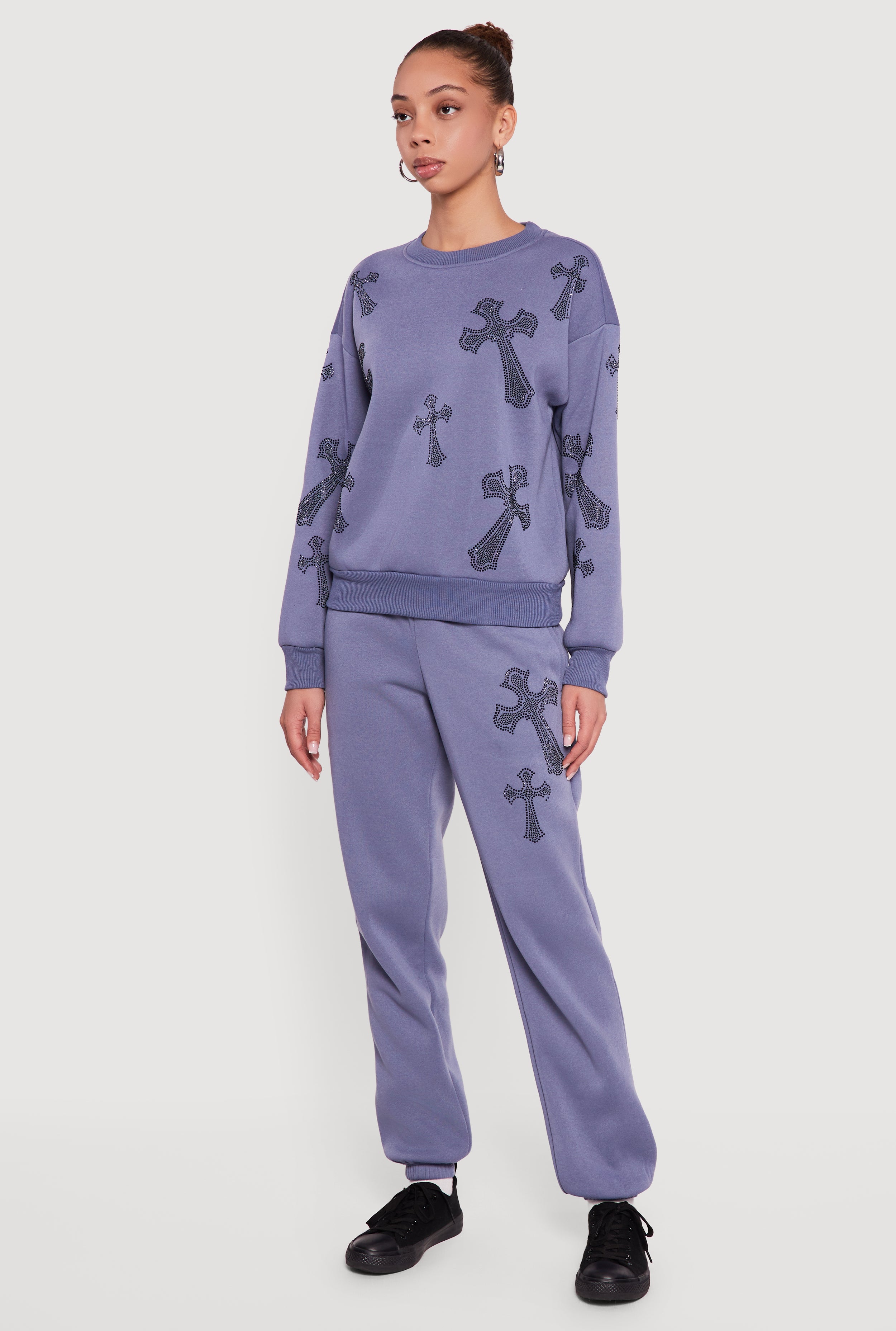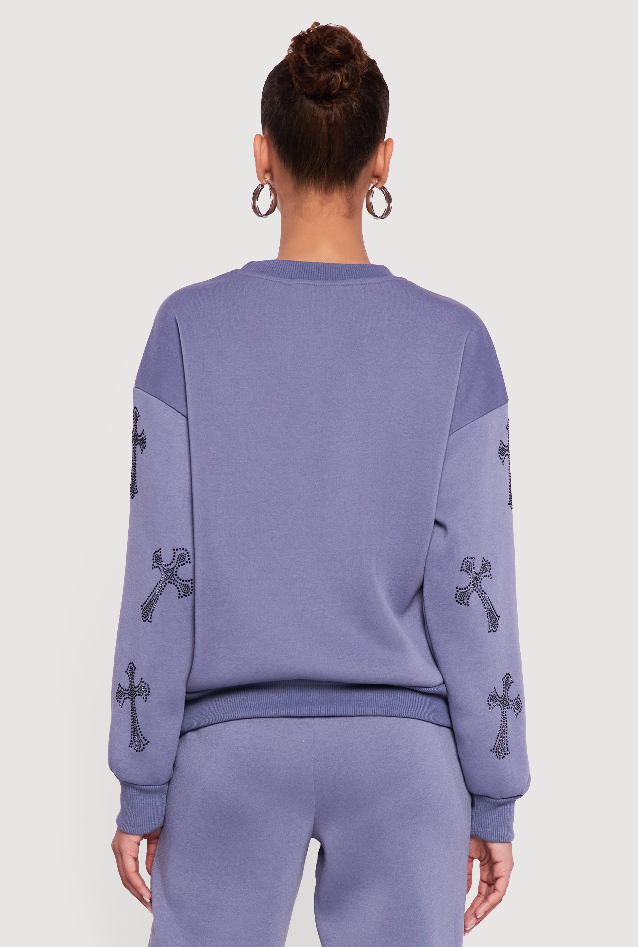 This pullover sweatshirt features a classic crew neckline and long sleeves, designed with a relaxed fit for an easy silhouette. Made from soft fleece, it offers casual athleisure style with a touch of sparkle from rhinestone accents.