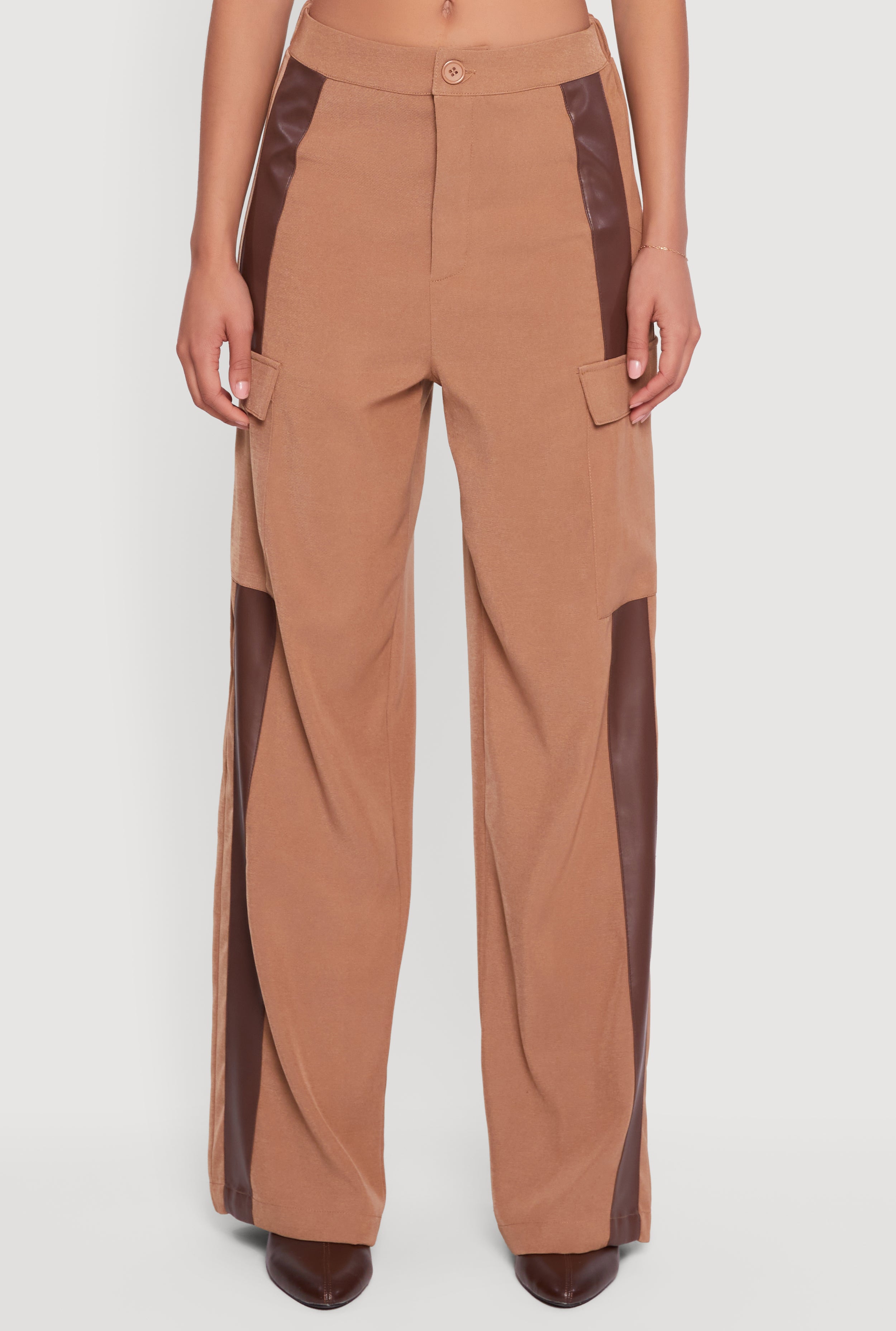 Step up your style game with these Faux Leather Side Stripe Cargo Dress Pants. Designed for the trend-savvy woman who loves a mix of edgy and casual, these pants feature a sleek faux leather two-tone detail that adds a modern twist to classic cargo vibes. The mid-rise, loose fit, and straight-leg cut offer all-day comfort while keeping your look effortlessly cool. Perfect for casual outings or when you want to add a little edge to your everyday wardrobe.
