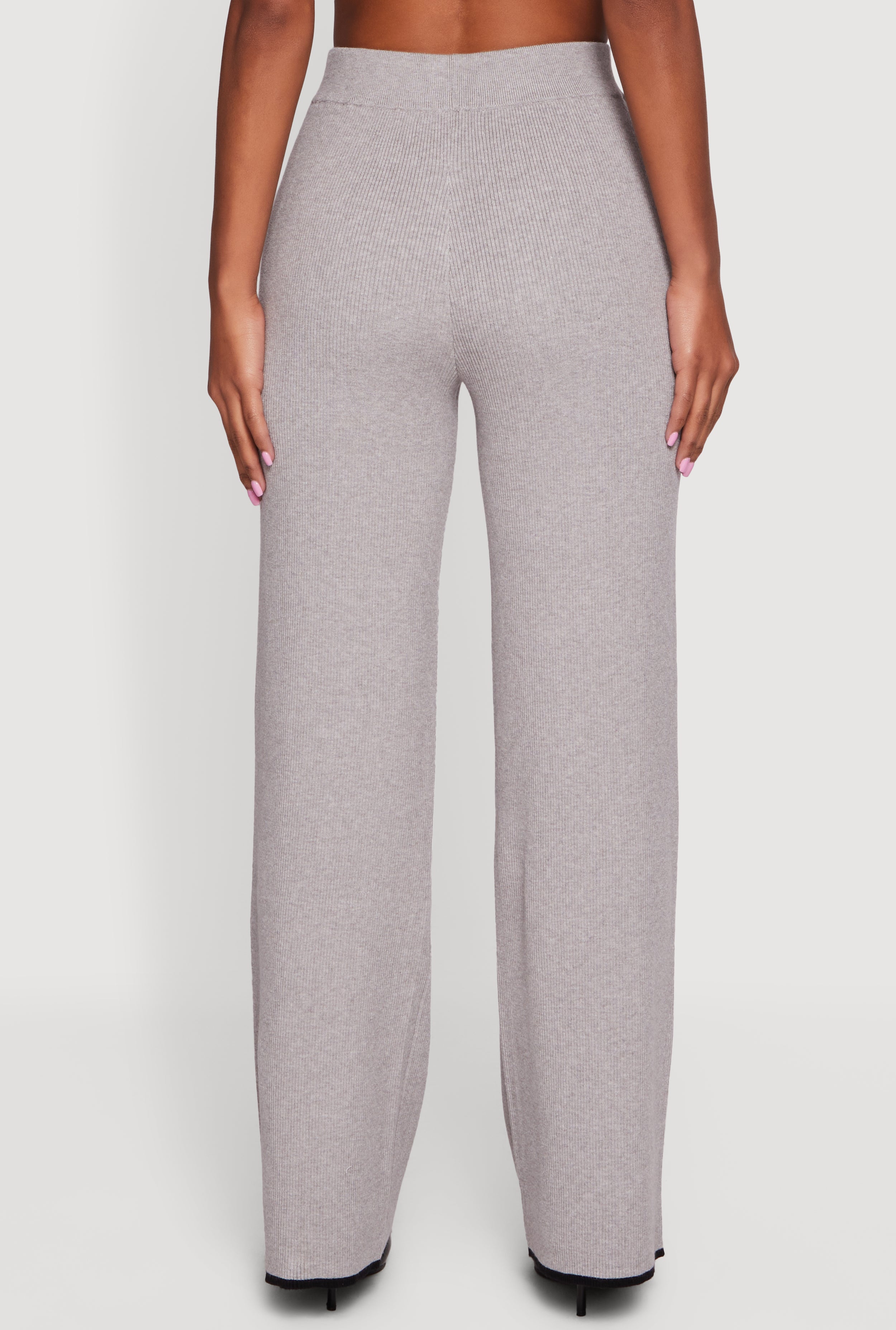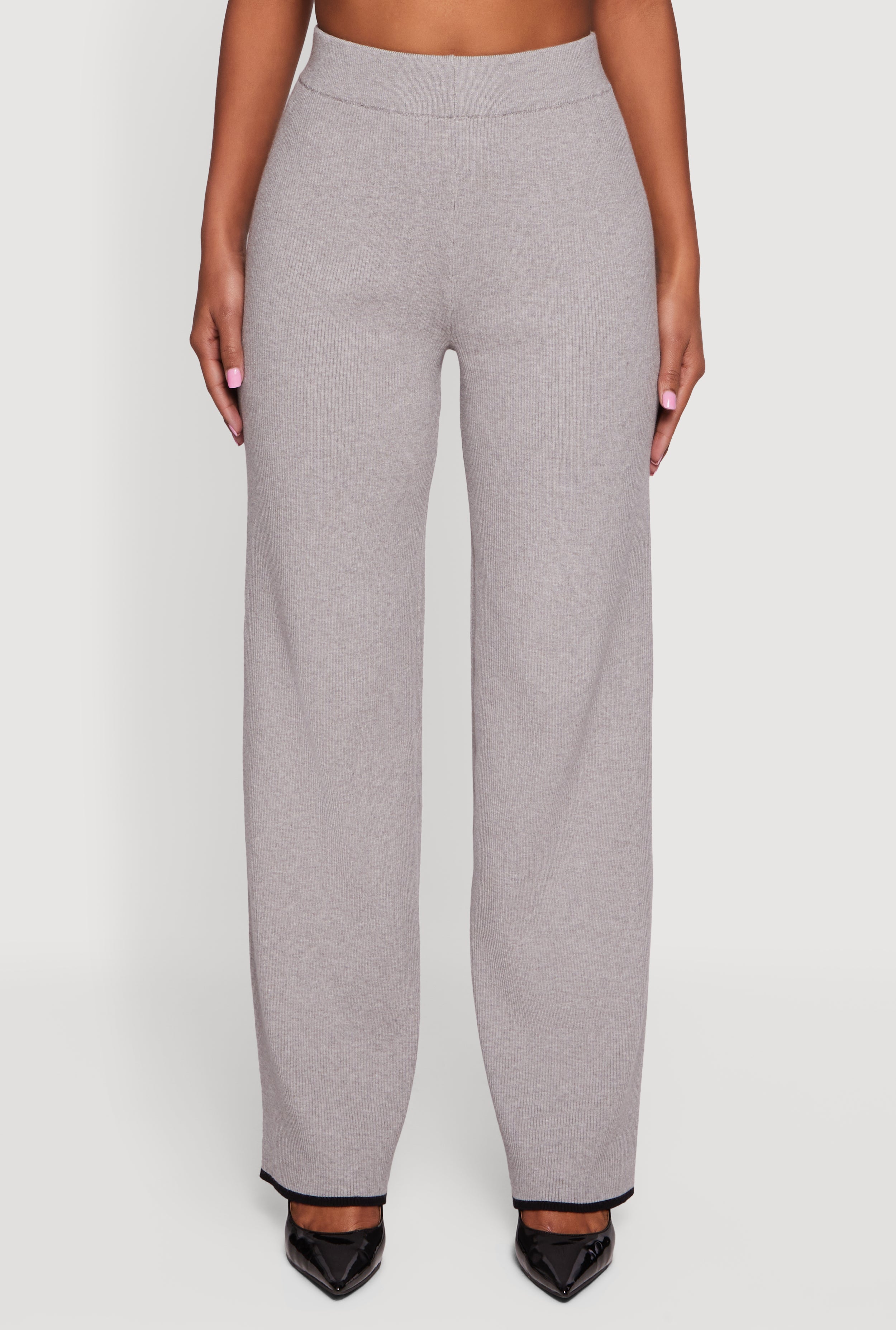 These high-waisted pants offer a classic straight-leg silhouette crafted from ribbed knit fabric for seasonal warmth. The full-length design features subtle contrast trim at the hem for a refined casual look that easily pairs with your favorite tops. Perfect for fall and winter, they bring laid-back style with a polished edge.