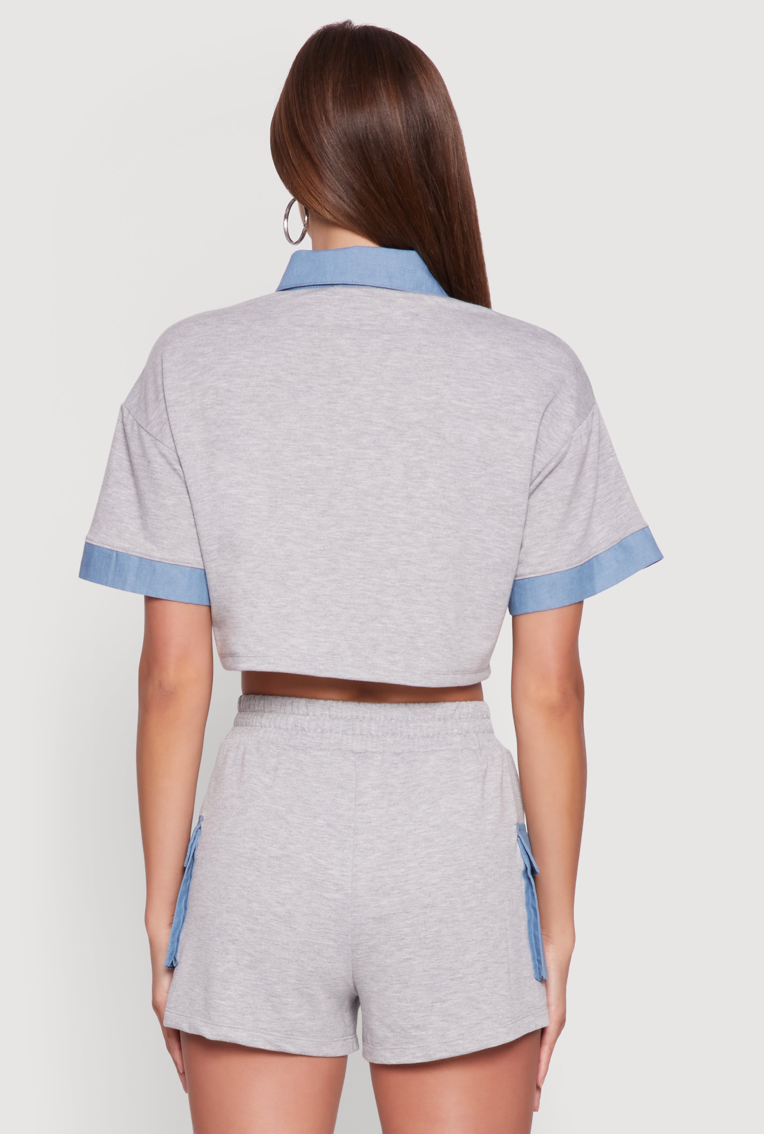Get ready to turn heads with the Chambray Detail Short Sleeve Crop Top, the perfect blend of casual cool and effortless style. Featuring a charming chambray detail and a classic shirt collar, this top offers a timeless silhouette that pairs perfectly with your favorite jeans or skirts. The button front adds a touch of vintage flair, while the cropped hem keeps your look fresh and flirty. Made from soft French Terry, it’s as comfortable as it is stylish—ideal for those laid-back days or casual outings. Elevate your wardrobe with this versatile piece that’s all about easy, everyday fashion.