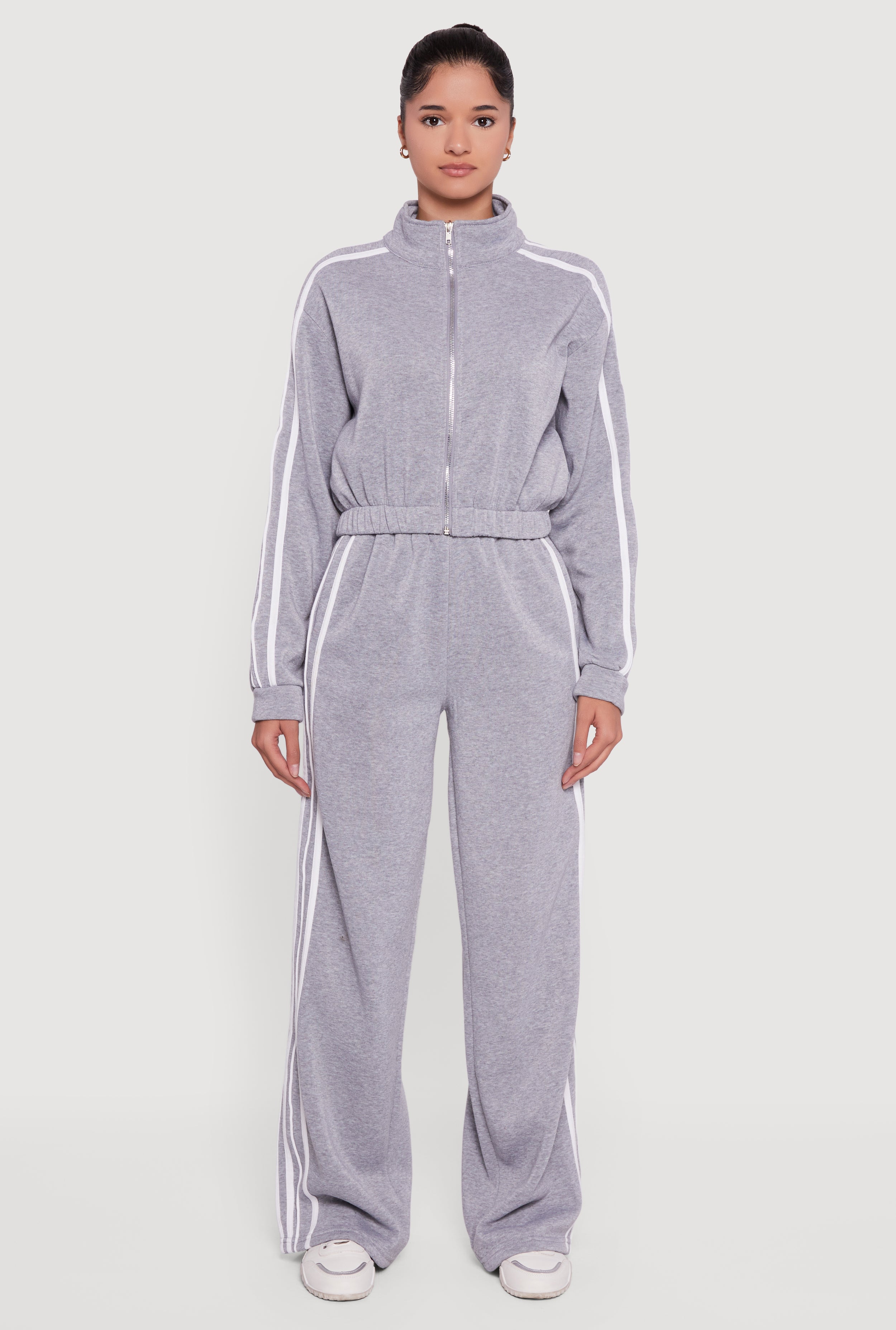 Step up your casual game with this Contrast Trim Zip Front Mock Neck Sweatshirt. Perfect for those days when you want to stay cozy without sacrificing style, this fleece-lined sweatshirt features a sleek zip front and sporty side stripes that add a pop of contrast. The mock neck and drop shoulder design bring a laid-back vibe, making it a must-have for athleisure lovers and everyday wear alike.