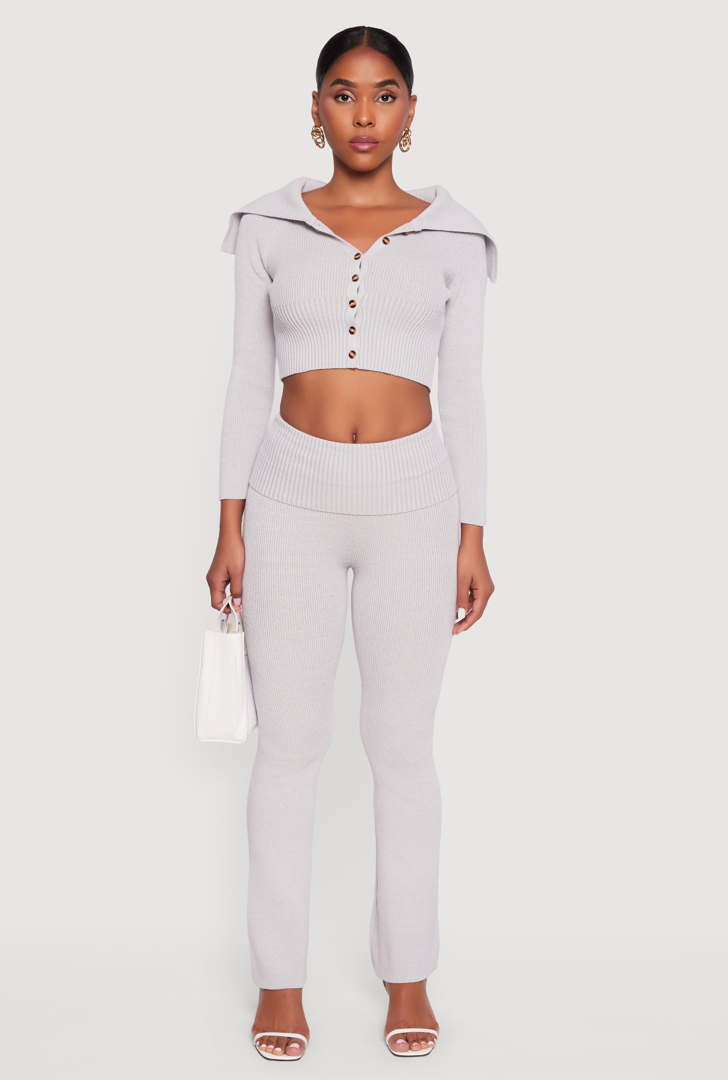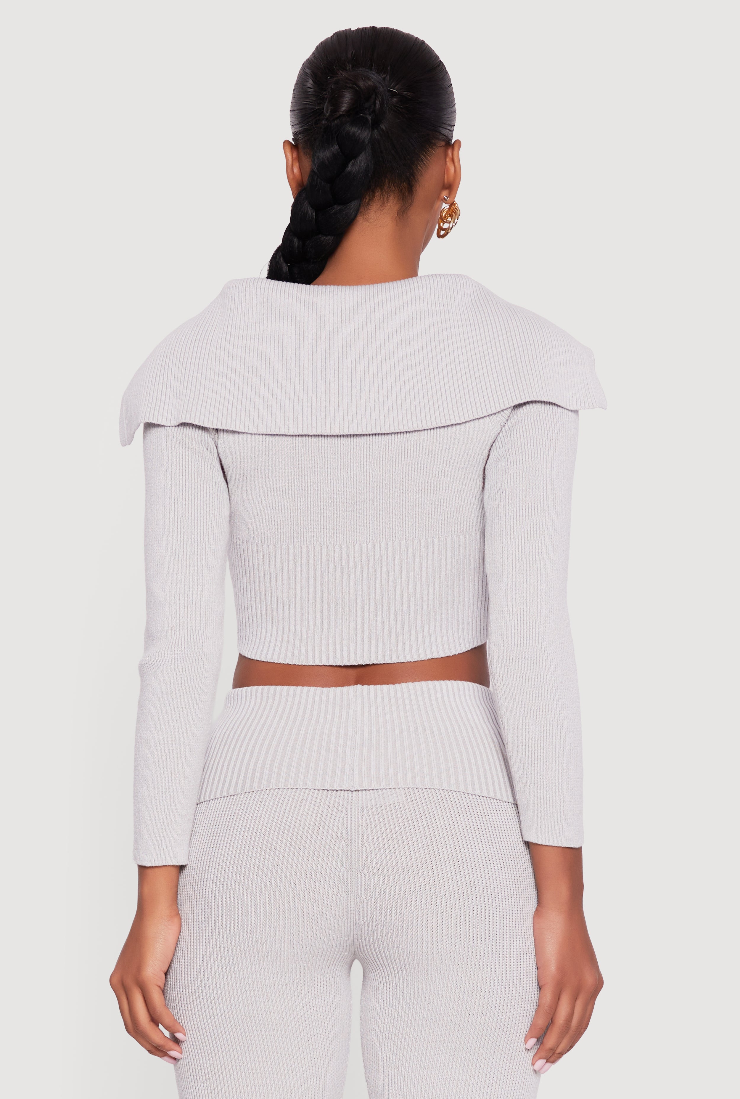 Fold Over Collar Ribbed Knit Button Front Sweater