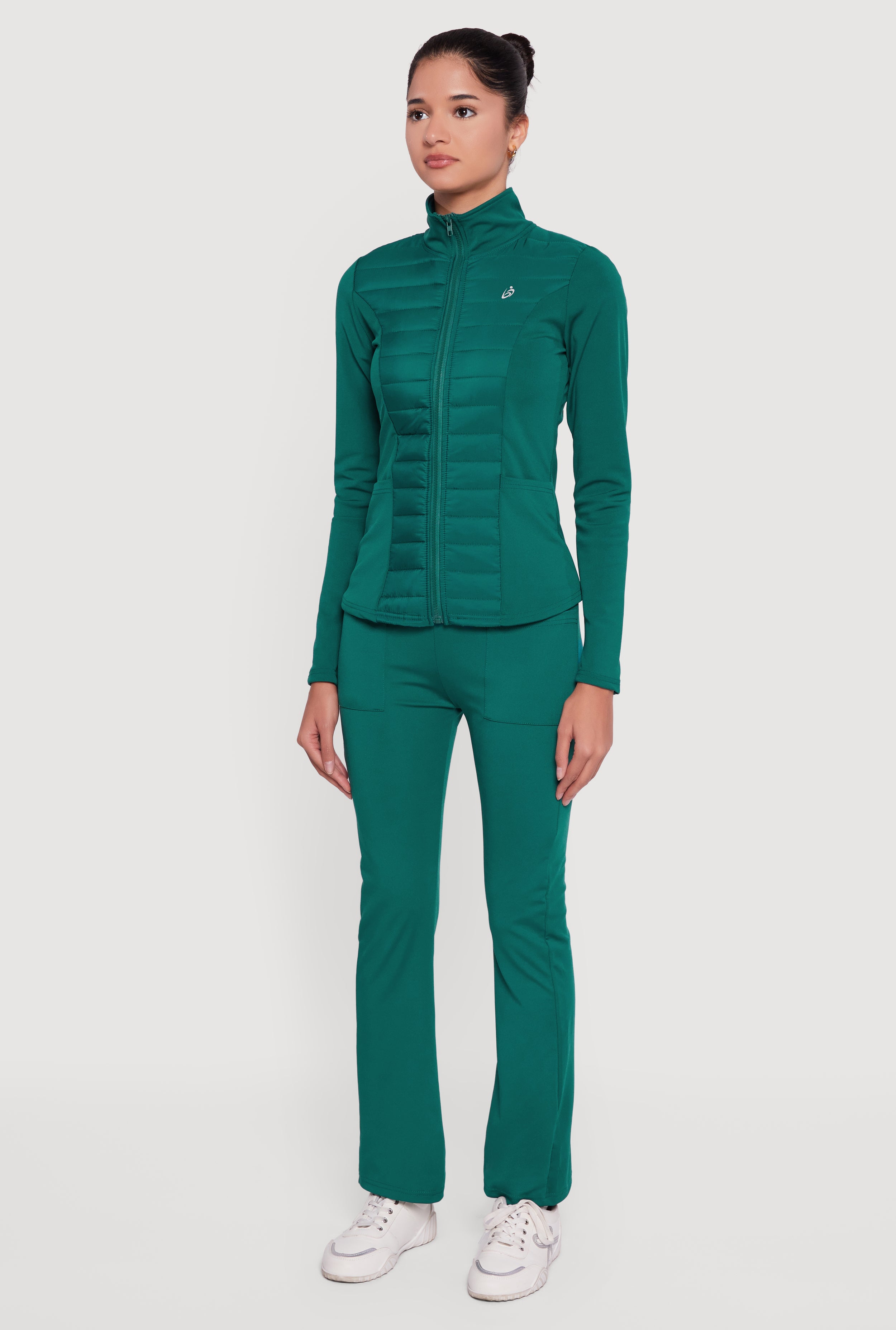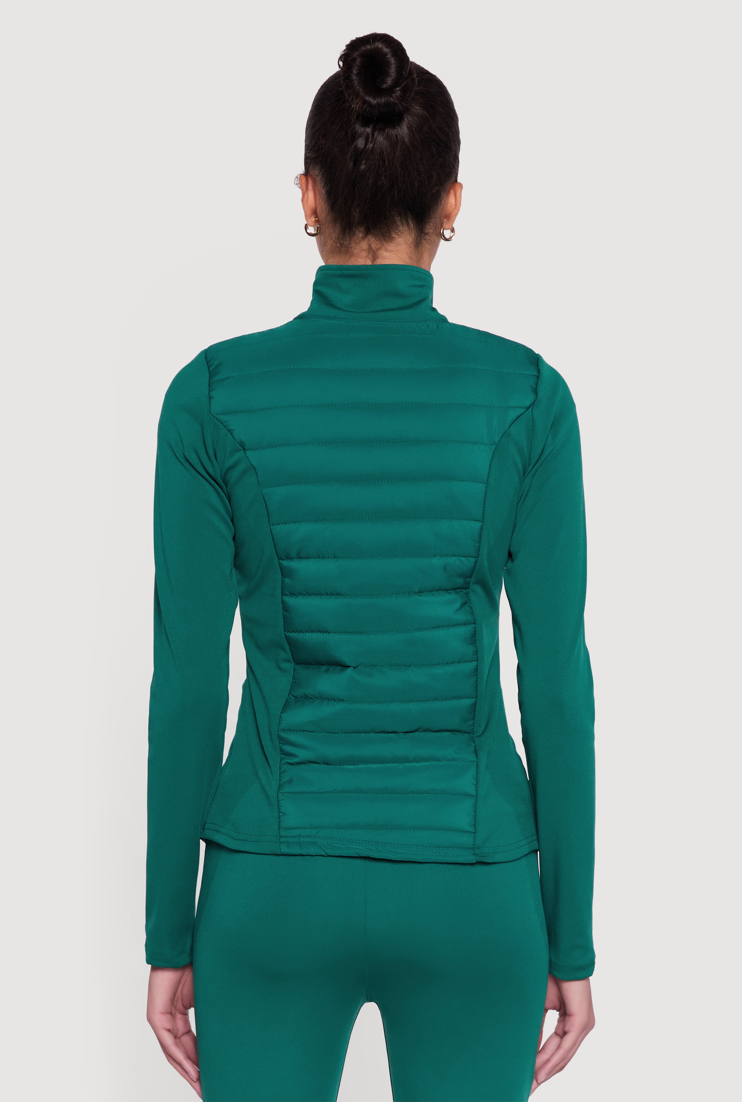 Step up your activewear game with this Hybrid Quilted Activewear Jacket. Designed to keep you cozy and stylish, it features a sleek mock neck and long sleeves for extra coverage. The zip front closure makes it easy to layer, while the quilted panel detail adds a trendy edge to your look. Perfect for workouts or casual outings, this jacket blends comfort and fashion effortlessly.