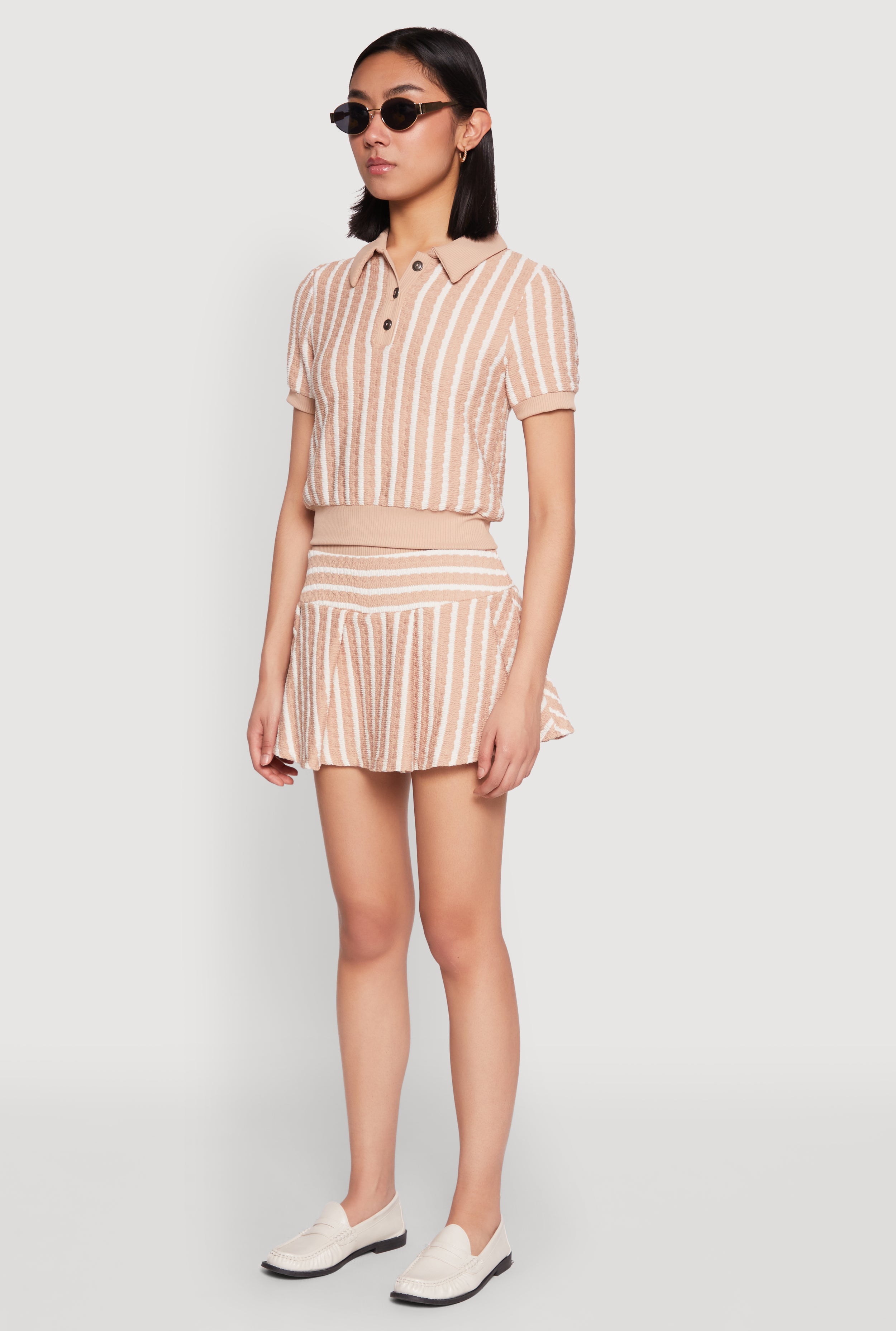 Upgrade your casual wardrobe with our Textured Knit Striped Polo Shirt, the perfect blend of comfort and style. Featuring a classic fit and timeless silhouette, this polo shirt is your go-to for effortless chic. The textured knit fabric adds a unique touch, while the contrast trim details give it a trendy edge. With short sleeves and a cropped hem, it’s ideal for those sunny days or layered looks. Whether you're dressing up or down, this versatile piece will keep you looking fresh and feeling confident all day long.