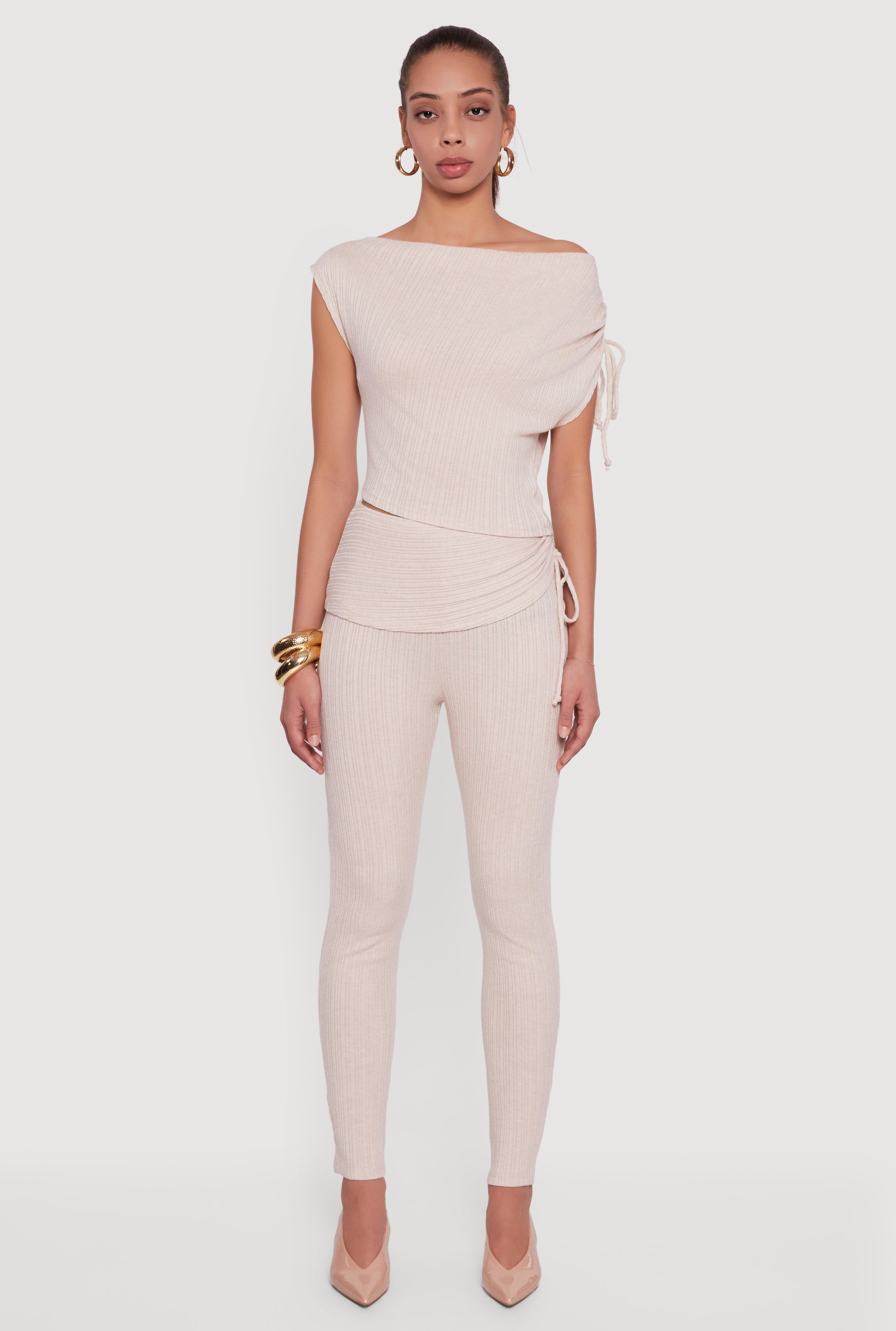 Brushed Rib Knit One Shoulder Drawstring Crop Top