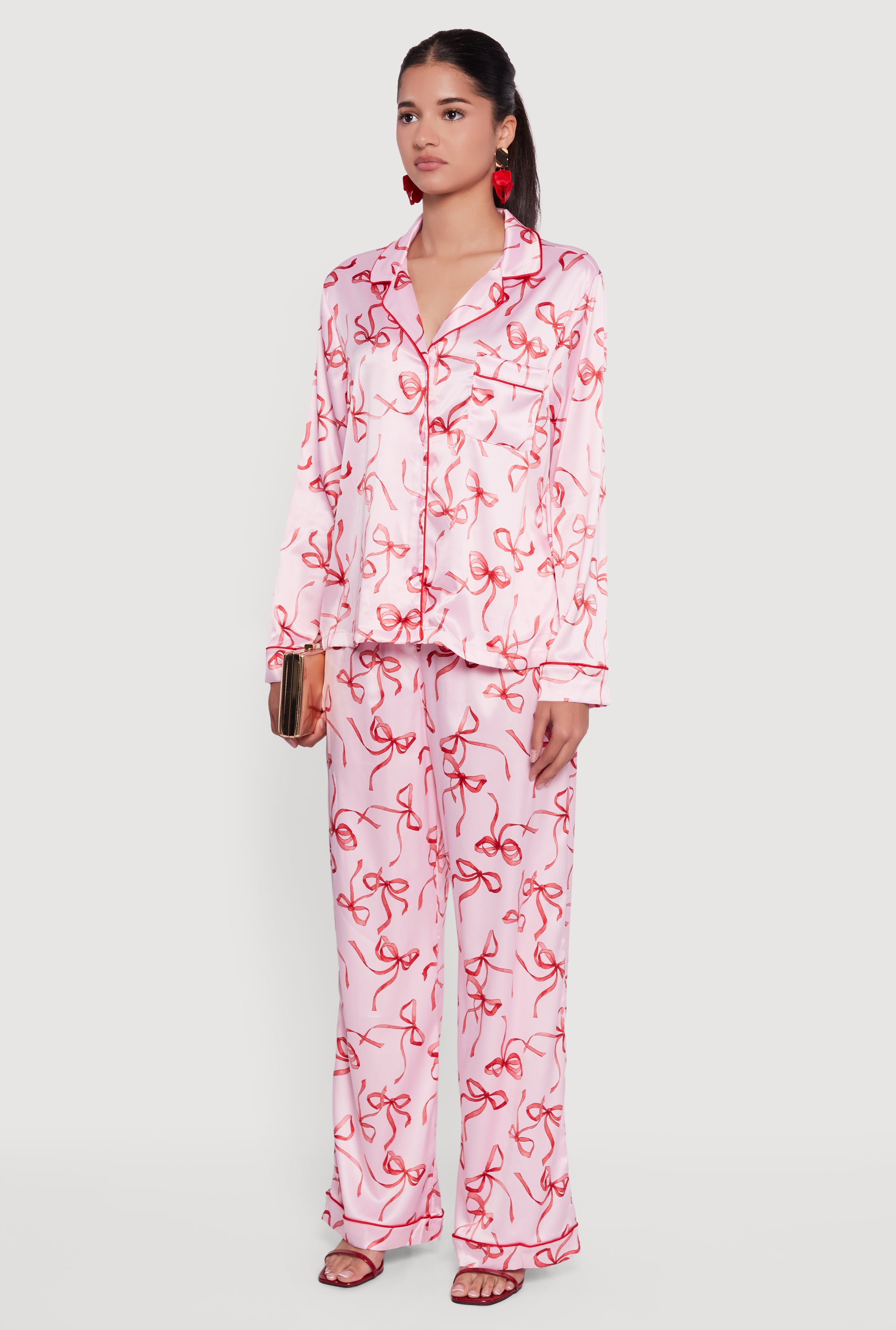 Elevate your everyday look with this Satin Bow Print Long Sleeve Button Front Shirt. Designed with a relaxed fit and crafted from smooth satin, it offers a perfect blend of comfort and style. The playful bow print adds a cute touch, while the classic shirt collar and button-front closure keep it effortlessly chic. Ideal for casual days or lounging in style, this shirt is your new go-to for easy, feminine vibes.