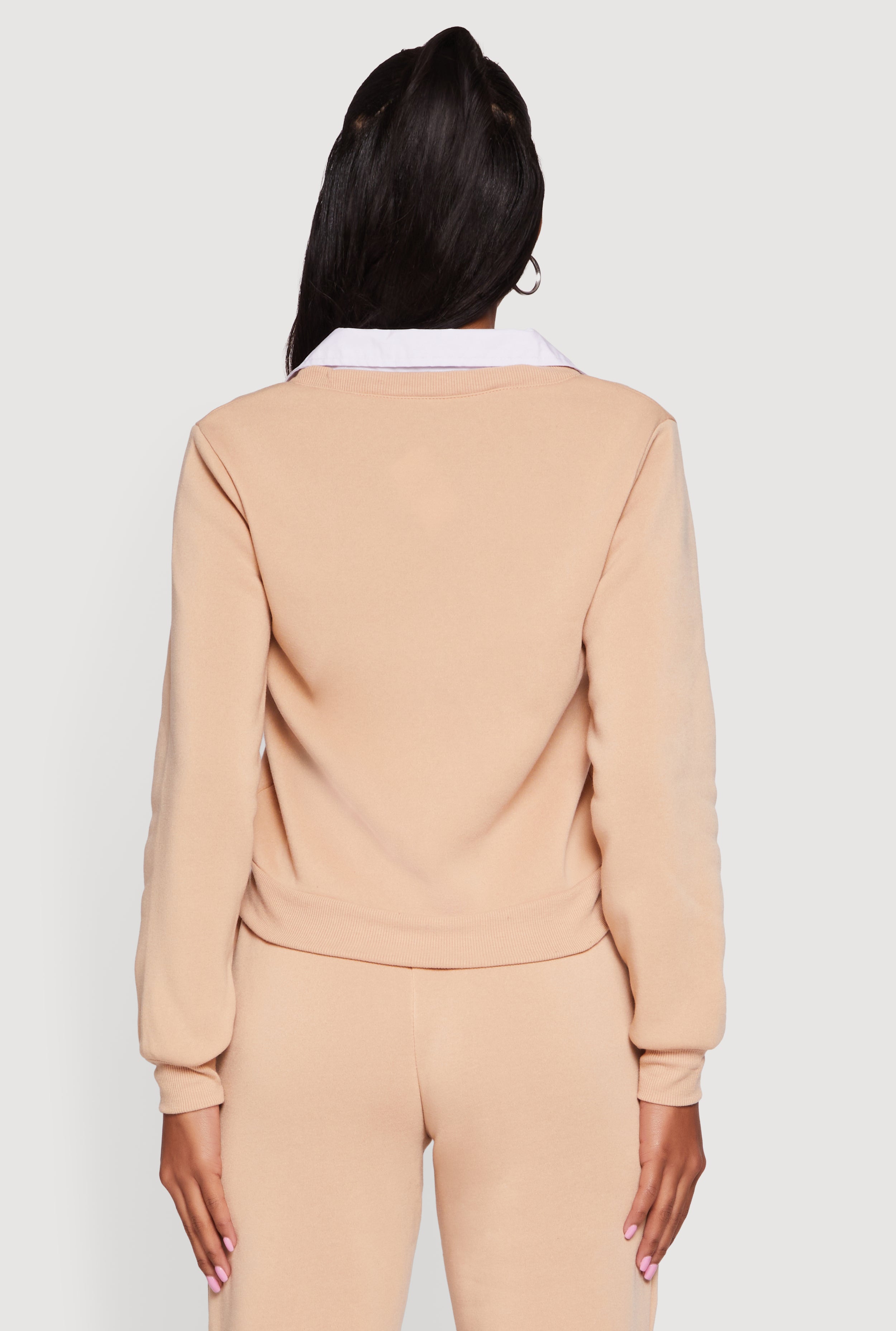 - Long sleeves and collared neckline for a polished layered look