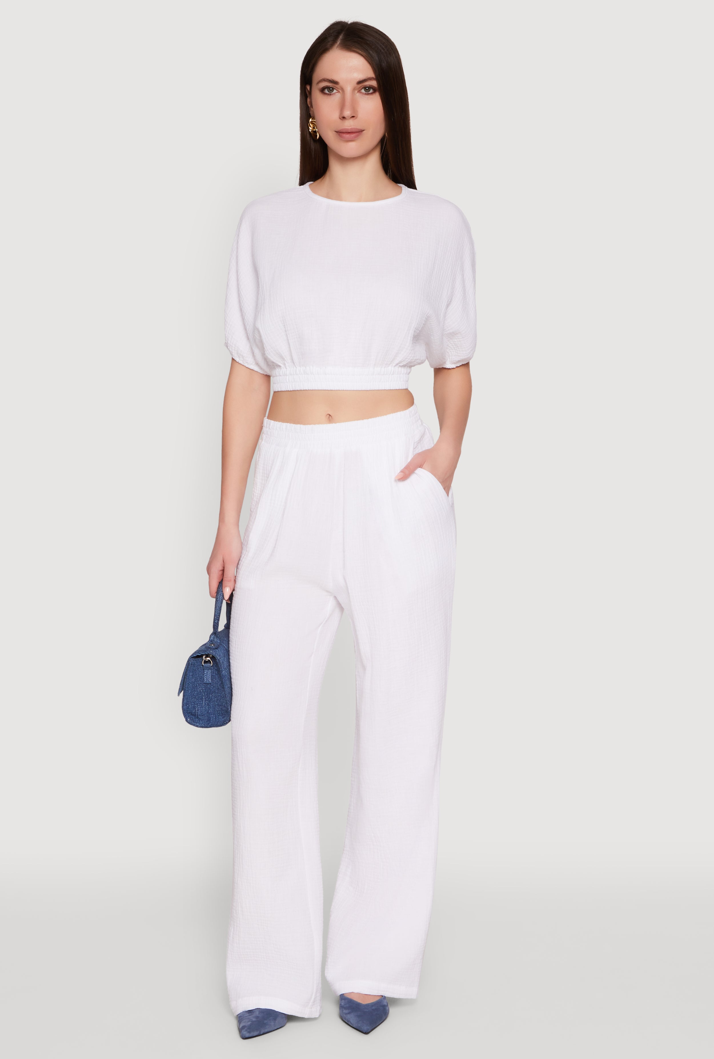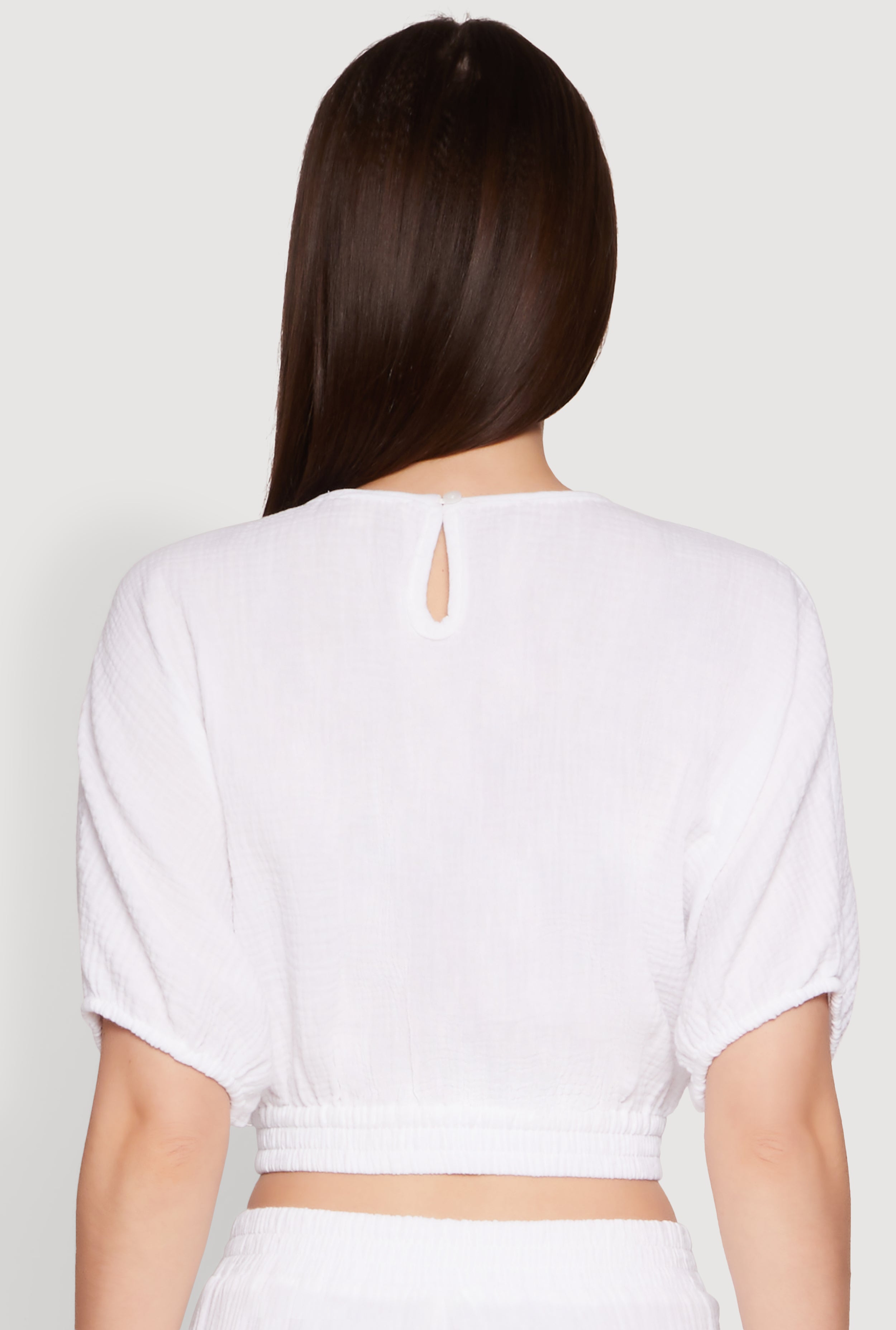 Upgrade your wardrobe with the Chic Gauze Knit Crew Neck Cropped Blouse with Bubble Sleeves. Perfect for creating effortless, stylish looks, this blouse combines comfort with a trendy vibe. Its classic fit and timeless silhouette make it a versatile piece that easily transitions from day to night. Whether you're dressing up for a casual outing or adding a chic touch to your sets, this blouse is a must-have. The elastic hem and bubble sleeves add playful detail, while the button back keyhole gives it a subtle, stylish finish. Light, breathable gauze knit fabric keeps you comfy all day long. Elevate your everyday style with this fun and fashionable top that’s as affordable as it is fabulous.