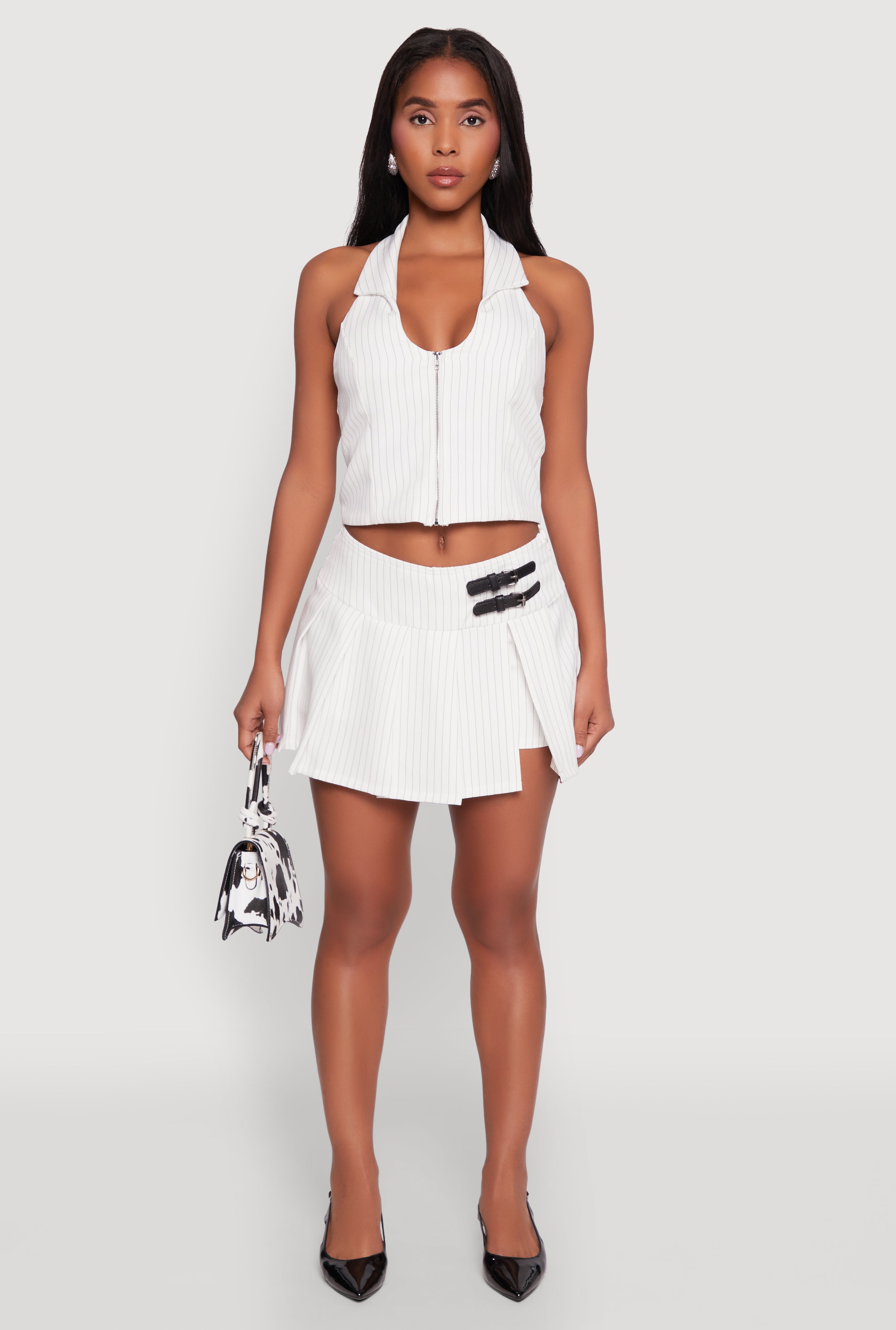 Step up your style game with the Iris Pinstripe Zip Front Collared Halter Top. This sleek sleeveless piece features a classic pinstripe pattern and a cropped hem that’s perfect for showing off your favorite high-waisted jeans or skirts. The zip front adds an edgy twist while the halter neckline and open back keep things flirty and fresh. Whether you’re heading out for a casual day or a night out, this top has got your back—and your front—in style.