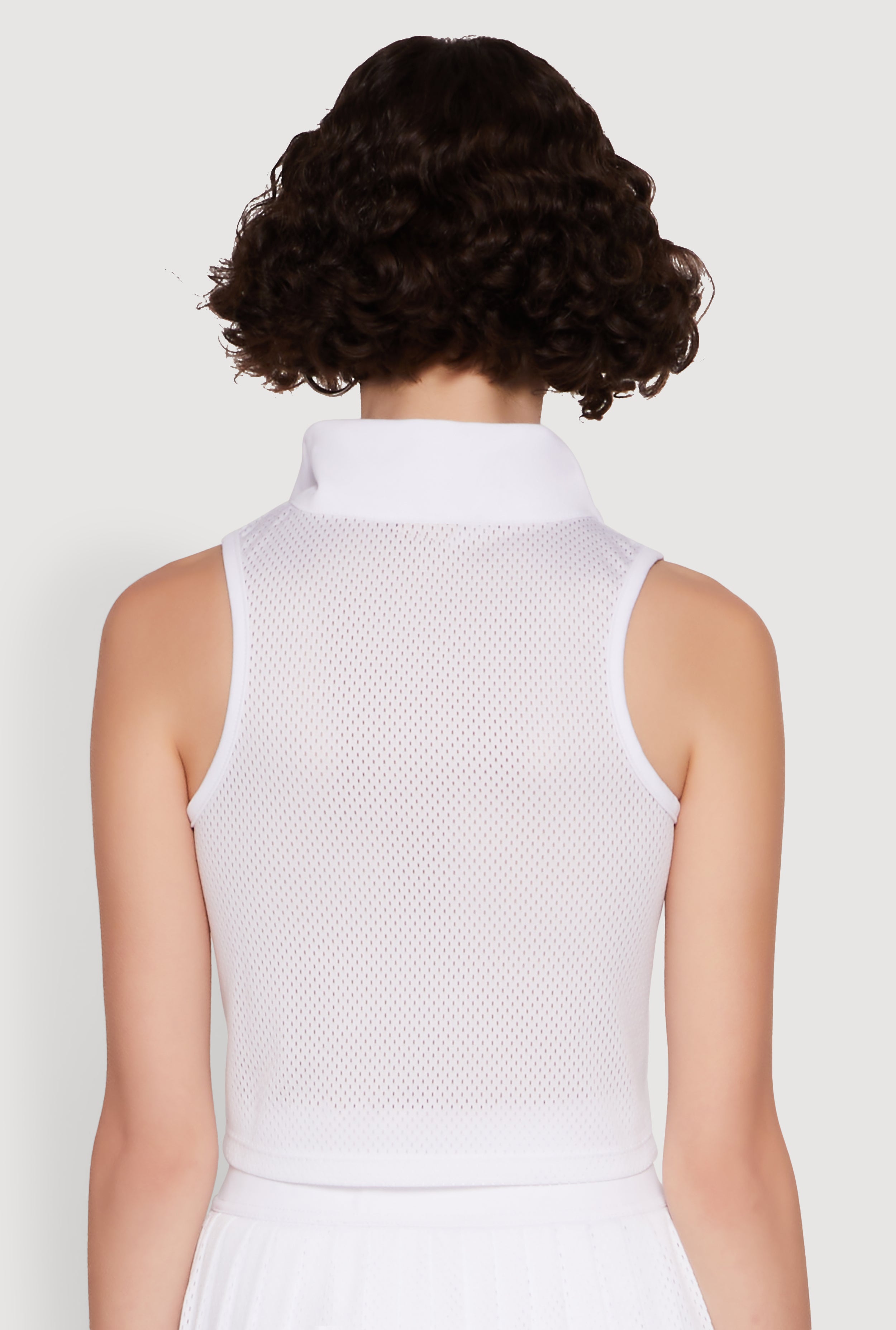 Upgrade your casual wardrobe with our stylish Zip Front Jersey Mesh Back Polo Top. Perfect for those hot days or when you want to stay cool and chic, this sleeveless polo features a sleek zip neck and a breathable mesh back that adds a touch of sporty flair. Its classic fit and cropped hem make it a versatile piece that pairs effortlessly with your favorite jeans or shorts. Whether you're running errands or hanging out with friends, this top is your new go-to for effortless style and comfort.