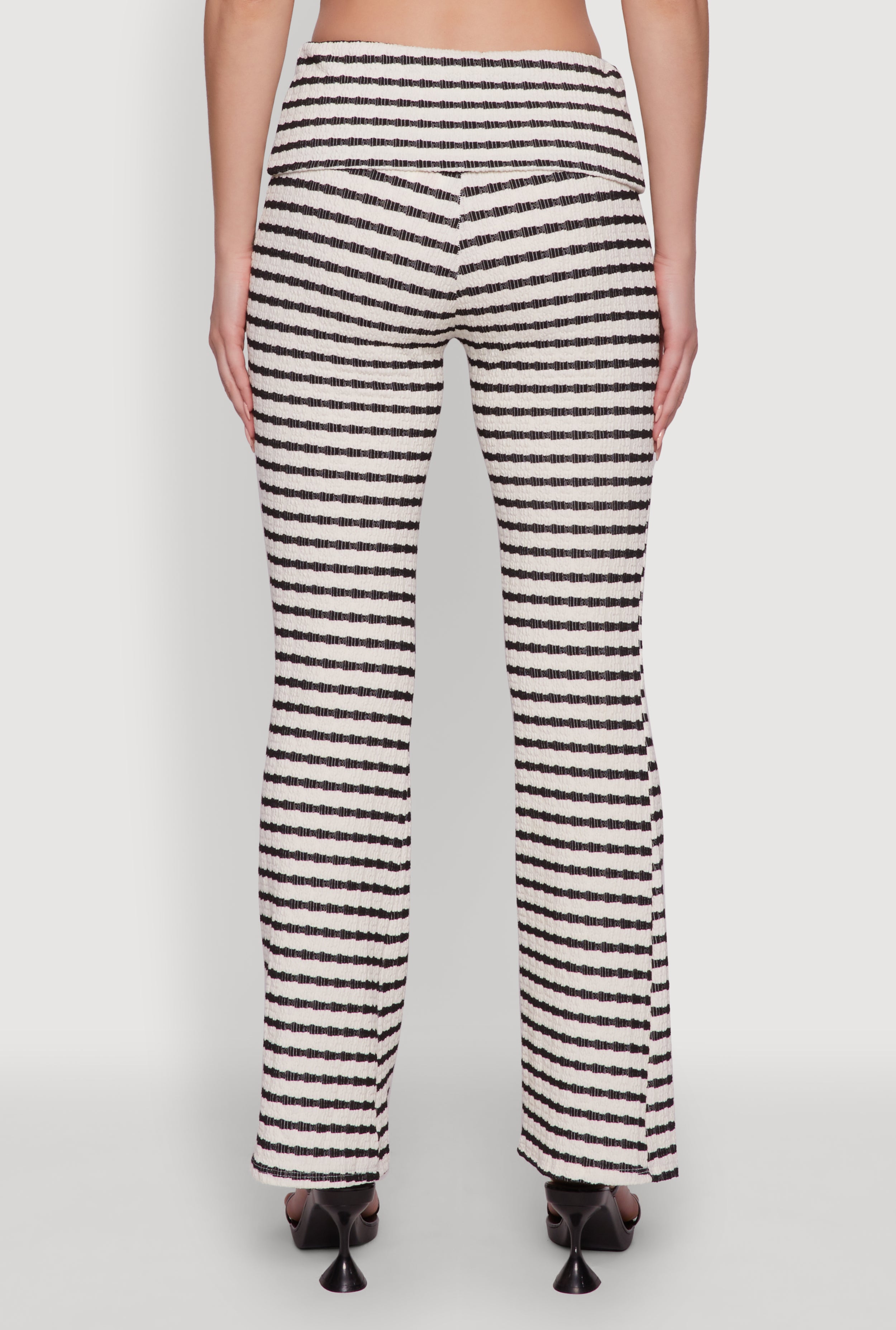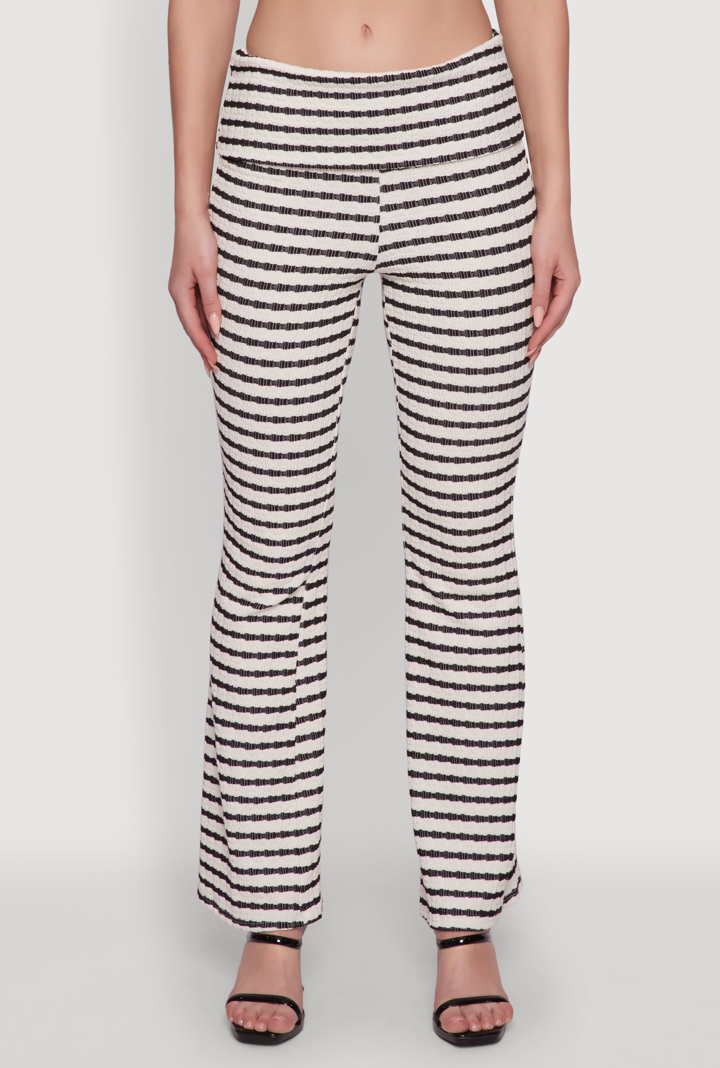 Step up your style game with these Trendy Fold Over Striped Bootcut Pants designed for the modern woman who loves comfort and flair. Featuring a mid rise and a flattering bootcut silhouette, these pants offer a sleek and elongating fit that pairs perfectly with your favorite tops. The textured knit fabric adds a cozy touch while the bold striped pattern brings a fresh, eye-catching vibe. Whether you're dressing up for a casual day out or just want to feel effortlessly chic, these pants are your new go-to.