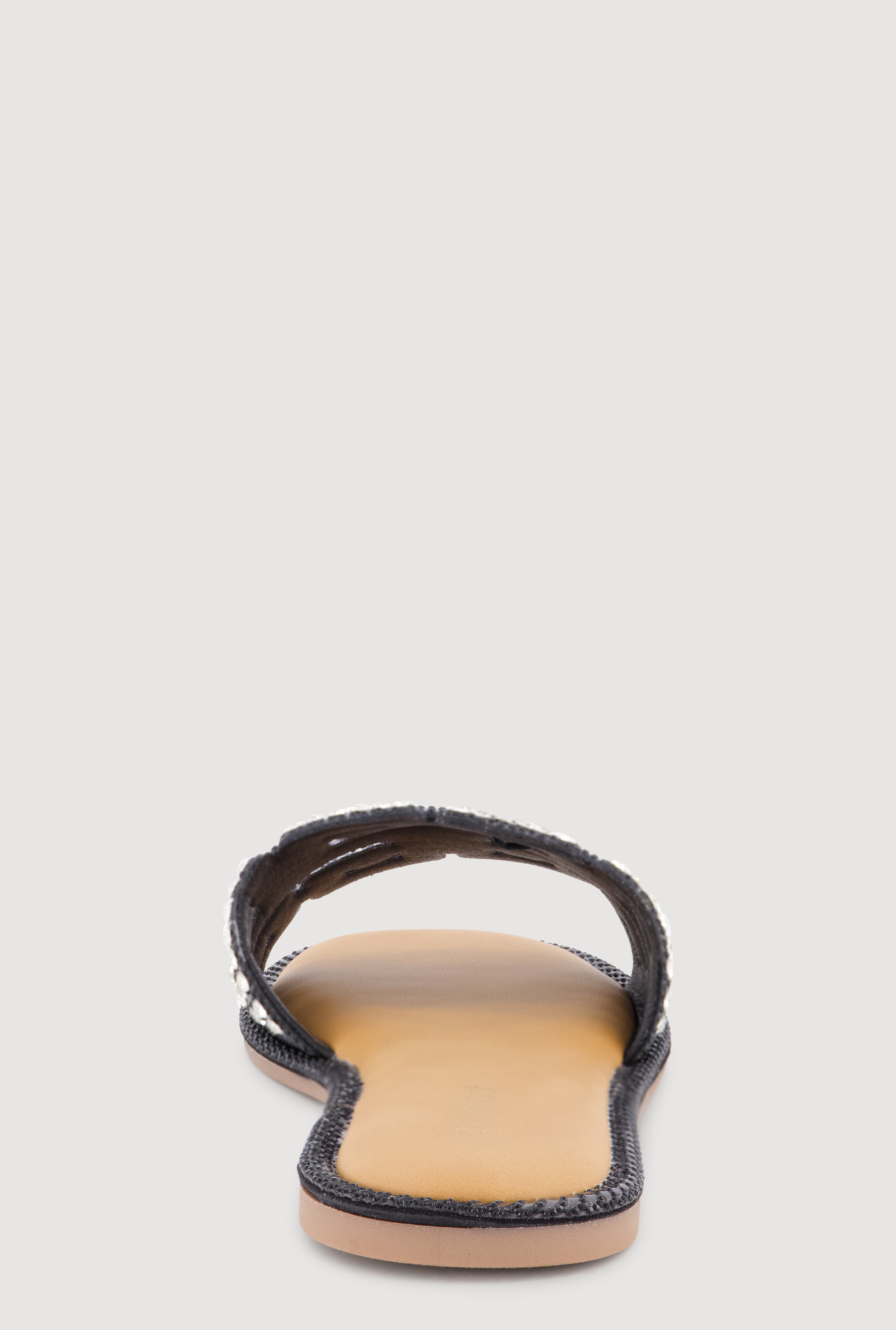 These slide sandals feature a flat sole and an open toe design for easy wear. The standout band showcases a geometric Greek key pattern embellished with rhinestones, adding a touch of sparkle. Perfect for casual occasions, they elevate any outfit with a subtle yet stylish finish.
