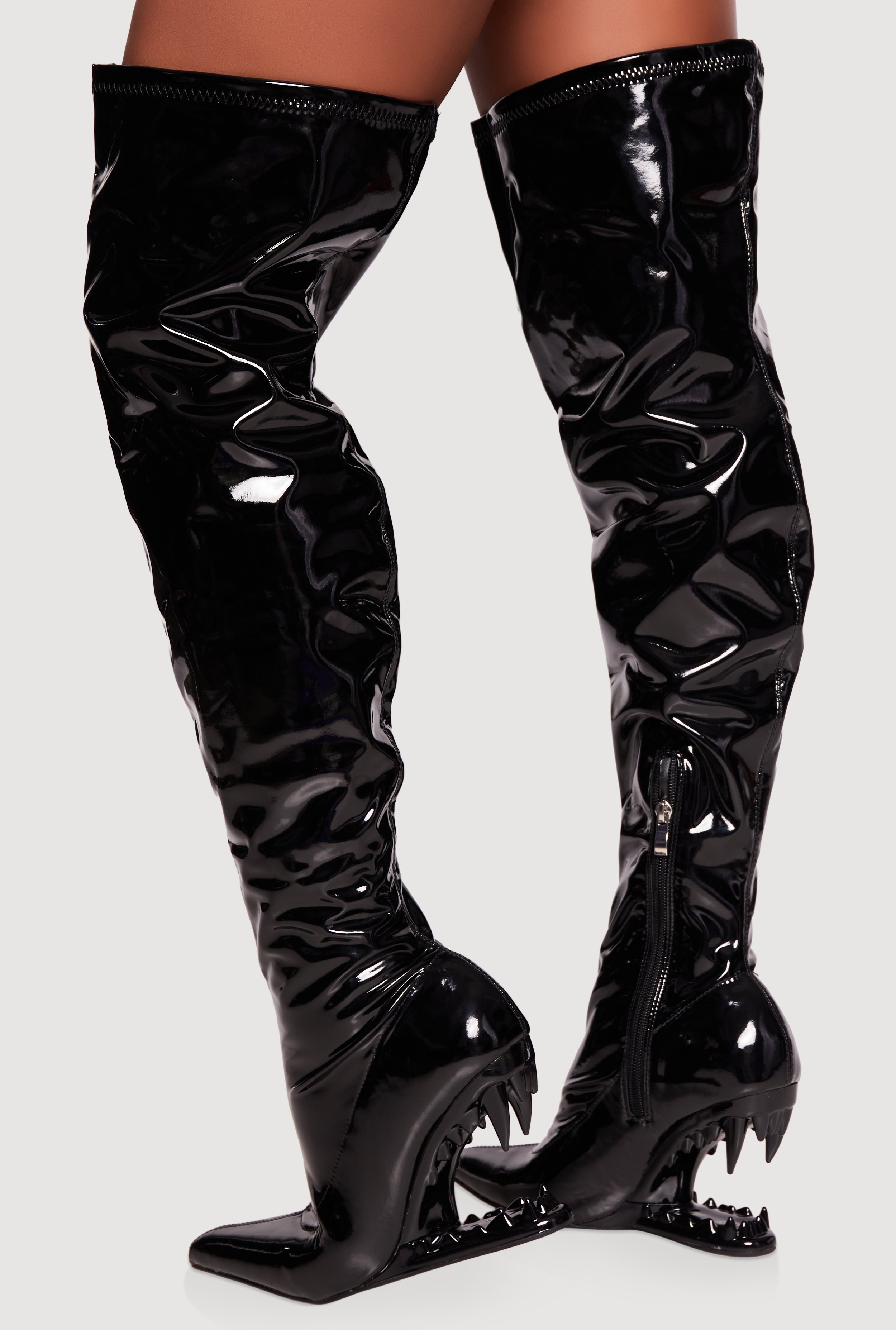 Step up your style game with the Fang Wedge Thigh High Boots, designed to turn heads and elevate any outfit. These over-the-knee boots feature a sleek pointy toe and a comfortable wedge heel that adds height without sacrificing stability. Crafted with a regular-width sock-style shaft, they hug your legs perfectly for a flattering silhouette that’s both bold and chic. Whether you're dressing up for a night out or adding edge to your everyday look, these boots are the ultimate statement piece.