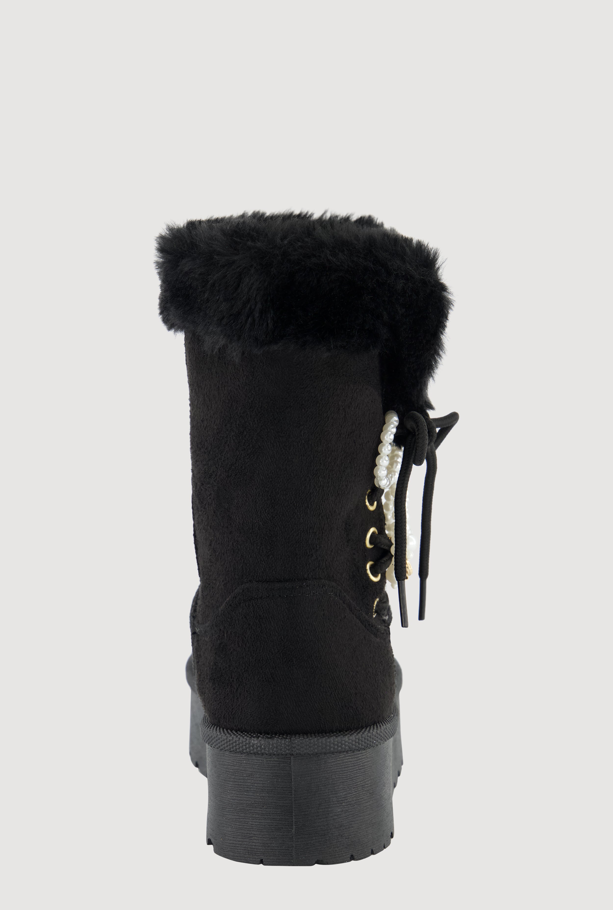 Step up your shoe game with these Faux Fur Lined Platform Booties featuring a chic faux pearl bow. Perfect for adding a cozy yet stylish touch to your winter wardrobe, these ankle-high boots combine comfort and flair with their plush lining and trendy platform heel. Whether you're heading out for a casual day or a night on the town, these booties bring a playful edge with their delicate embellishments and round toe design.