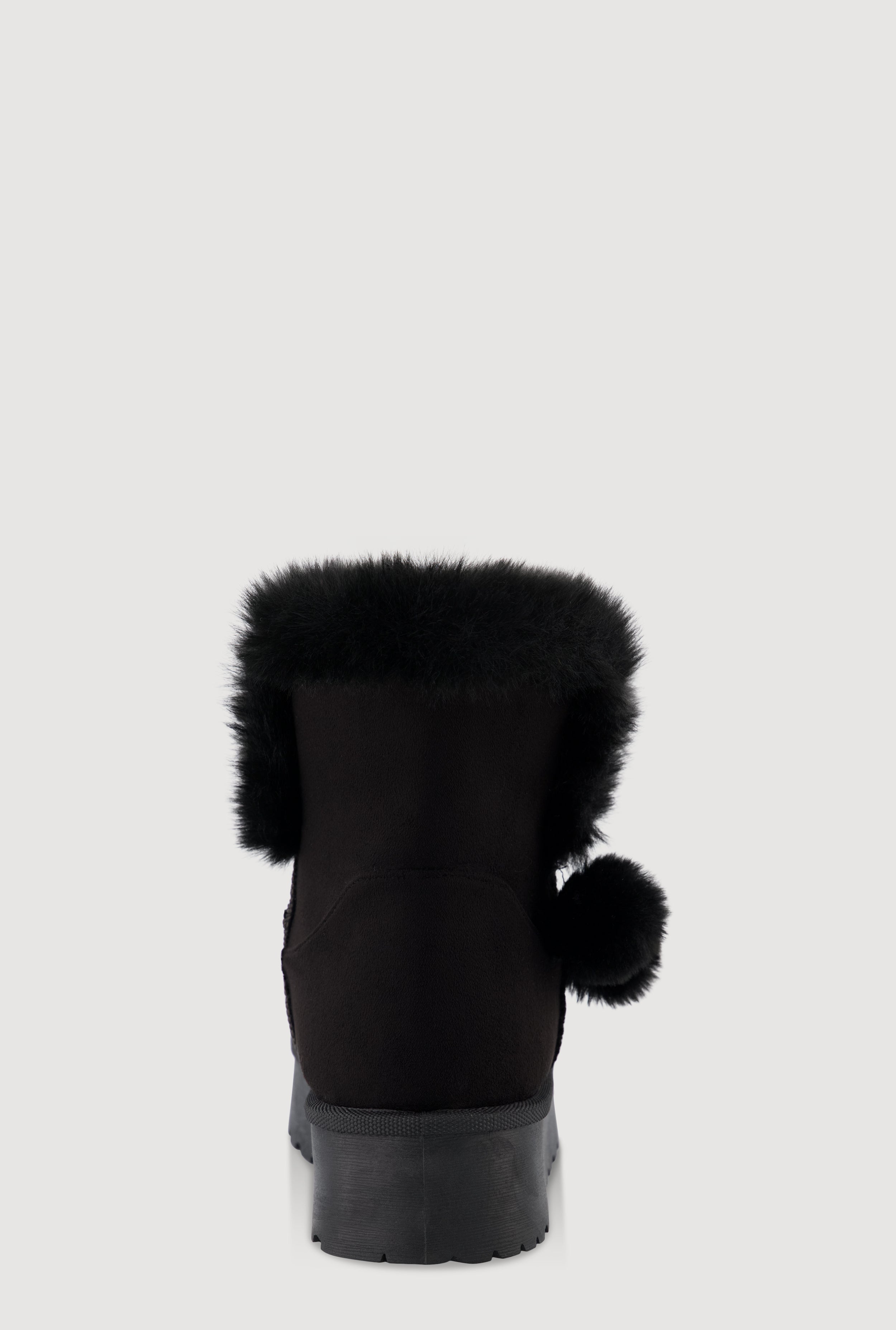 • Faux Suede Platform Booties with Faux Fur Pom Poms