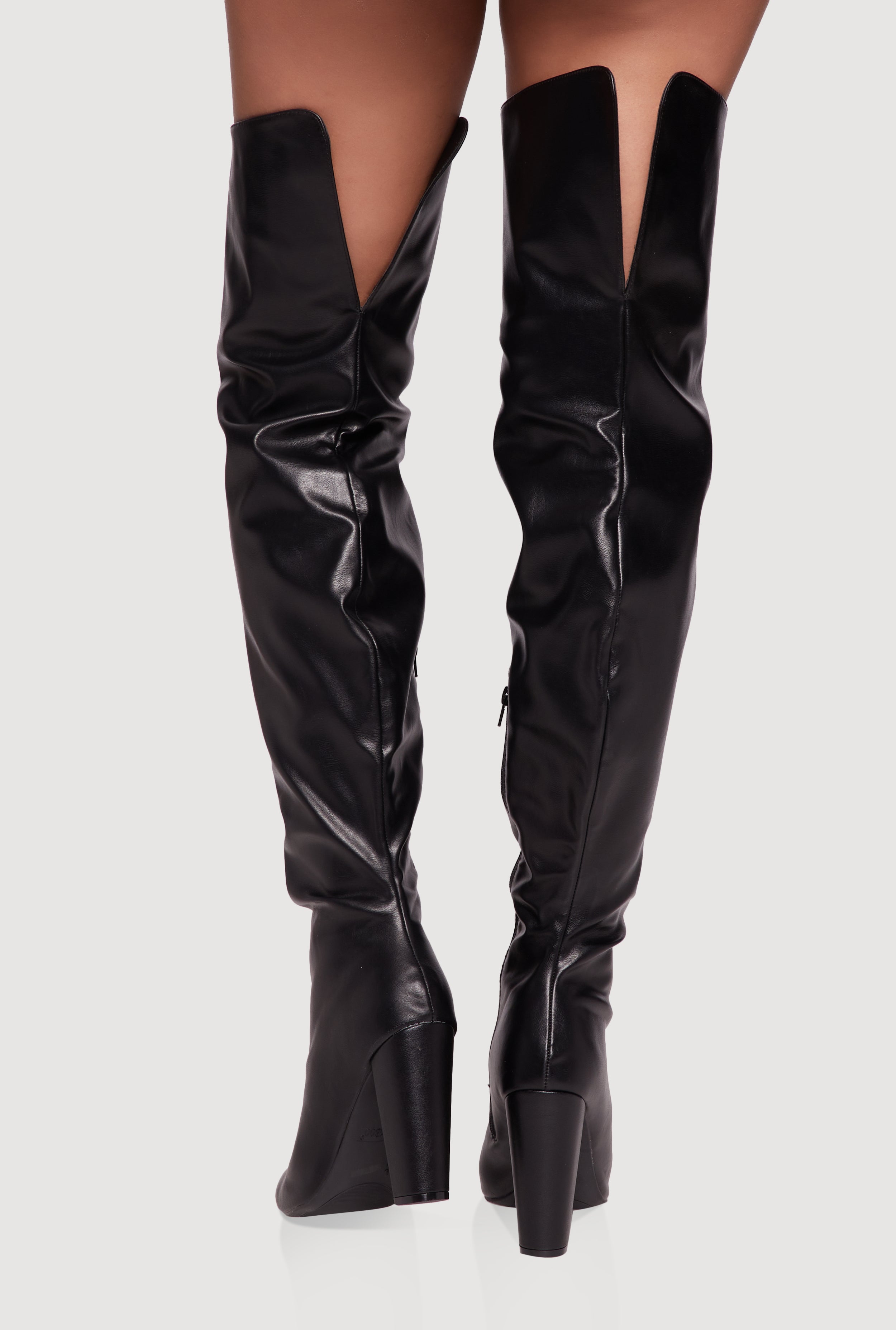 Step up your style game with these Thigh High Pointed Toe Block Heel Boots. Designed to turn heads, these sleek over-the-knee boots combine a sharp pointed toe with an ultra high block heel for the perfect mix of edgy and elegant. The slit back detail adds a subtle twist that keeps your look fresh and fierce. Whether you're hitting the city streets or dressing up for a night out, these boots are your go-to for instant confidence and major style points.