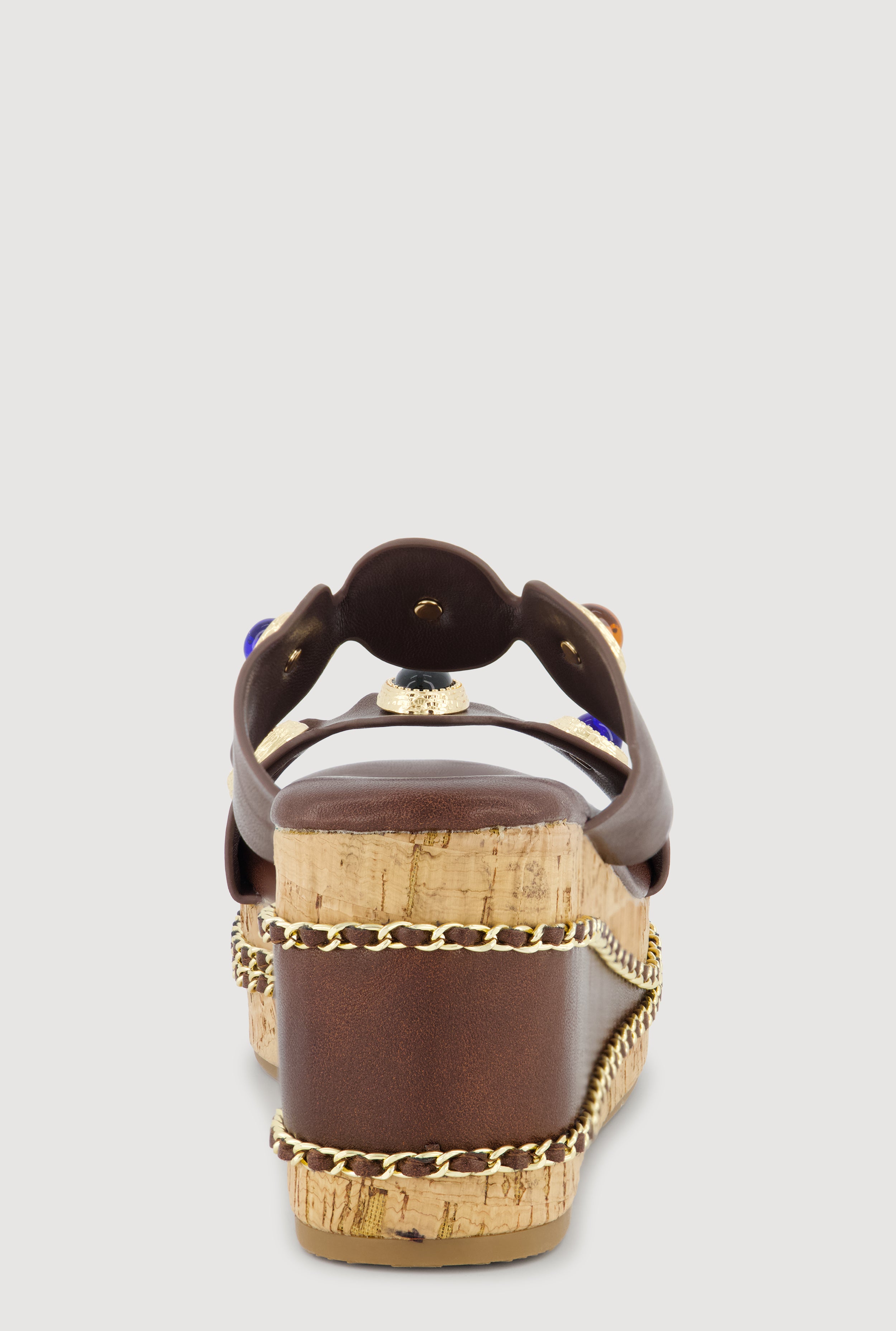Step up your summer style with the Charm Double Band Threaded Chain Detail Wedges. These open-toe sandals bring a fresh twist to your warm-weather wardrobe with their eye-catching double bands and trendy threaded chain accents. The cork sole and platform wedge give you a comfortable lift while keeping it casual and cool. Perfect for brunch dates, beach strolls, or dancing the night away, these wedges combine fashion and function effortlessly.