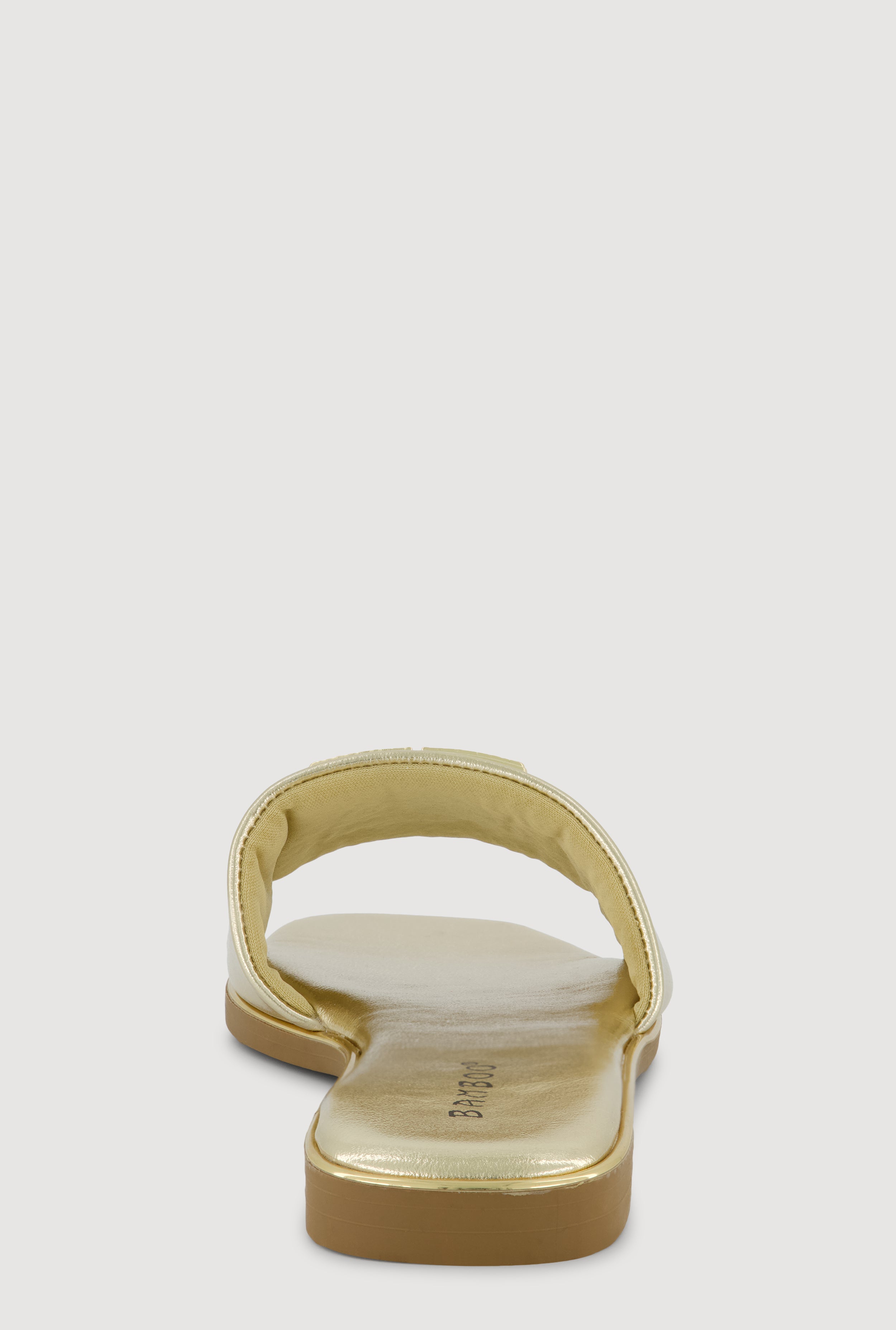 These flat slide sandals feature a sleek open toe design with a wide band accented by a geometric pendant for a modern touch. The cushioned footbed and low-profile sole provide easy wear, making them a versatile choice to elevate casual and dressy looks alike.