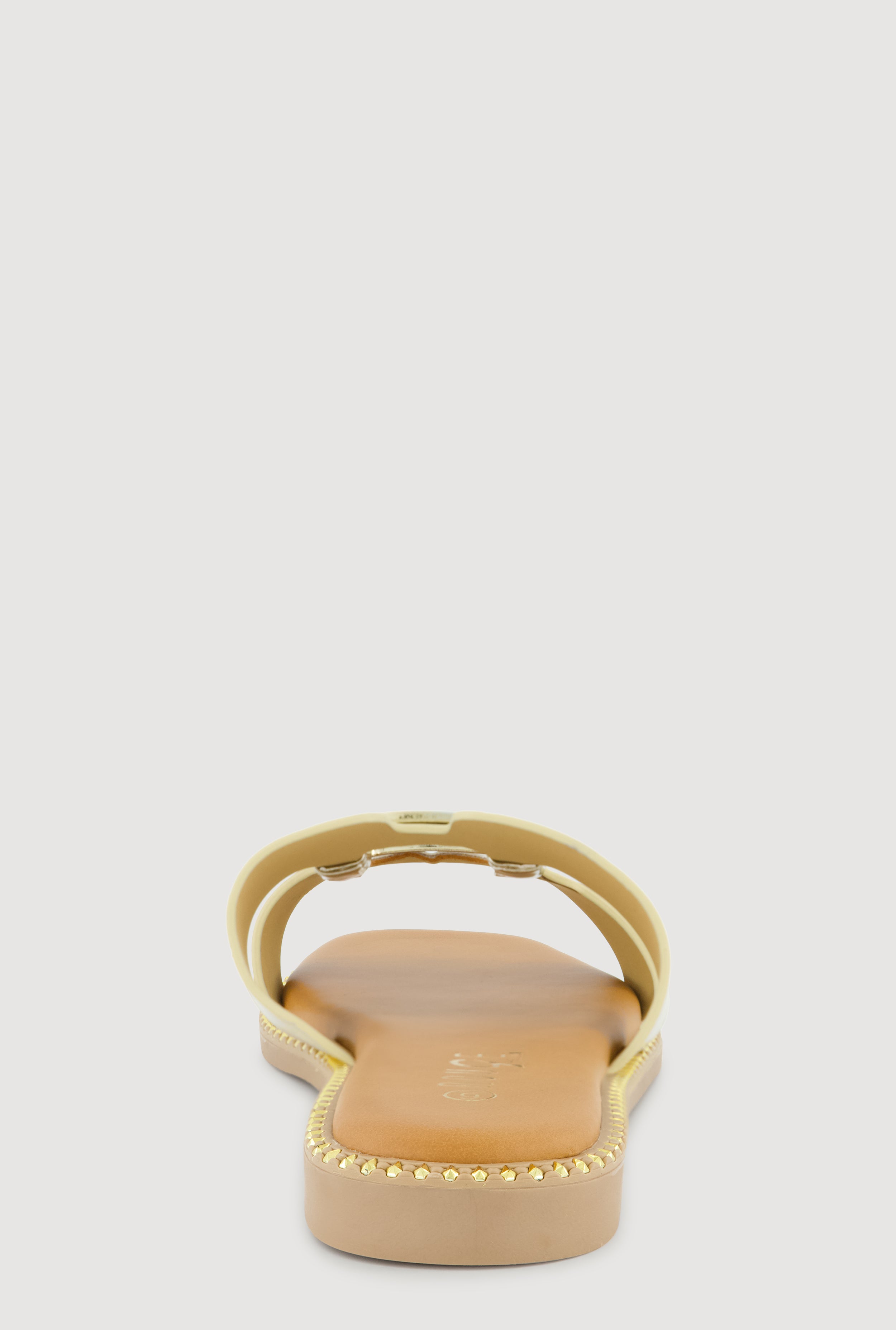 Step into effortless style with these Metallic Cut Out H Band Slide Sandals. Perfect for sunny days and casual outings, these slides combine a sleek metallic finish with trendy studded trim details that add just the right amount of edge to your look. The open-toe design keeps your feet cool while the flat heel ensures all-day comfort. Whether you're hitting the beach or the city streets, these sandals are a must-have for adding a touch of sparkle to your everyday outfits.