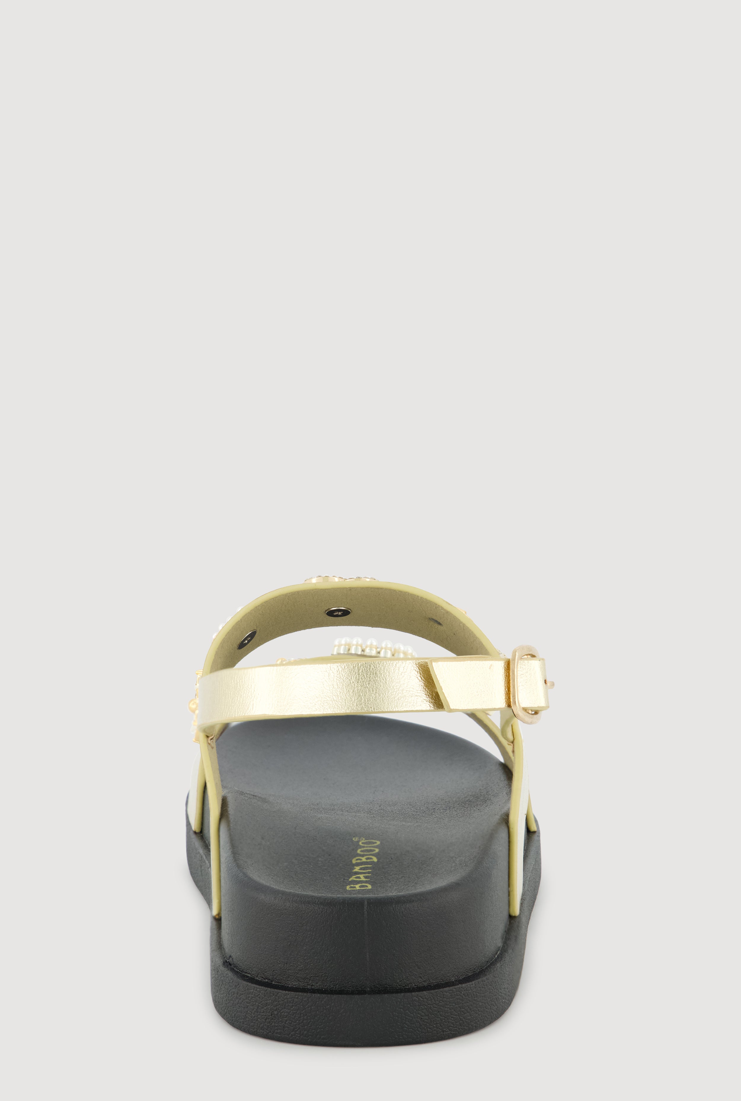 Step into effortless style with these Metallic Faux Pearl Charmed Double Strap Footbed Sandals. Designed for those who love a touch of glam without sacrificing comfort, these sandals feature a trendy platform flat heel and open toe for all-day wear. The double straps are adorned with faux pearls and metallic accents that catch the light and elevate any outfit. Perfect for beach days, casual hangouts, or adding a chic twist to your everyday look.
