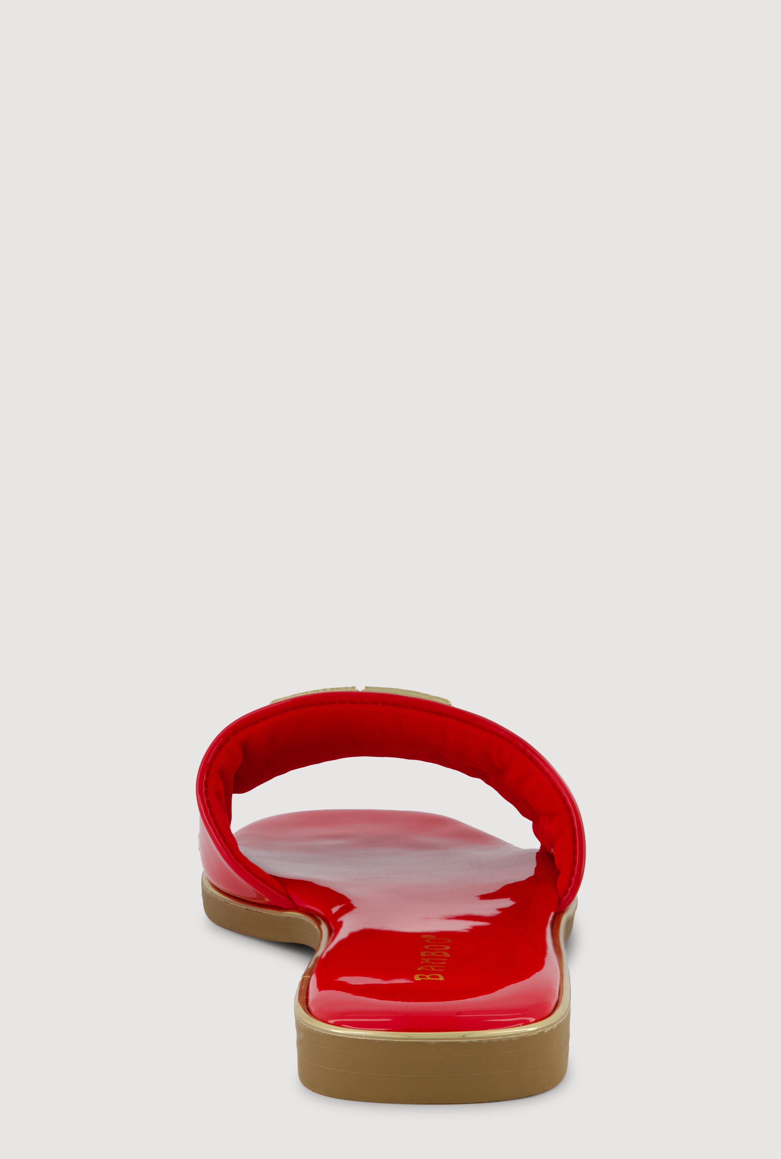 These flat slide sandals feature a sleek open toe design with a wide band accented by a geometric pendant for a modern touch. The cushioned footbed and low-profile sole provide easy wear, making them a versatile choice to elevate casual and dressy looks alike.