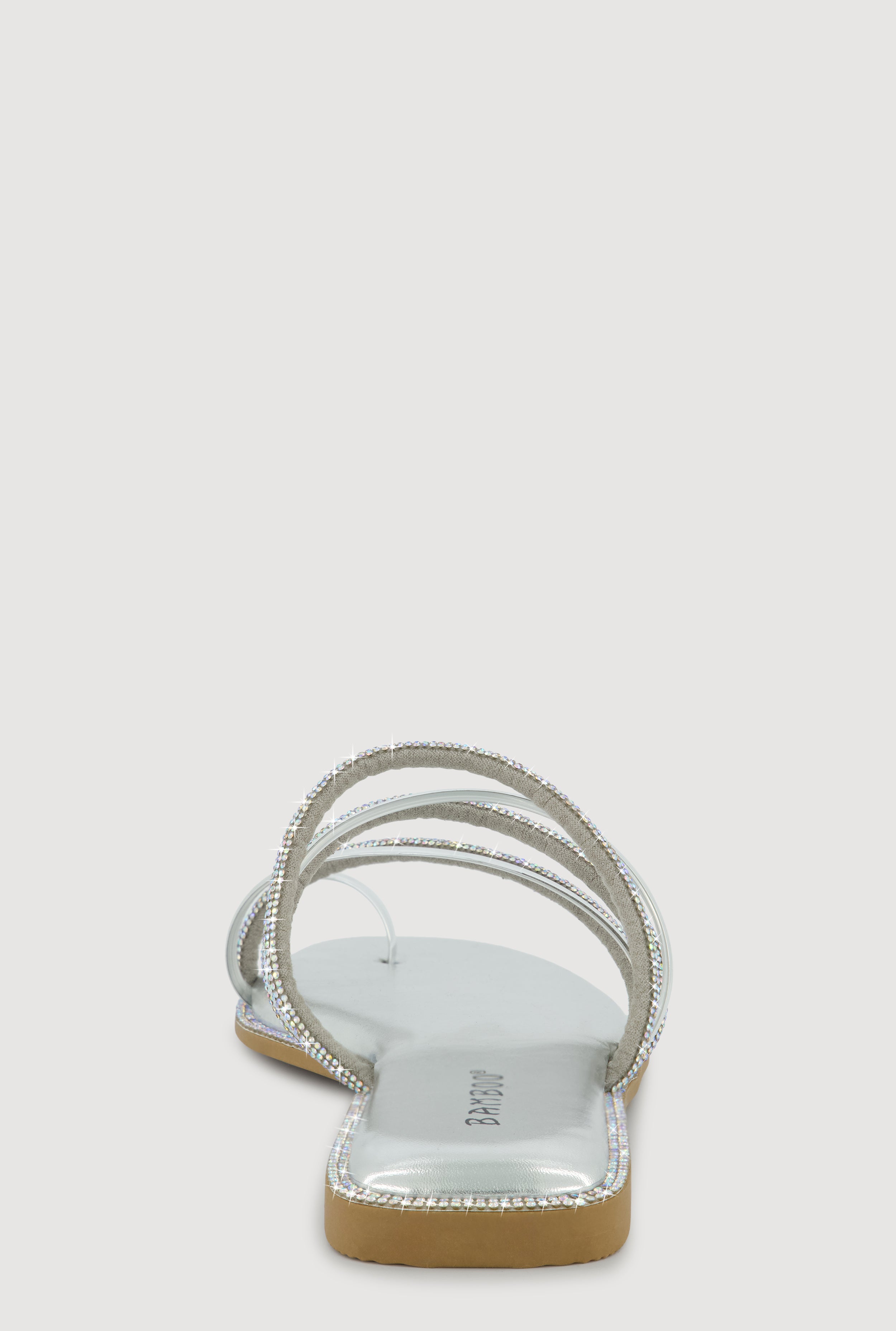 Step into sparkle with these Asymmetrical Metallic Rhinestone Strappy Toe Loop Sandals. Perfect for adding a touch of glam to any outfit, these sandals feature a unique asymmetrical design and dazzling rhinestones that catch the light with every step. The open toe and flat heel make them comfy enough for all-day wear, while the sleek metallic finish keeps your look fresh and trendy. Whether you're headed to a summer party or just want to elevate your everyday style, these sandals are your new go-to for effortless chic.