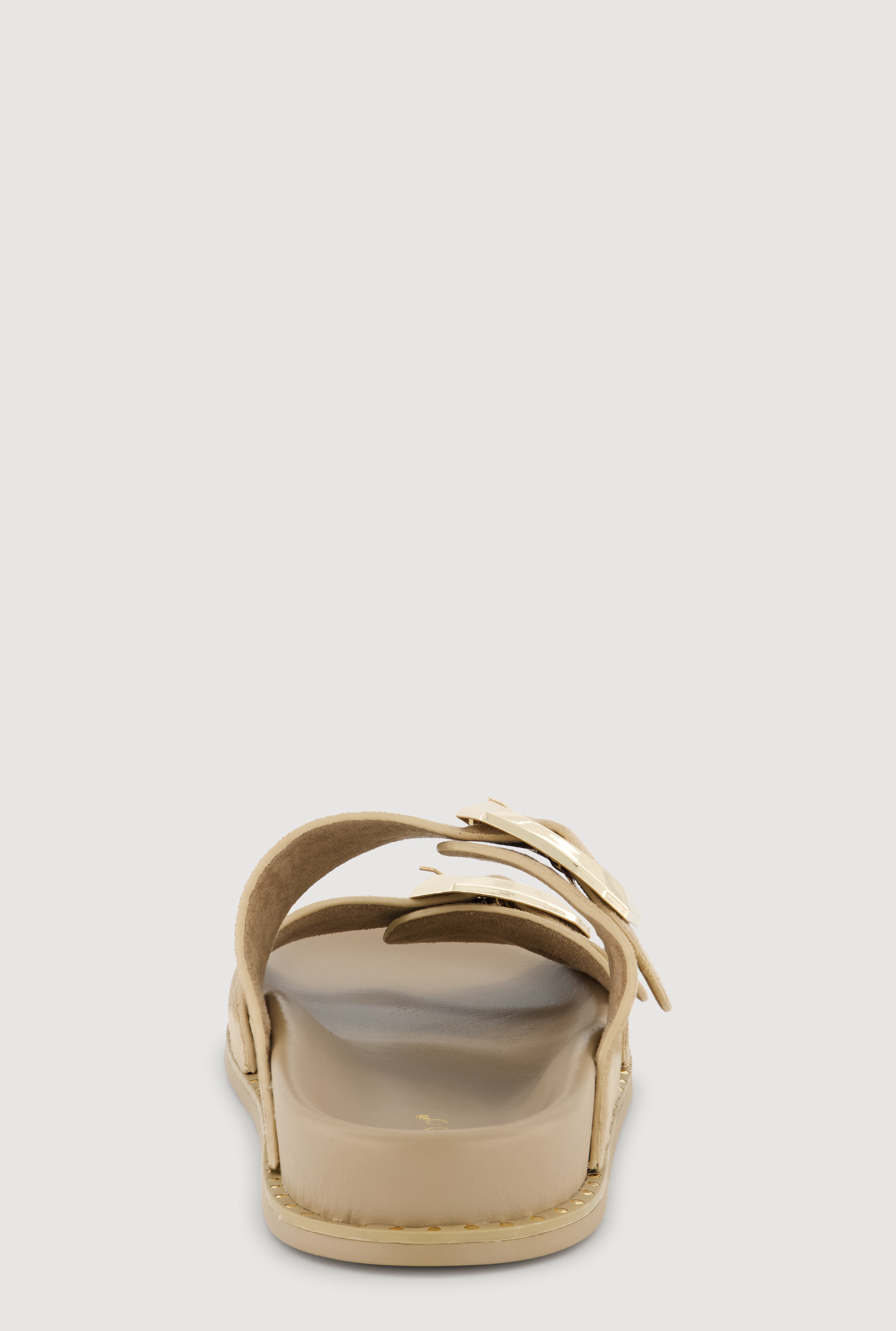 Step into effortless style with these Studded Trim Faux Suede Double Buckle Footbed Slide Sandals. Designed for those who love a mix of comfort and edge, these slides feature chic double buckles and a studded trim that adds just the right amount of attitude. The soft faux suede feels luxe without breaking the bank, while the cushioned footbed keeps your feet happy all day long. Perfect for sunny days, casual hangouts, or whenever you want to elevate your laid-back look.