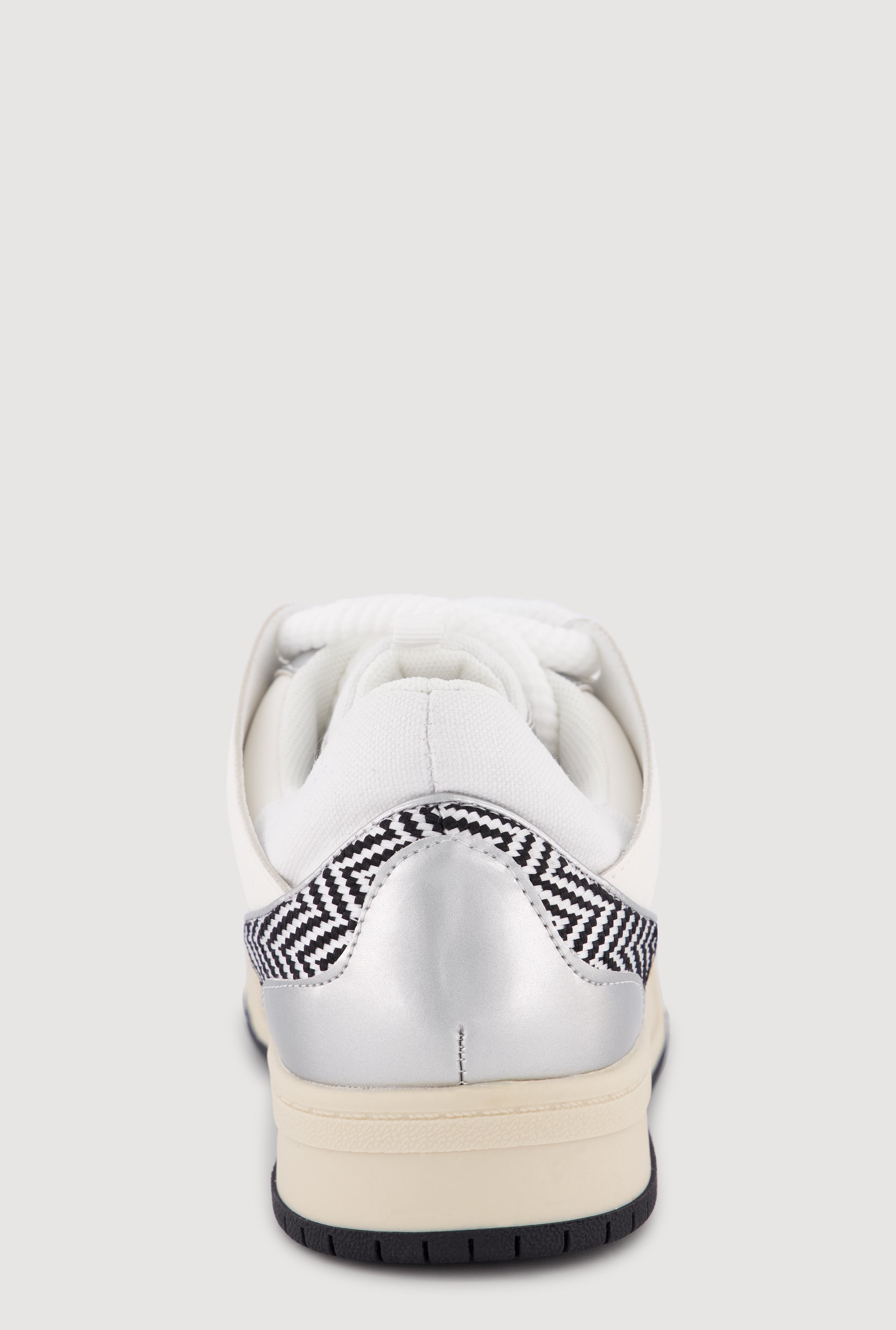 Step up your sneaker game with these Chevron Color Blocked Lace Up Sneakers. Designed for those who love a mix of style and comfort, these kicks feature a trendy chevron pattern with eye-catching color blocks that make every outfit pop. The rope lace up adds a unique twist, while the woven detail brings texture and flair. Perfect for casual days or weekend adventures, these round toe sneakers offer a low heel for easy all-day wear. Ready to turn heads and keep you moving with confidence?