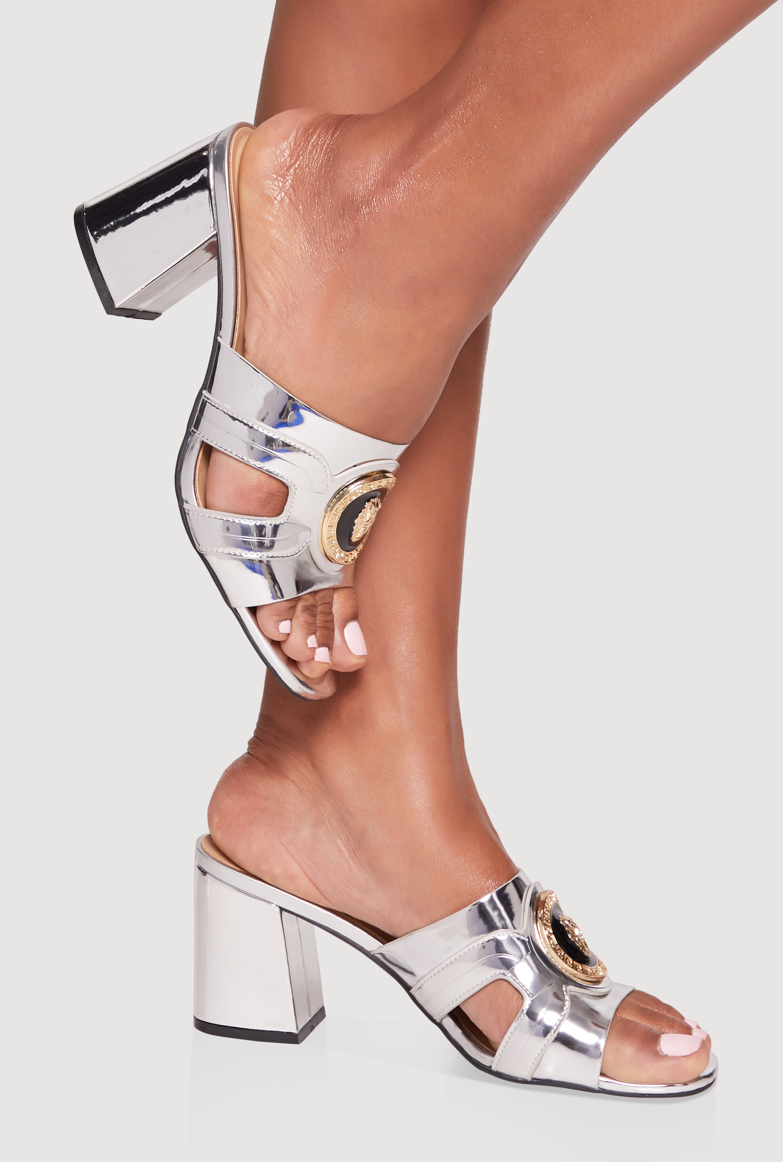 Metallic Pendant Cut Out Band Block Heel Sandals