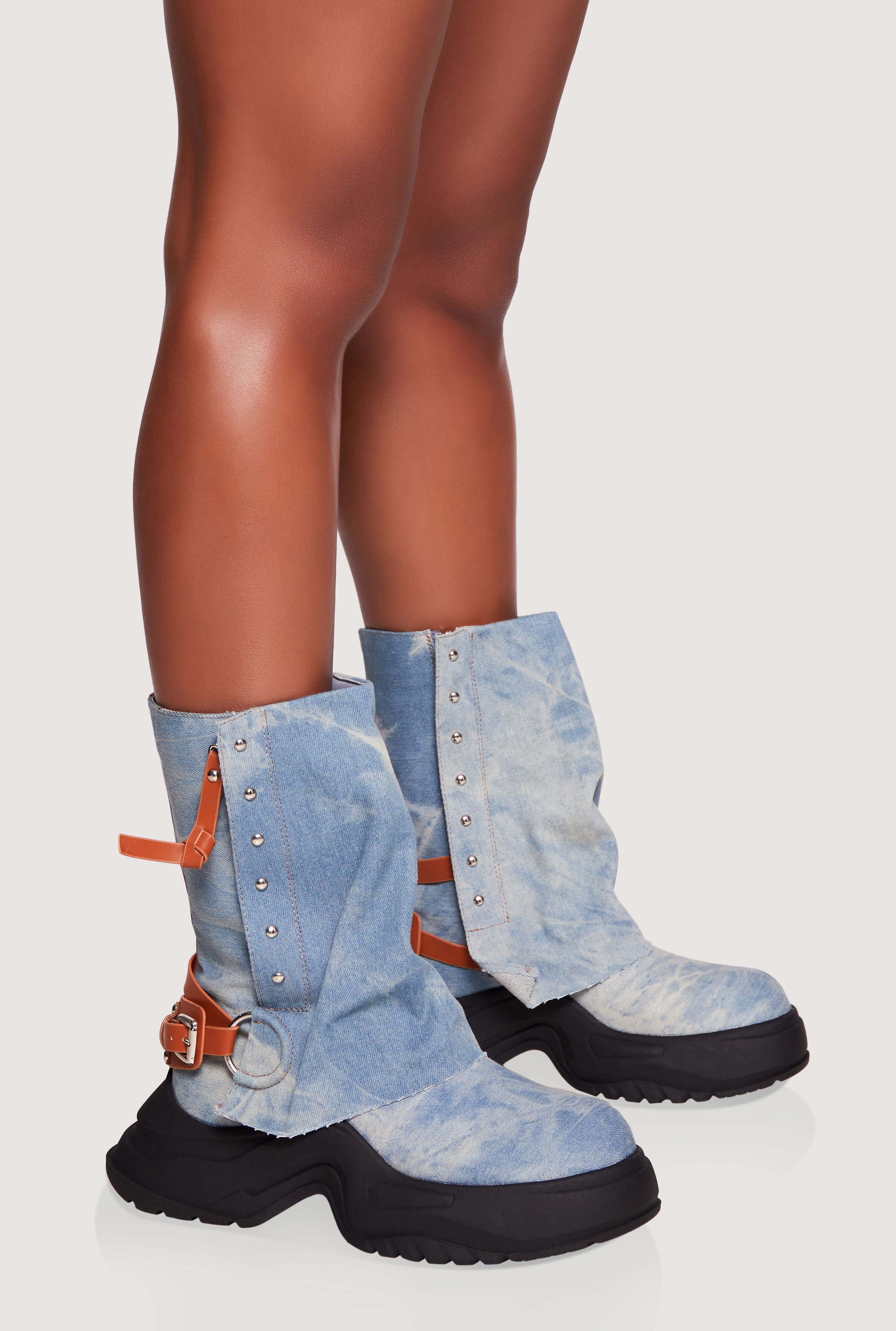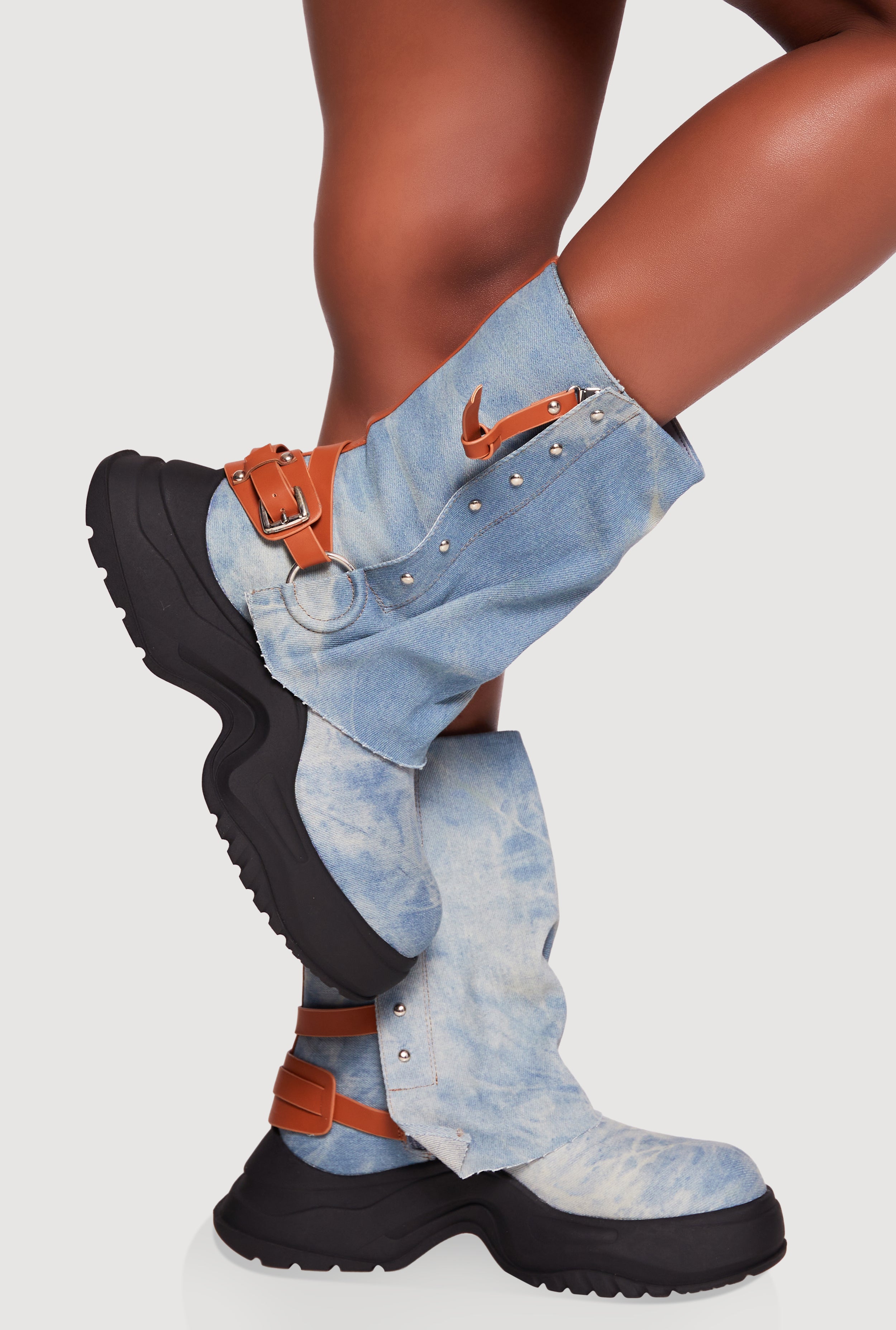 Faux Leather Ankle Strap Denim Chunky Platform Boot