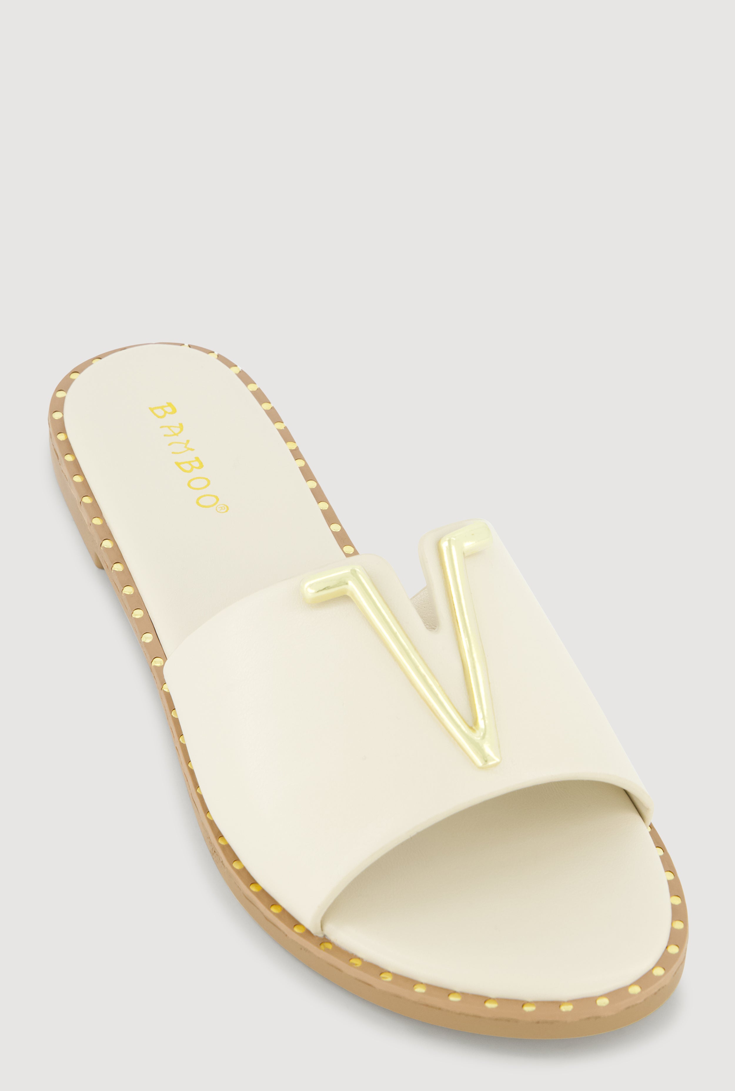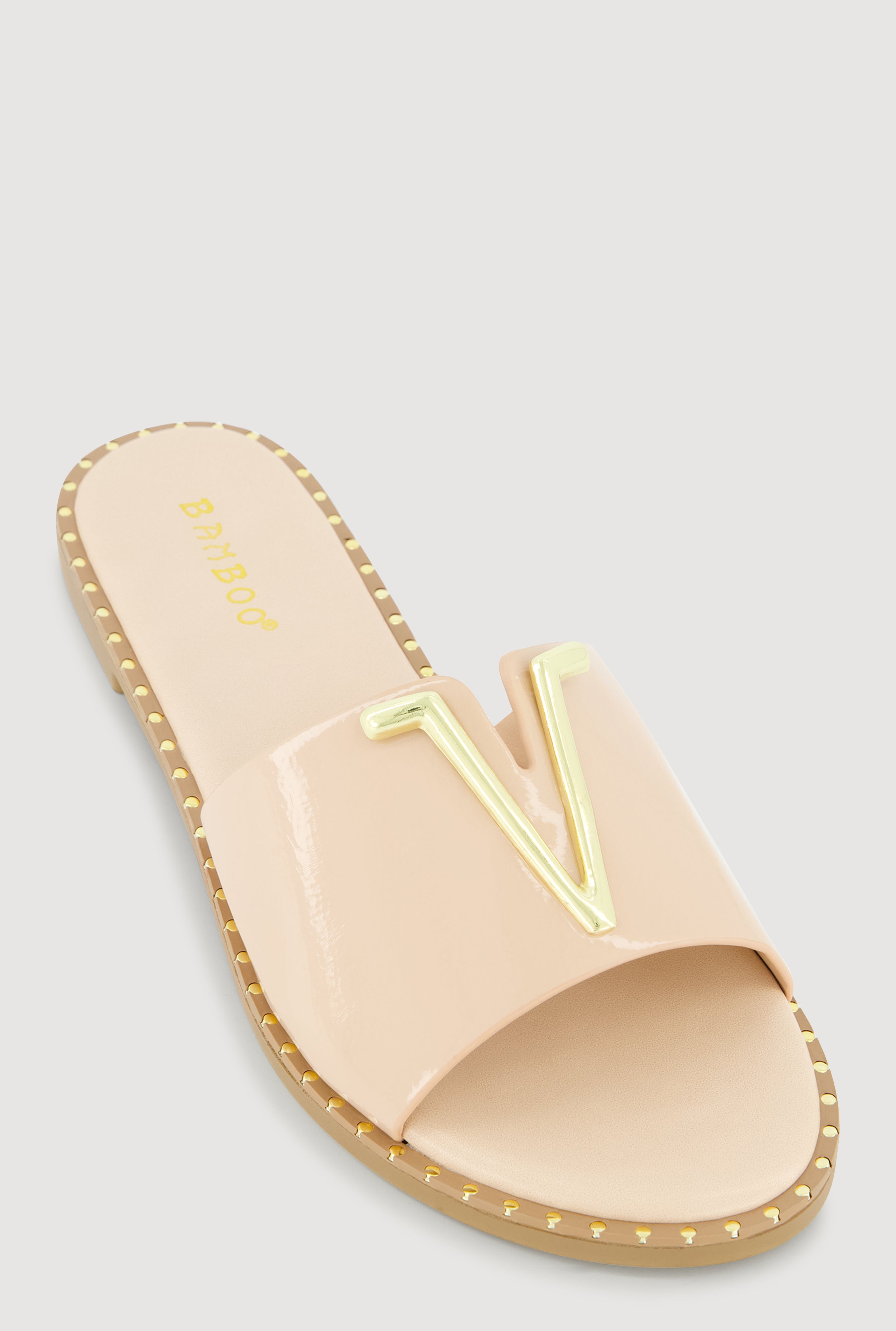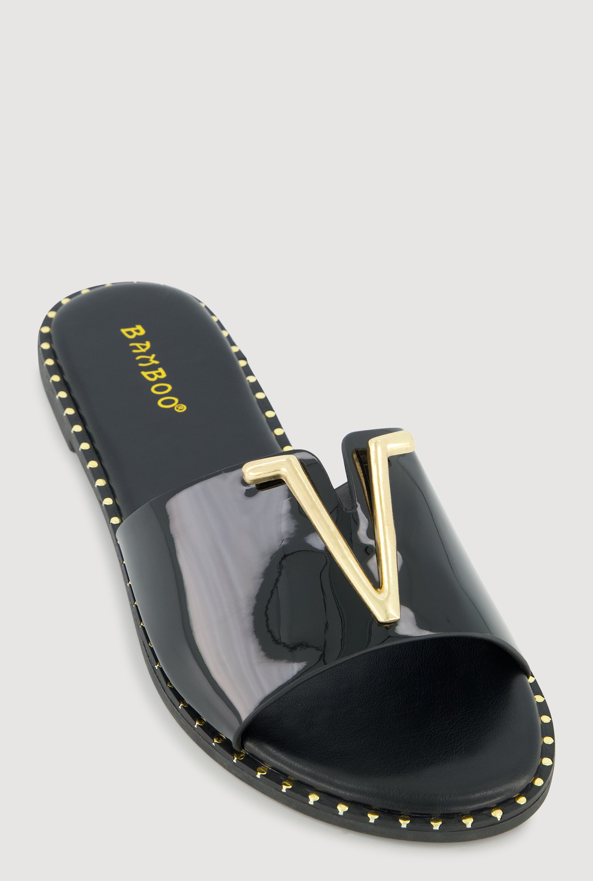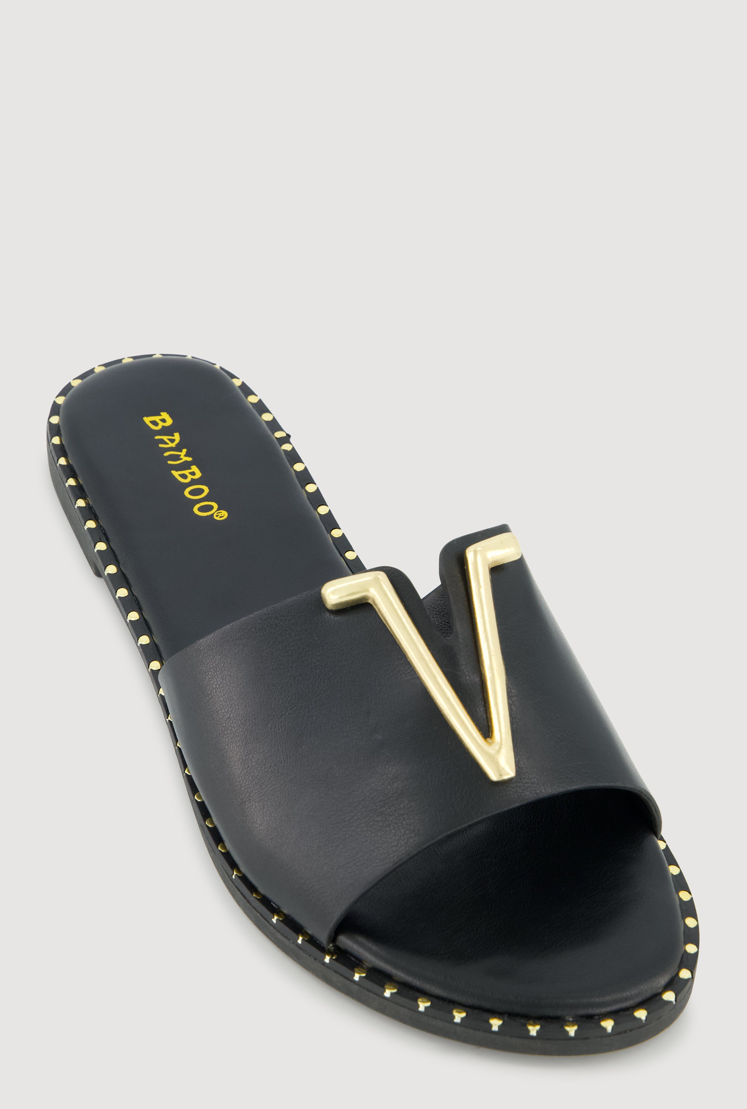 Metallic V Pendant Notched Band Slide Sandals