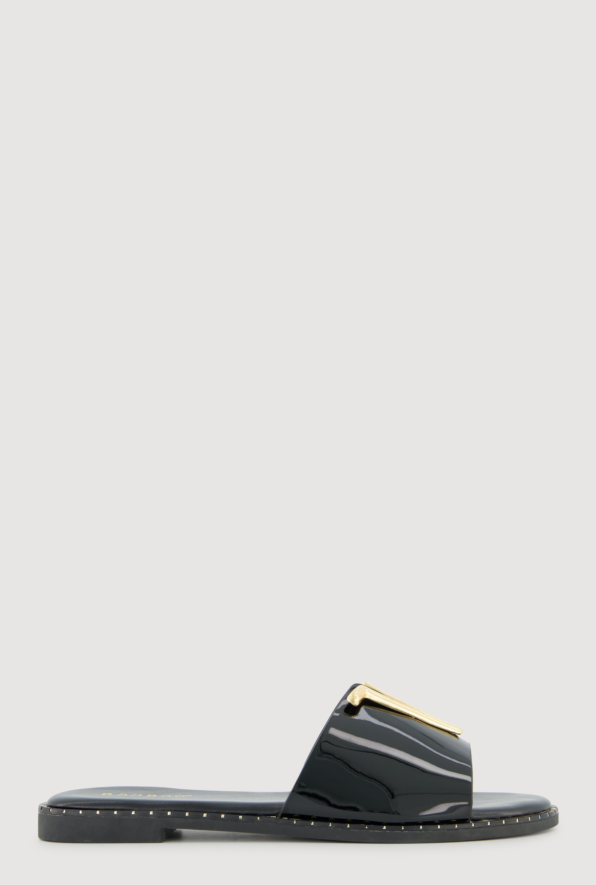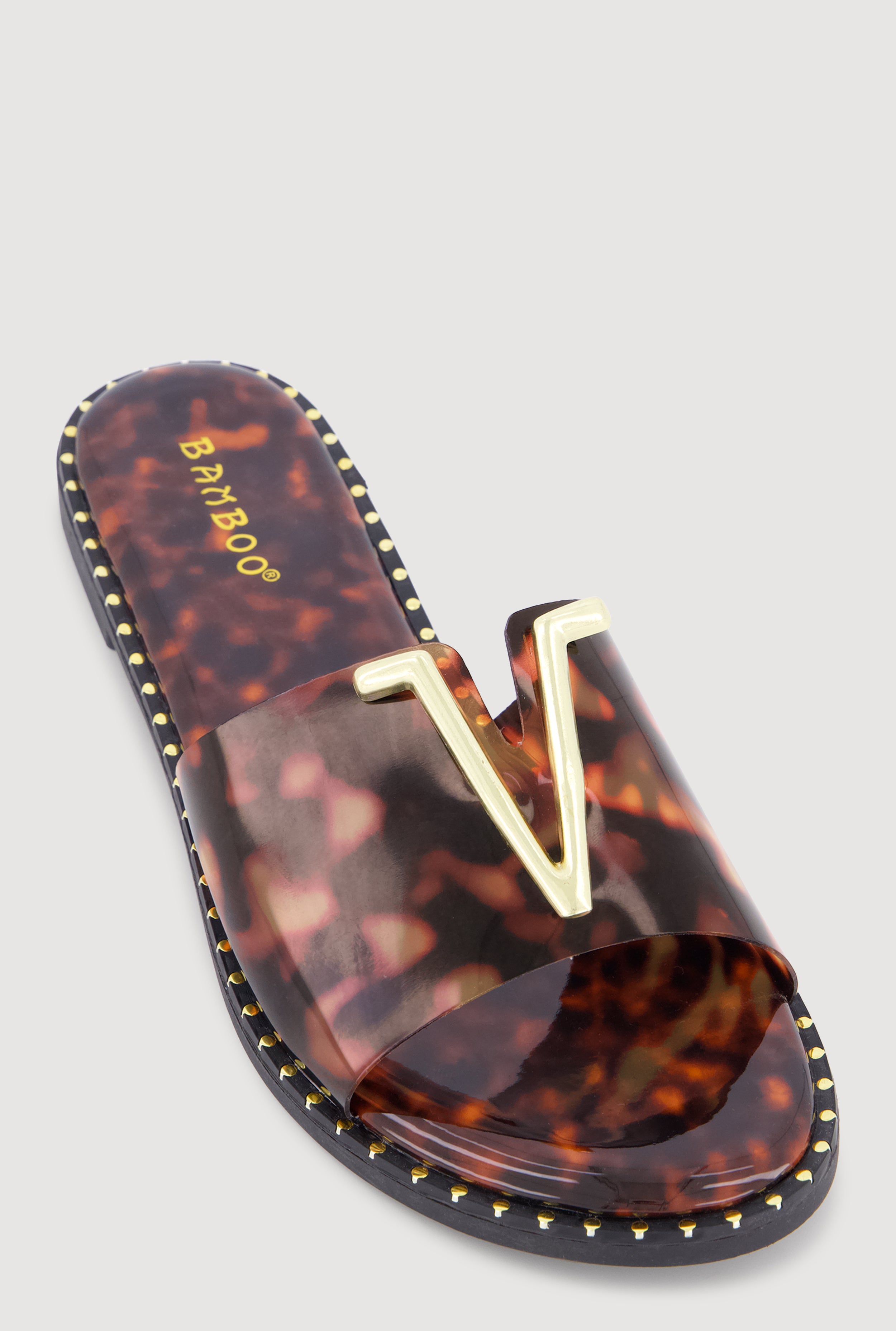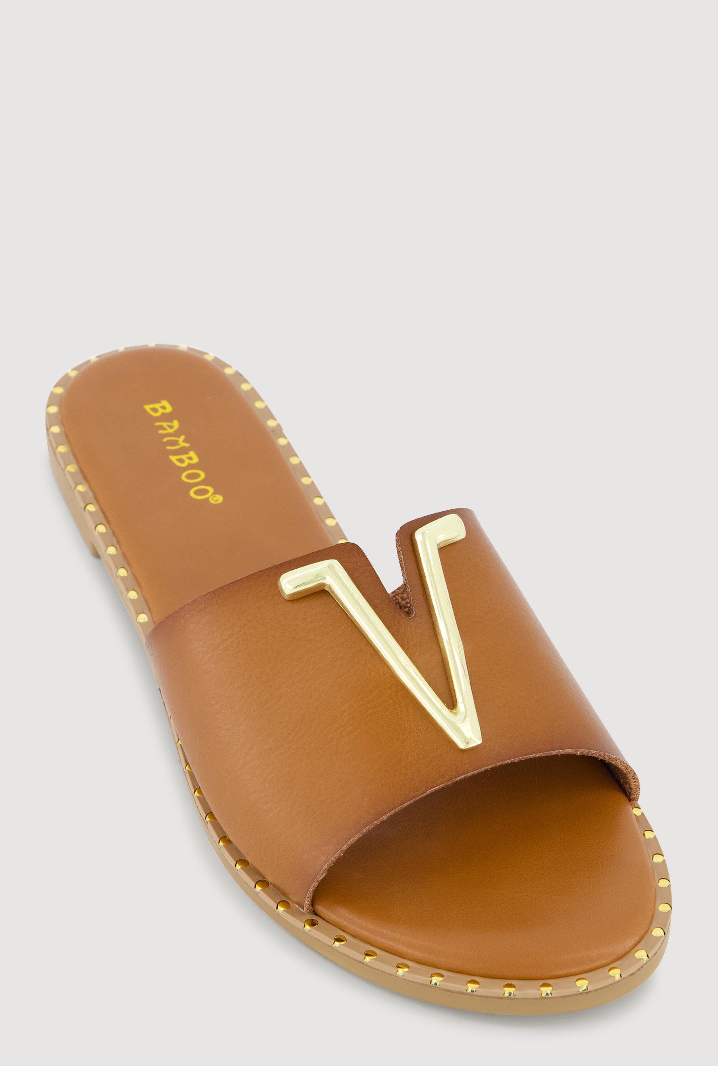Metallic V Pendant Notched Band Slide Sandals