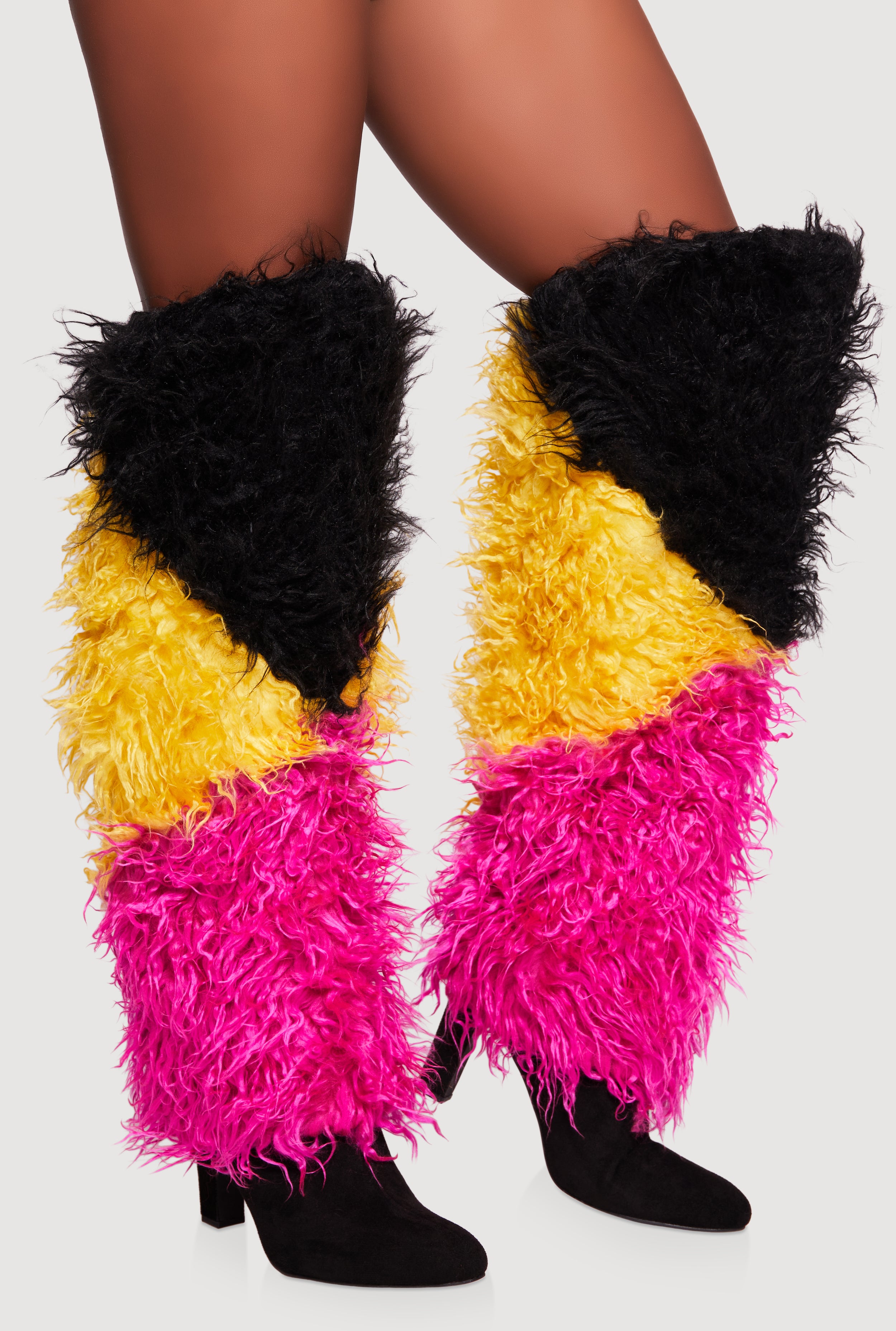 Color Blocked Shaggy Faux Fur Knee High High Heels