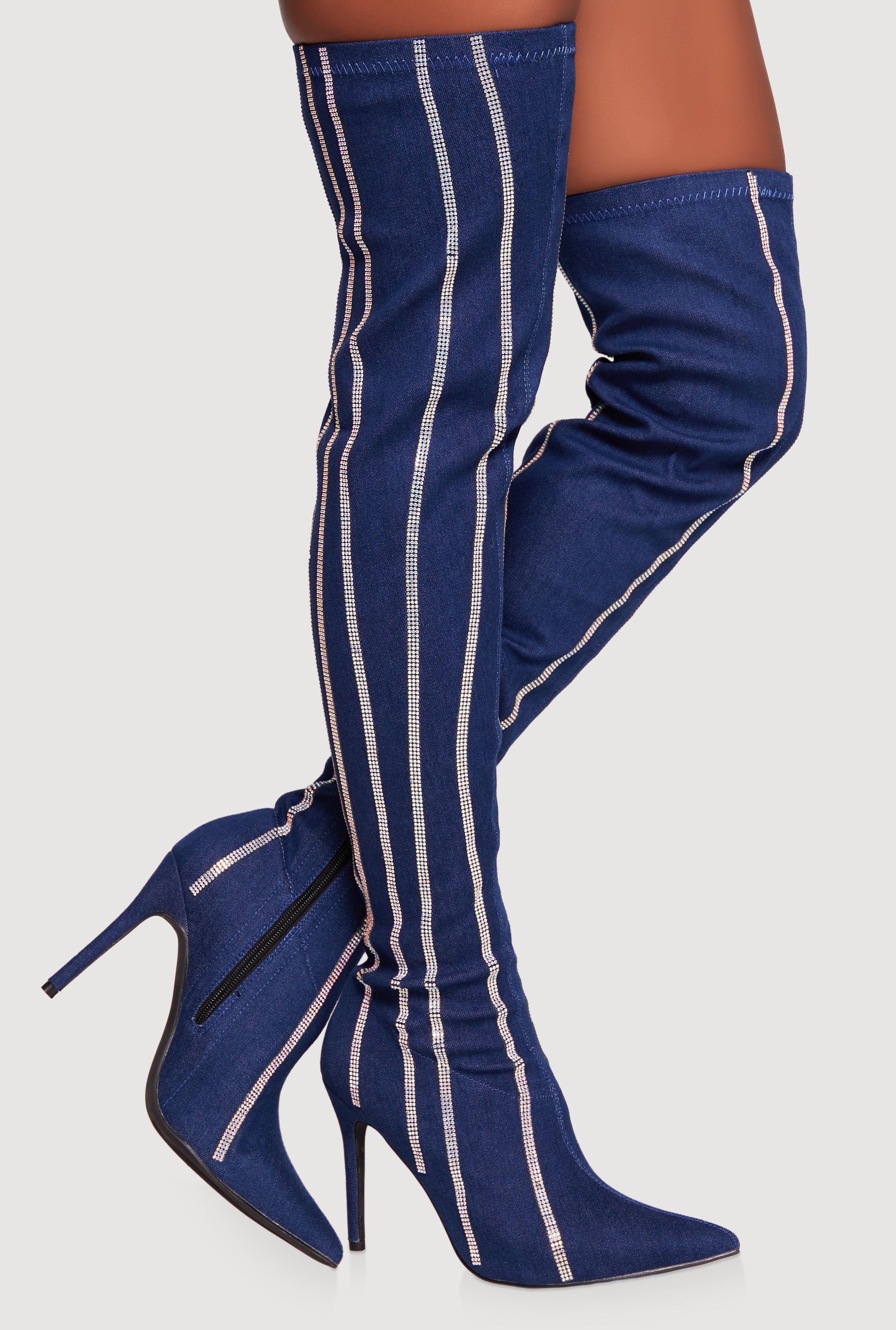 Rhinestone Striped Denim Thigh High Stiletto Boots