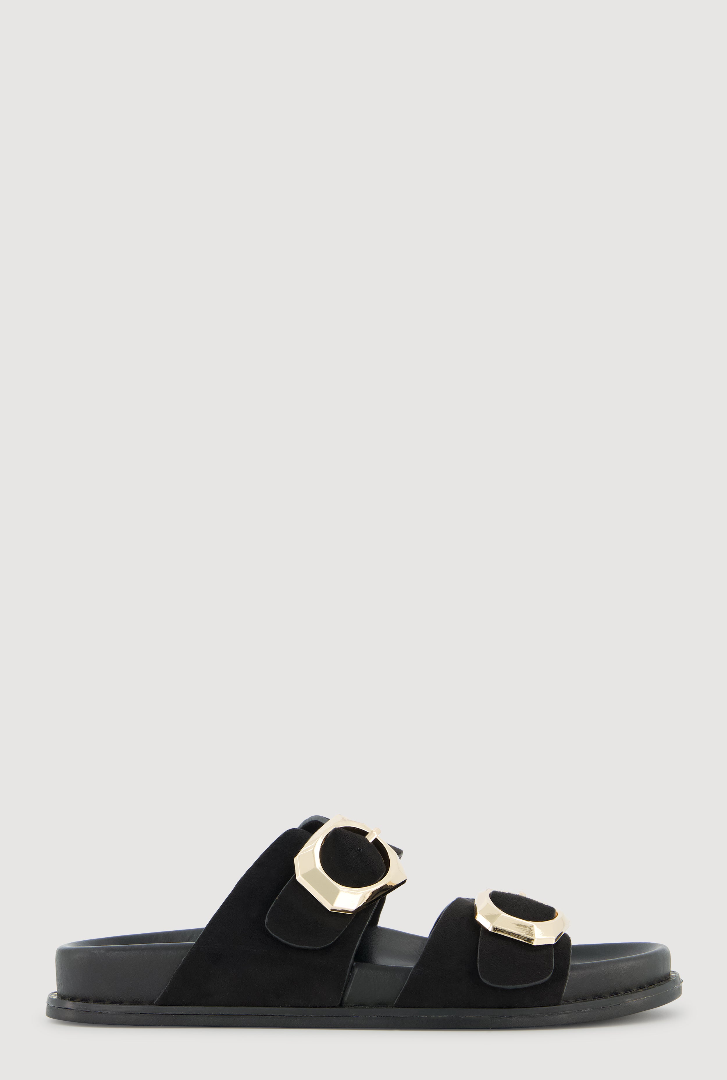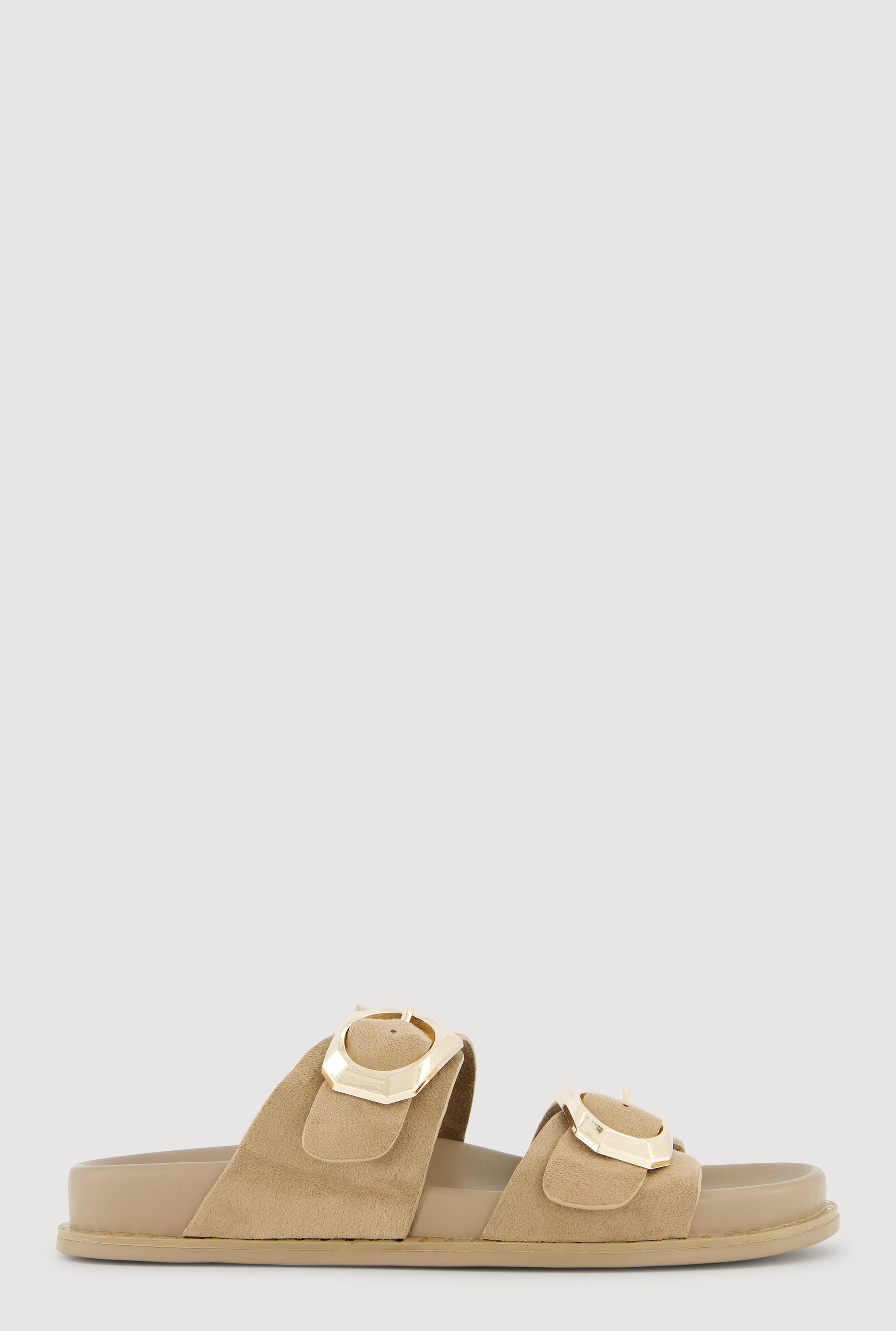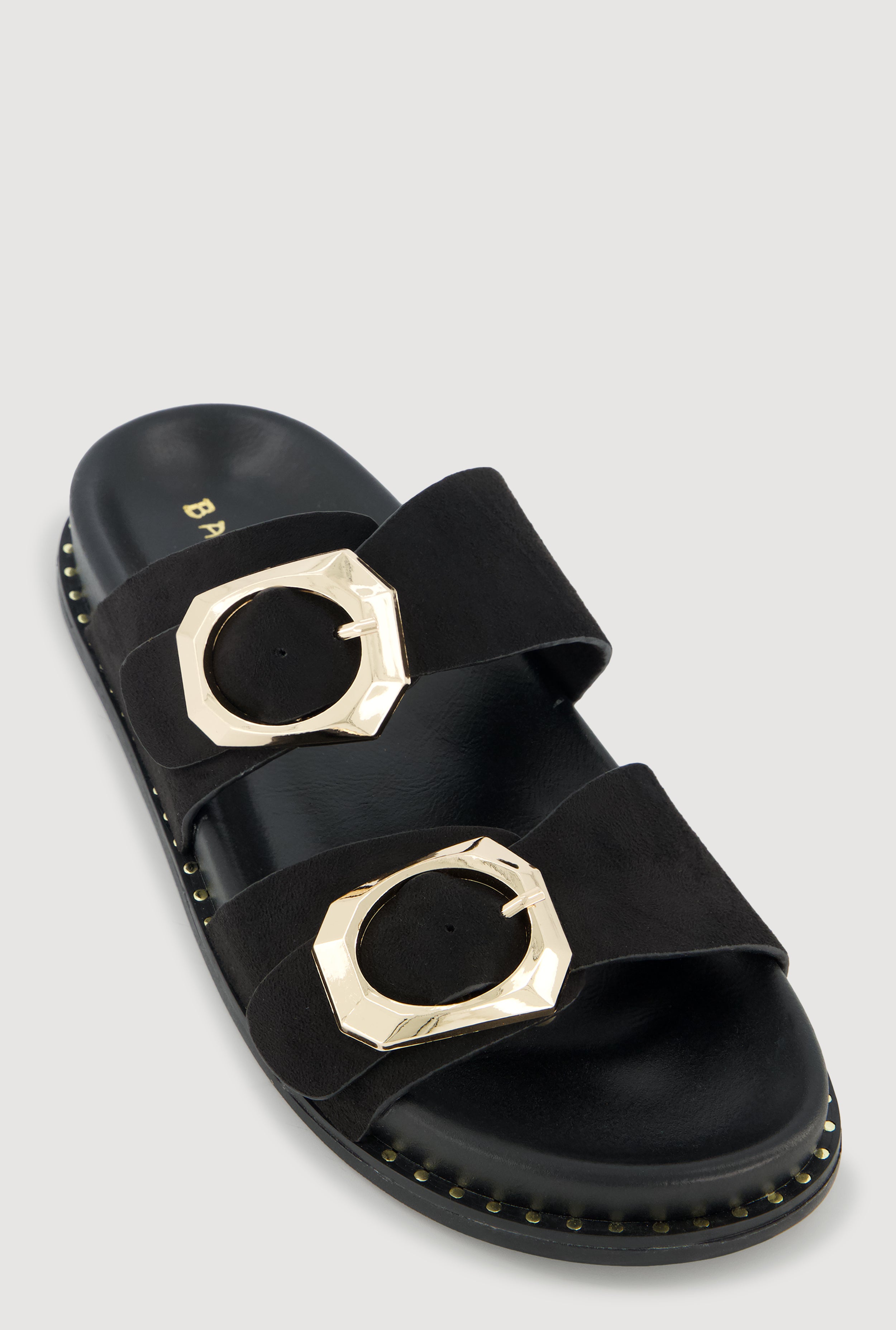 Studded Trim Faux Suede Double Buckle Footbed Slide Sandals