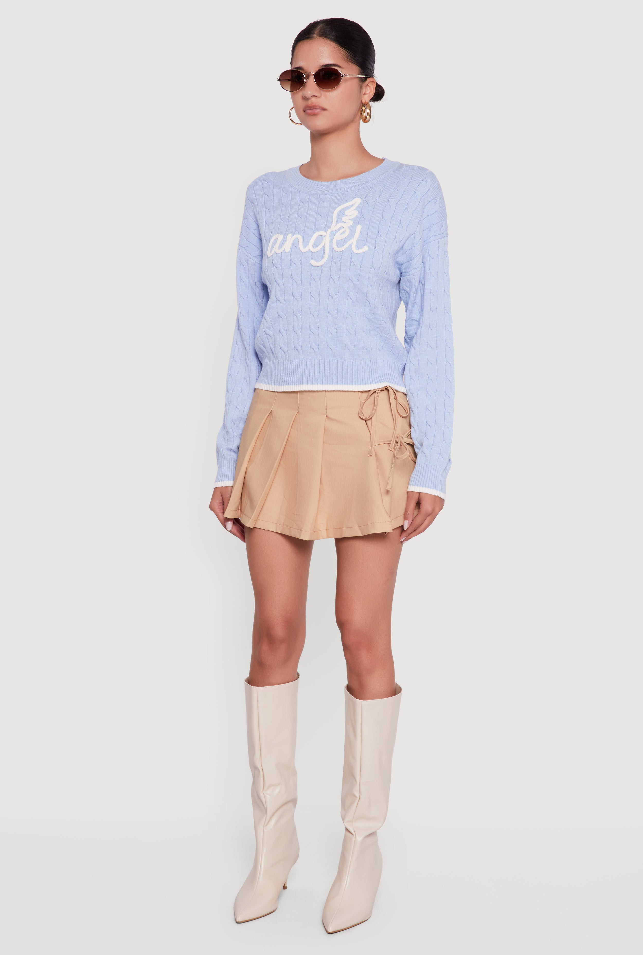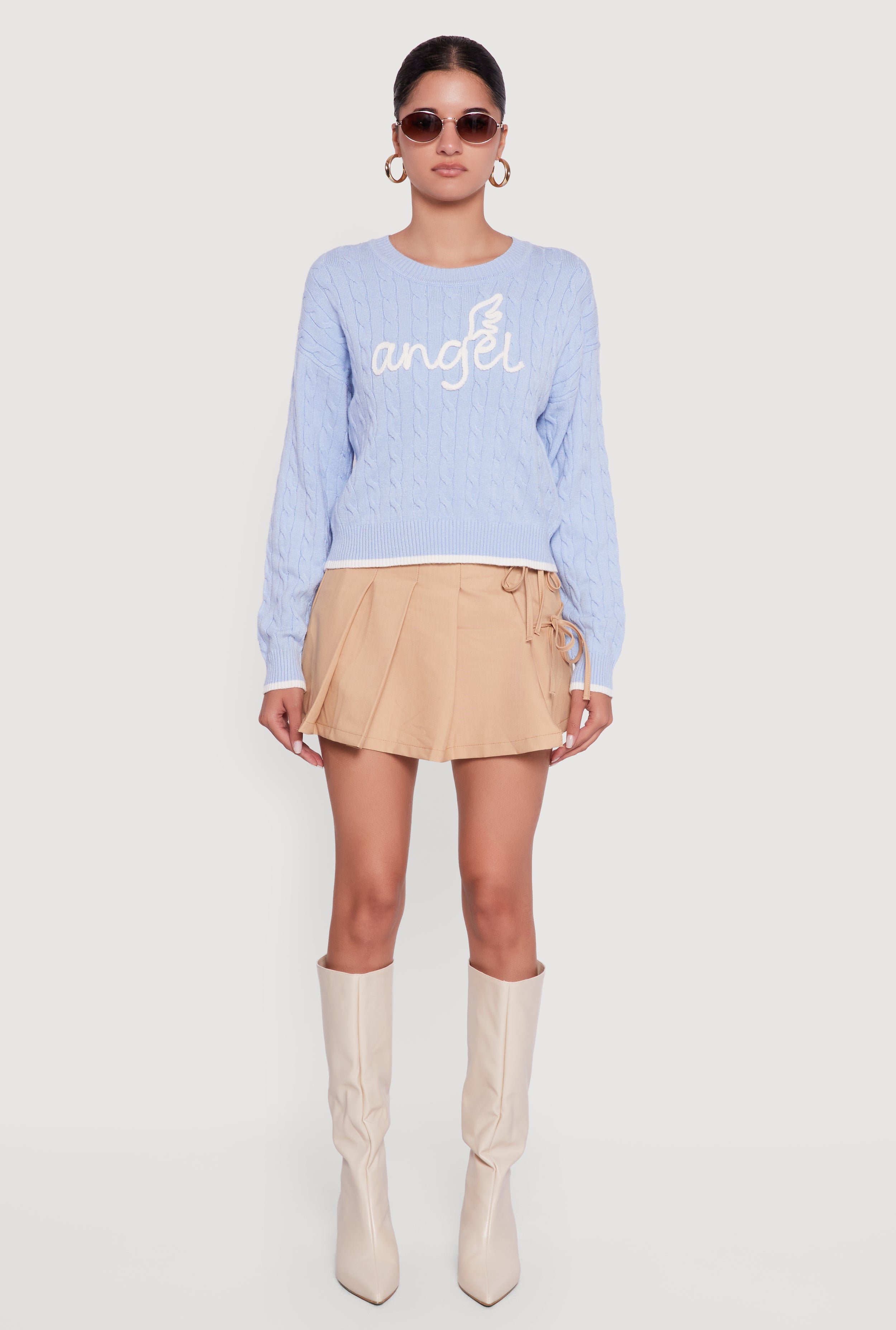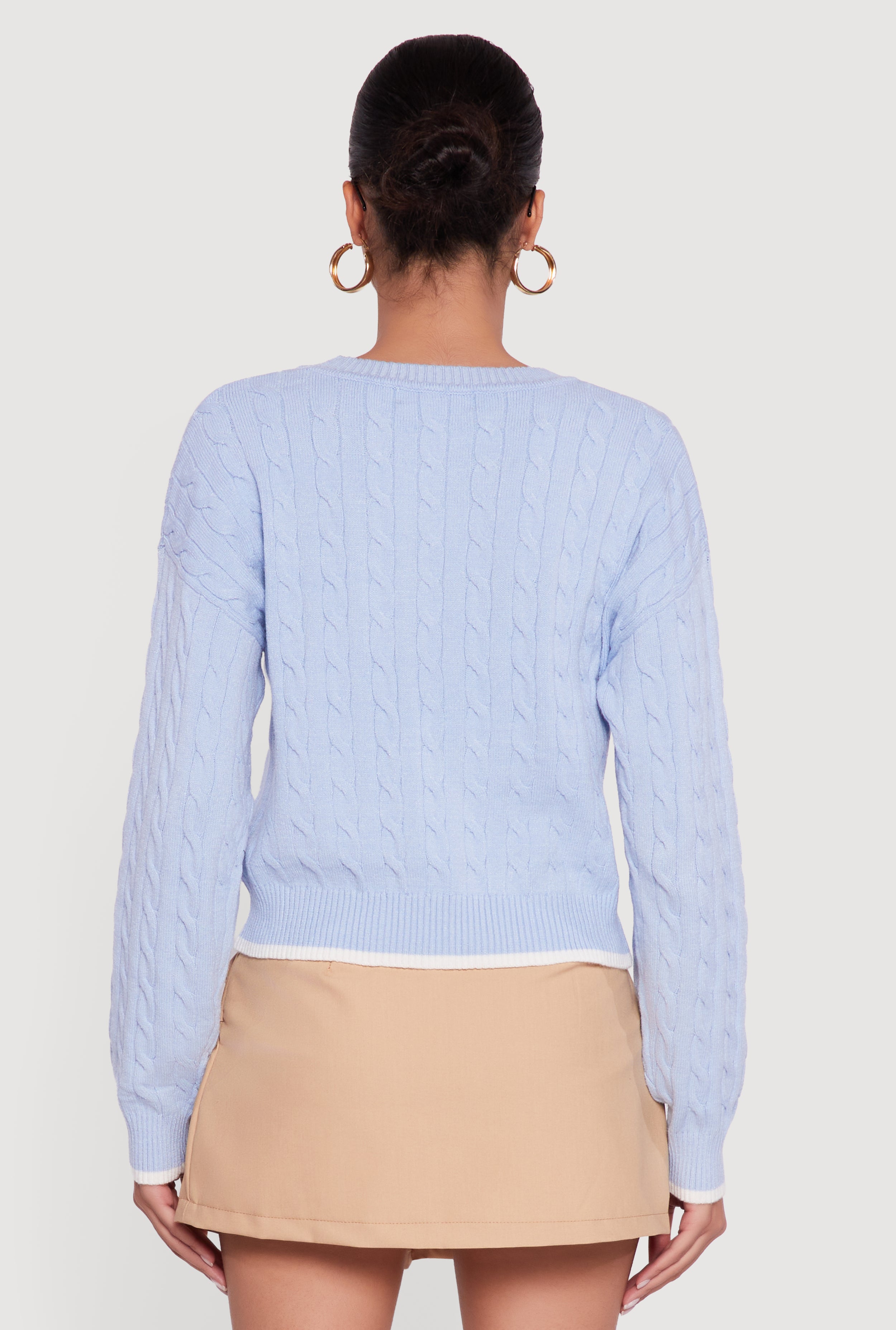 Cozy up in style with the Contrast Trim Cable Knit Angel Graphic Sweater. This classic fit sweater features a charming angel graphic and trendy contrast trim that adds just the right amount of edge to your casual look. With a comfortable crew neck and blouson long sleeves, it’s perfect for layering or wearing solo on cooler days. The cable knit texture brings timeless warmth and a touch of vintage charm to your everyday wardrobe.