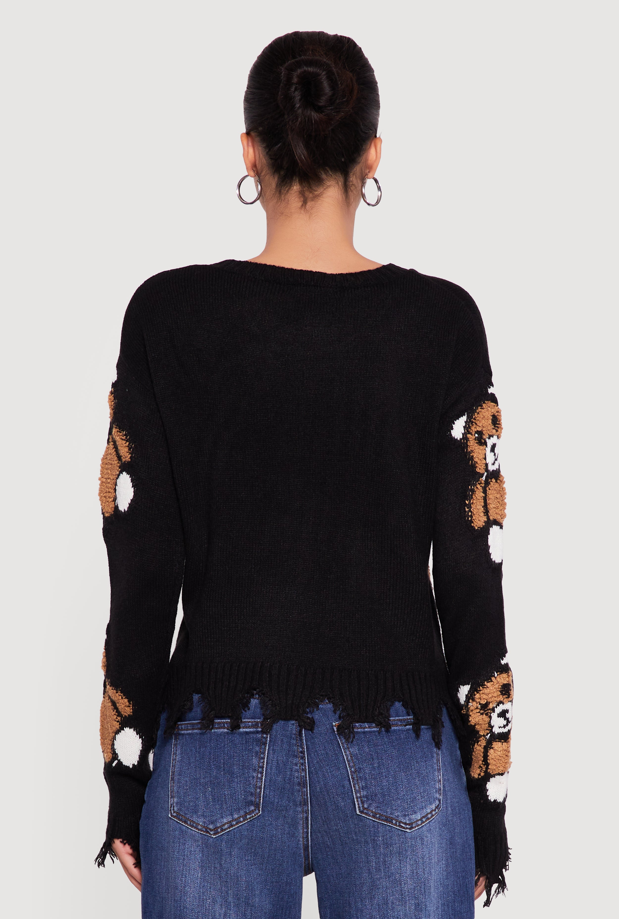 Boucle Teddy Bear Distressed Long Sleeve Crew Neck Sweater