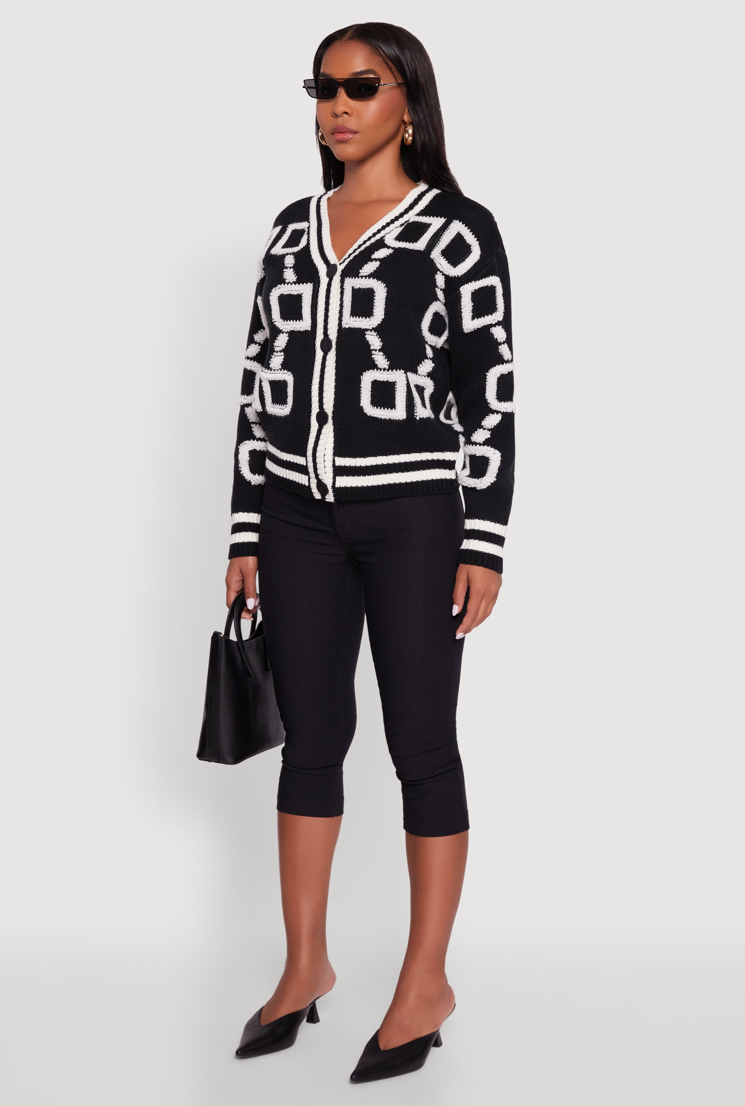 Step up your casual game with the Varsity Stripe Chenille Chain Print Cardigan. This classic fit cardigan blends cozy chenille fabric with a trendy varsity stripe and chain print for a look that feels both timeless and fresh. The button front and V-neckline make it easy to layer over your favorite tees or dresses, adding just the right amount of flair to your everyday outfit. Perfect for chill days or casual hangouts, this cardigan is your new go-to for effortless style and comfort.