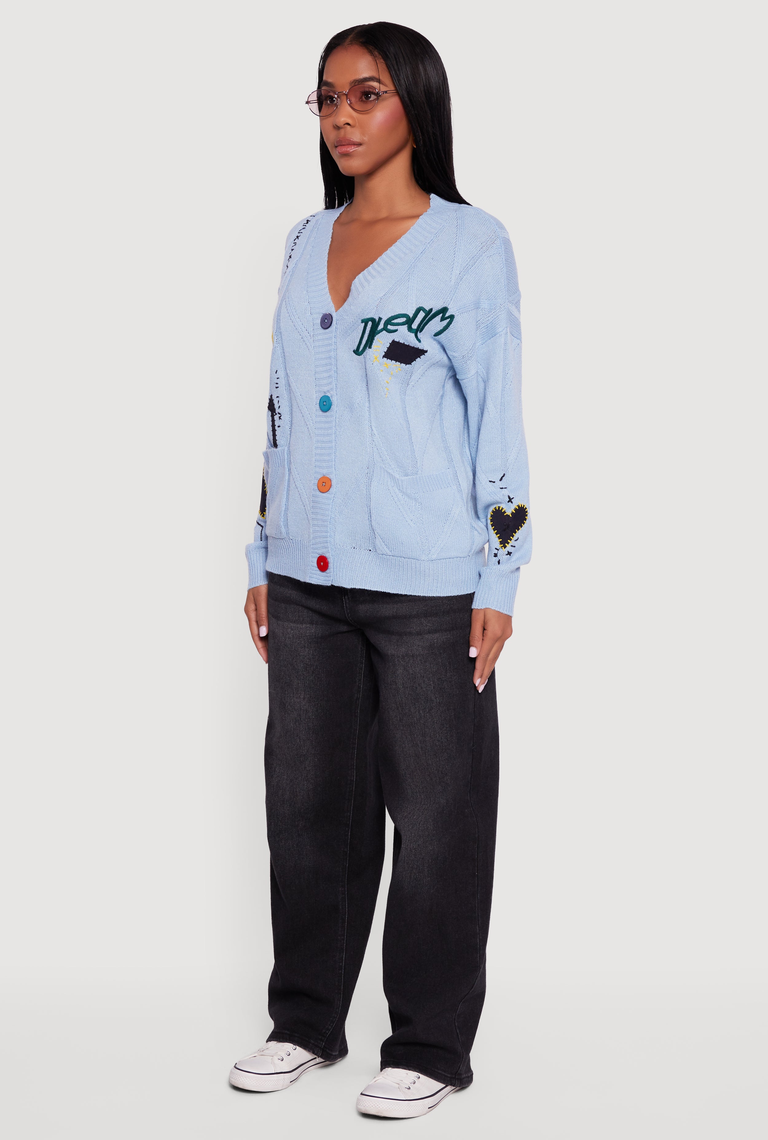 Step up your style game with this Embroidered Patchwork Graphic Button Front Cardigan. Designed with a relaxed fit and a flattering V-neck, this piece is the perfect layering option that seamlessly blends casual comfort with trendy streetwear vibes. The eye-catching embroidered graphic patches add a unique flair, making it a standout addition to your everyday wardrobe. Whether you’re headed to the office or out with friends, this cardigan keeps your look effortlessly cool and cozy.