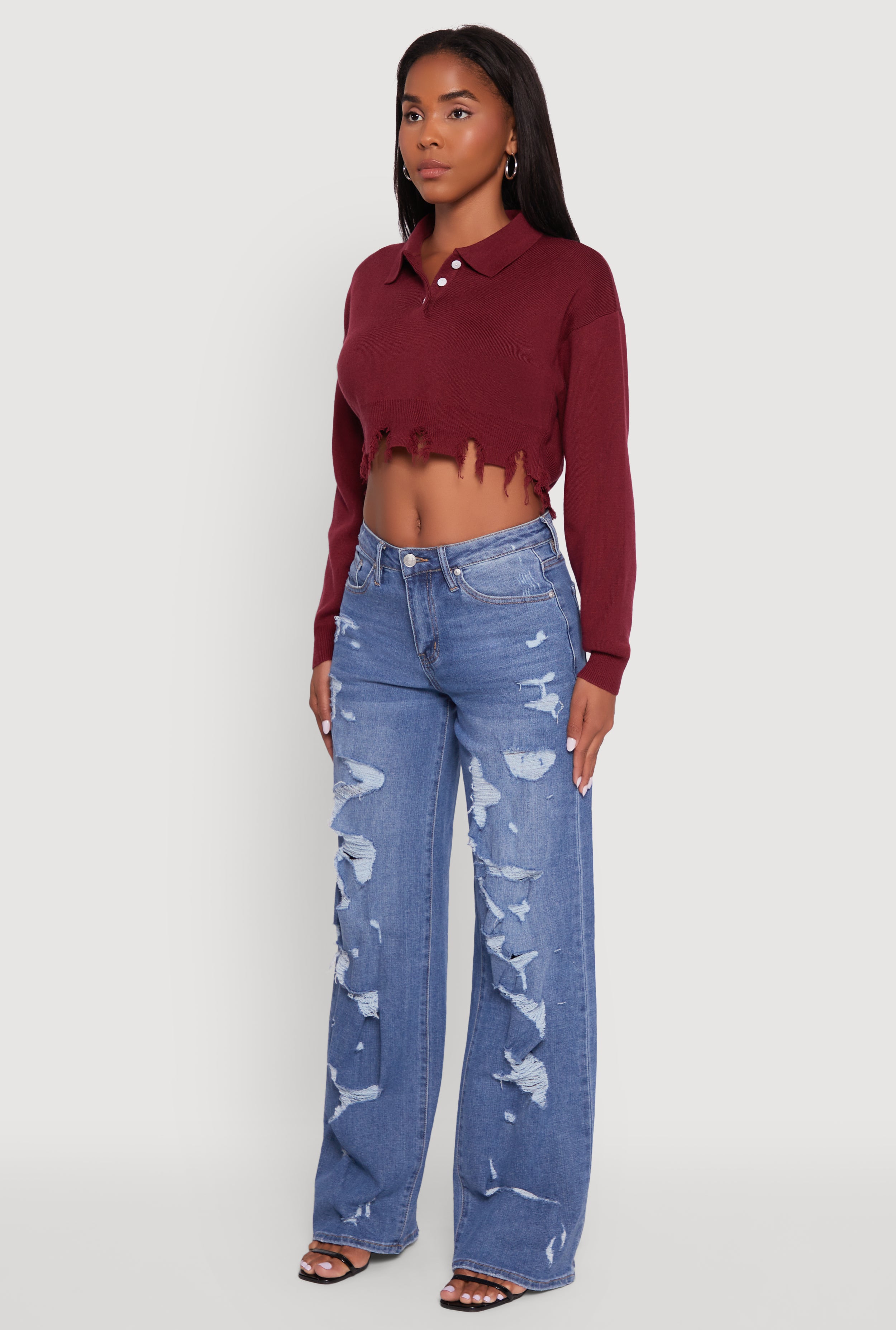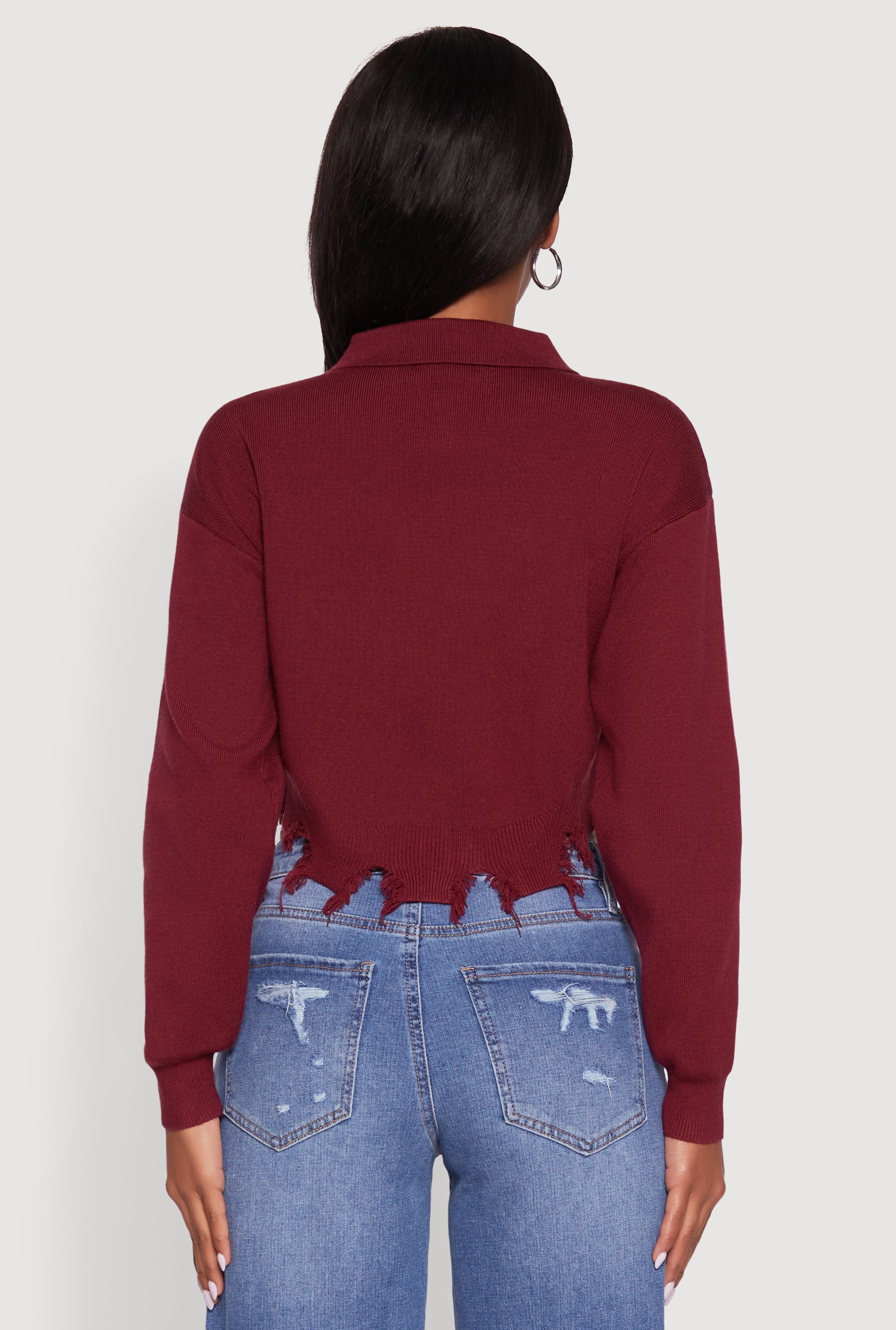 Step up your style game with this Frayed High Low Hem Cropped Long Sleeve Sweater. Perfect for a night out or a casual party, this sweater blends effortless cool with a touch of edge thanks to its frayed hem and classic collared neckline. The high low hem adds a trendy twist, making it a must-have piece that pairs perfectly with your favorite high-waisted jeans or skirts. Stay cozy, look chic, and own every moment.