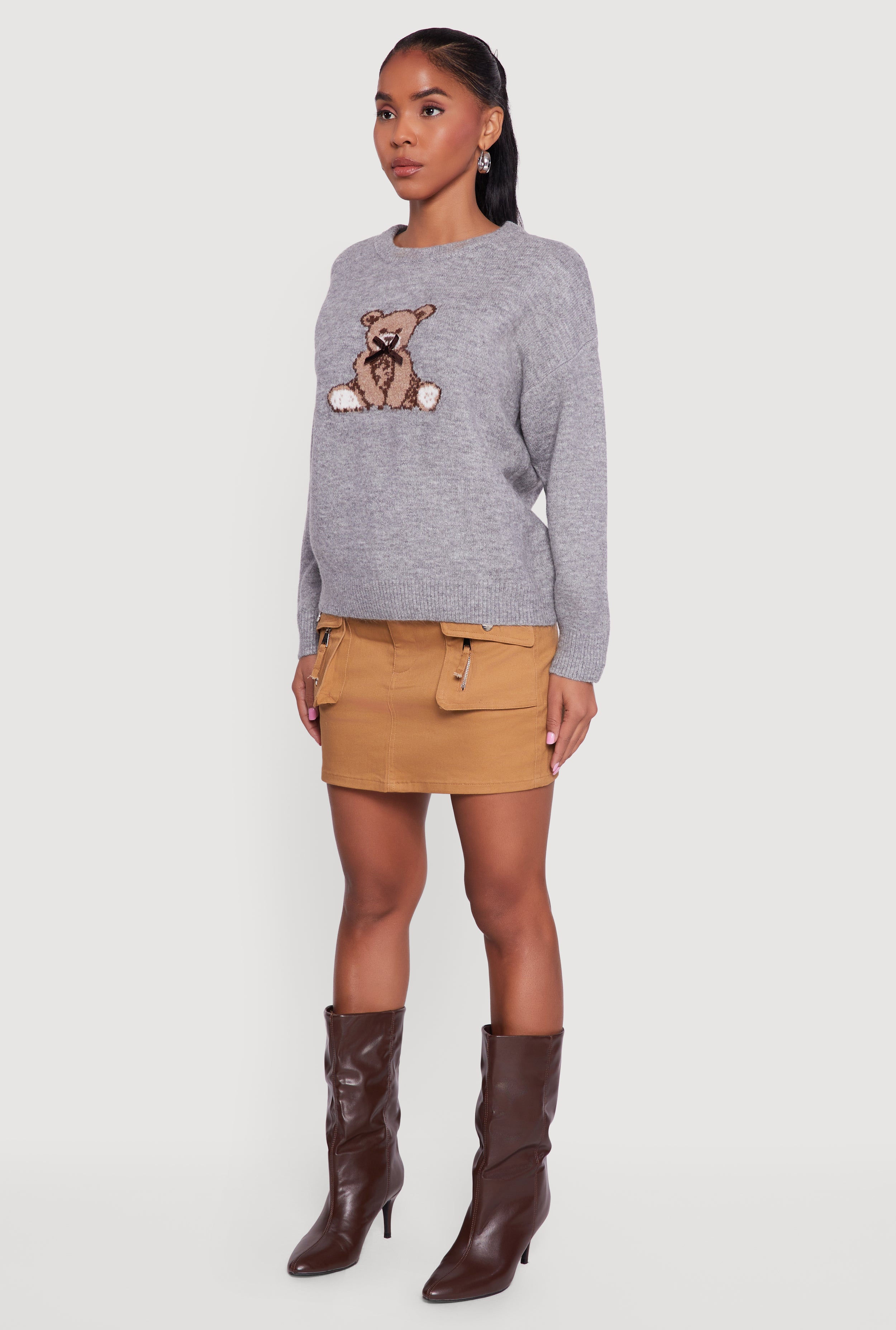 Cozy up in this Bear Graphic Long Sleeve Crew Neck Sweater that brings a playful touch to your casual wardrobe. Made from soft brushed knit fabric, it offers a classic fit that feels just right without being too tight or loose. The crew neck and long sleeves make it perfect for layering or wearing on its own, while the charming bow embellishment adds a subtle, cute detail. Whether you're lounging at home or stepping out with friends, this sweater is your go-to for effortless style and comfort.