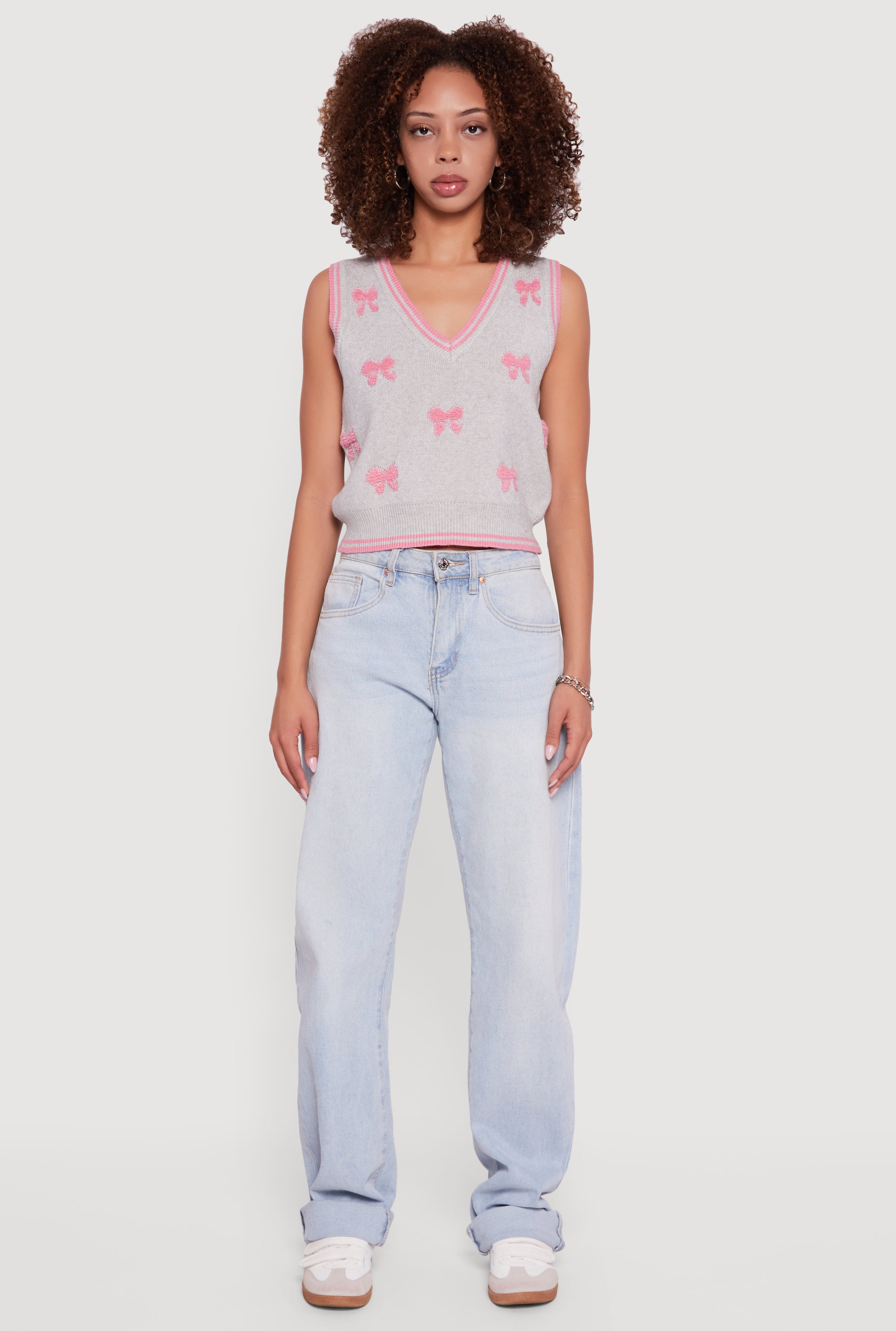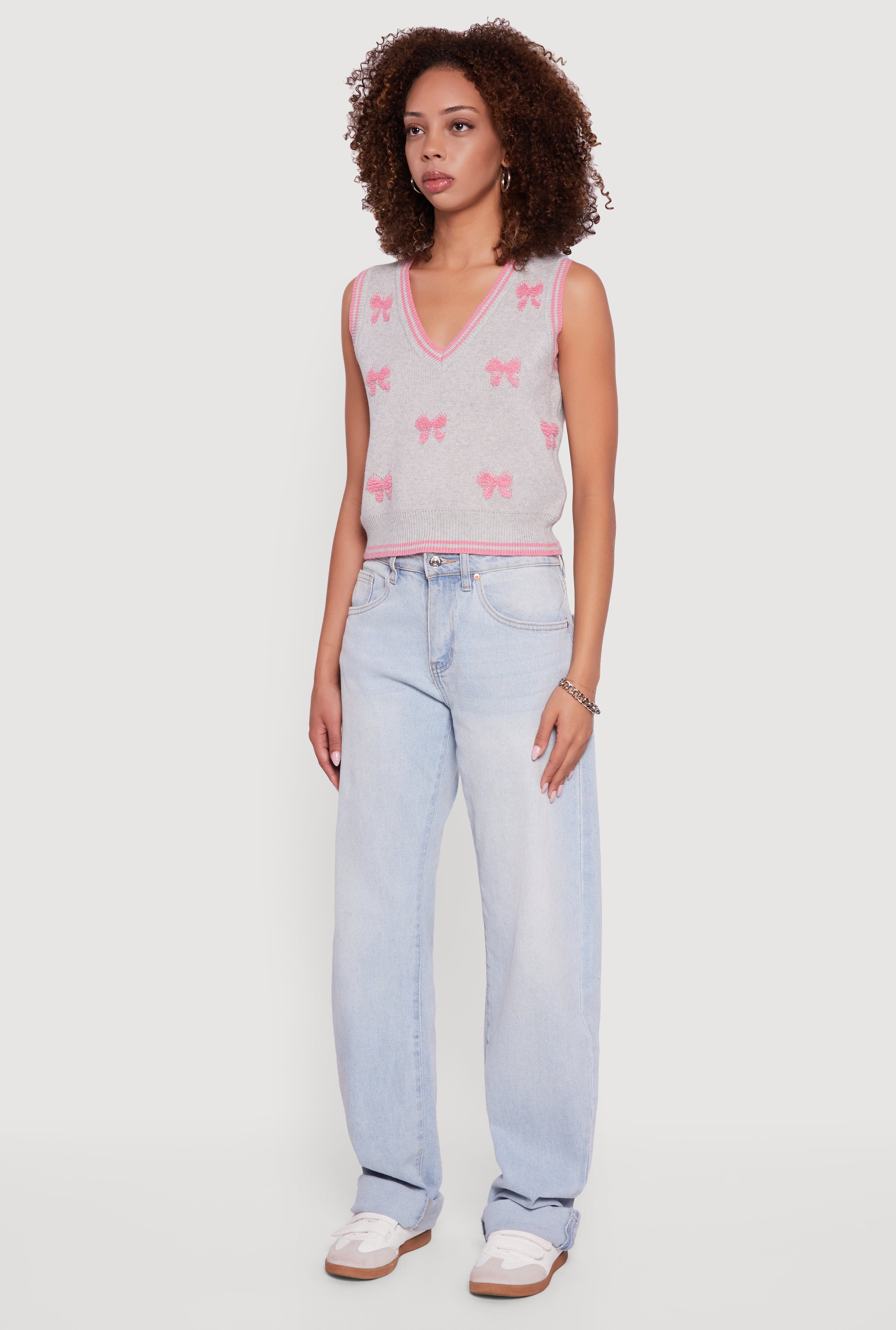 Step into effortless style with the Chenille Bow Print V-Neck Sweater Vest. This sleeveless classic fit piece is your new go-to for casual days when you want to feel cozy but still look on point. The soft chenille fabric and ribbed knit texture give it that perfect mix of comfort and charm, while the playful bow print adds a touch of fun to your everyday look. Layer it over your favorite tee or wear it solo for an easy, chic vibe that’s totally Instagram-worthy.
