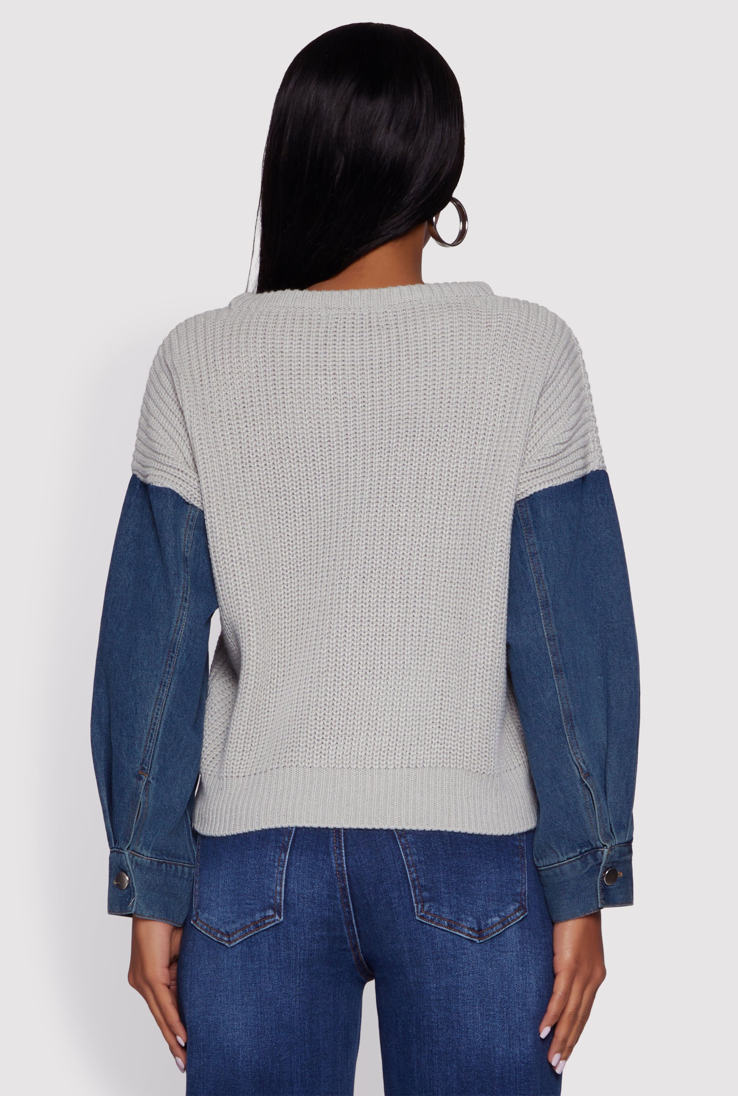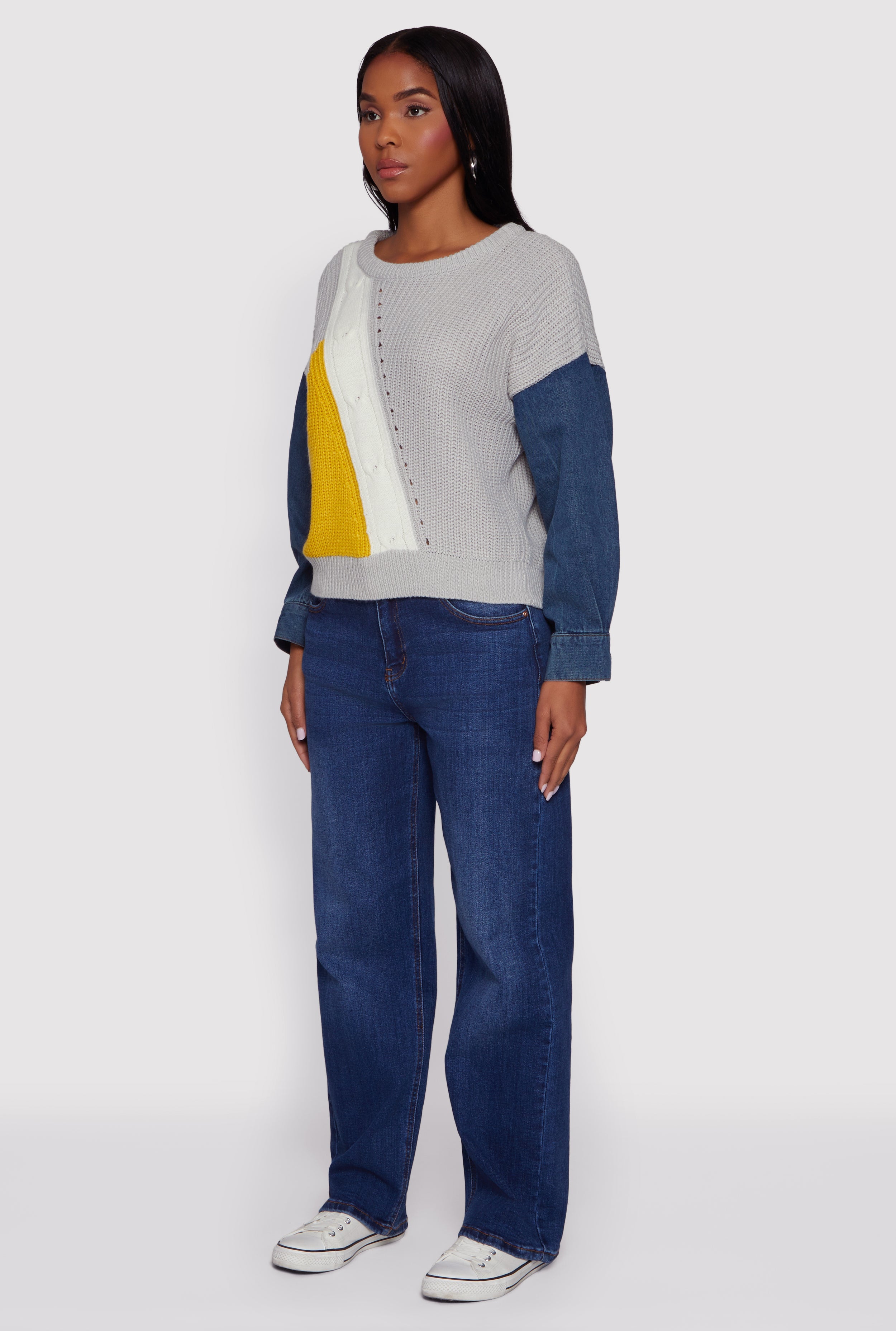 Step up your casual game with this Color Blocked Sweater featuring cool denim sleeves. Designed for a classic fit and a comfy crew neck, this pullover blends streetwear style with everyday ease. Perfect for those laid-back days when you want to look effortlessly trendy without trying too hard.