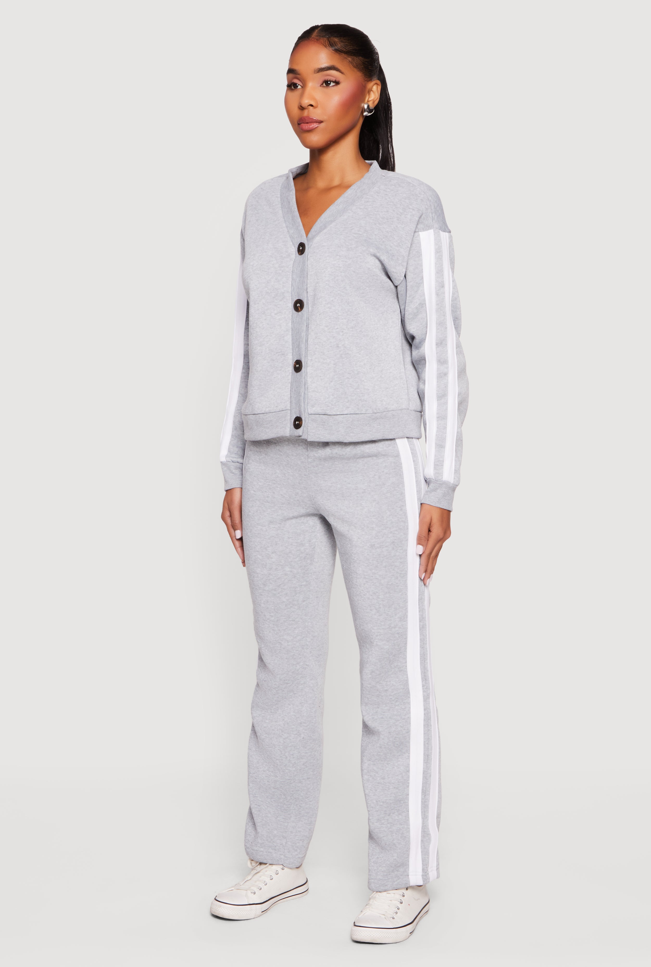 Cozy up in style with this fleece lined varsity stripe button front cardigan. Designed with a classic fit and a flattering V-neck, it effortlessly blends casual comfort with sporty vibes. The soft fleece lining keeps you warm while the varsity stripe detail adds a cool, retro touch. Perfect for layering on chilly days or adding a laid-back edge to your everyday look.