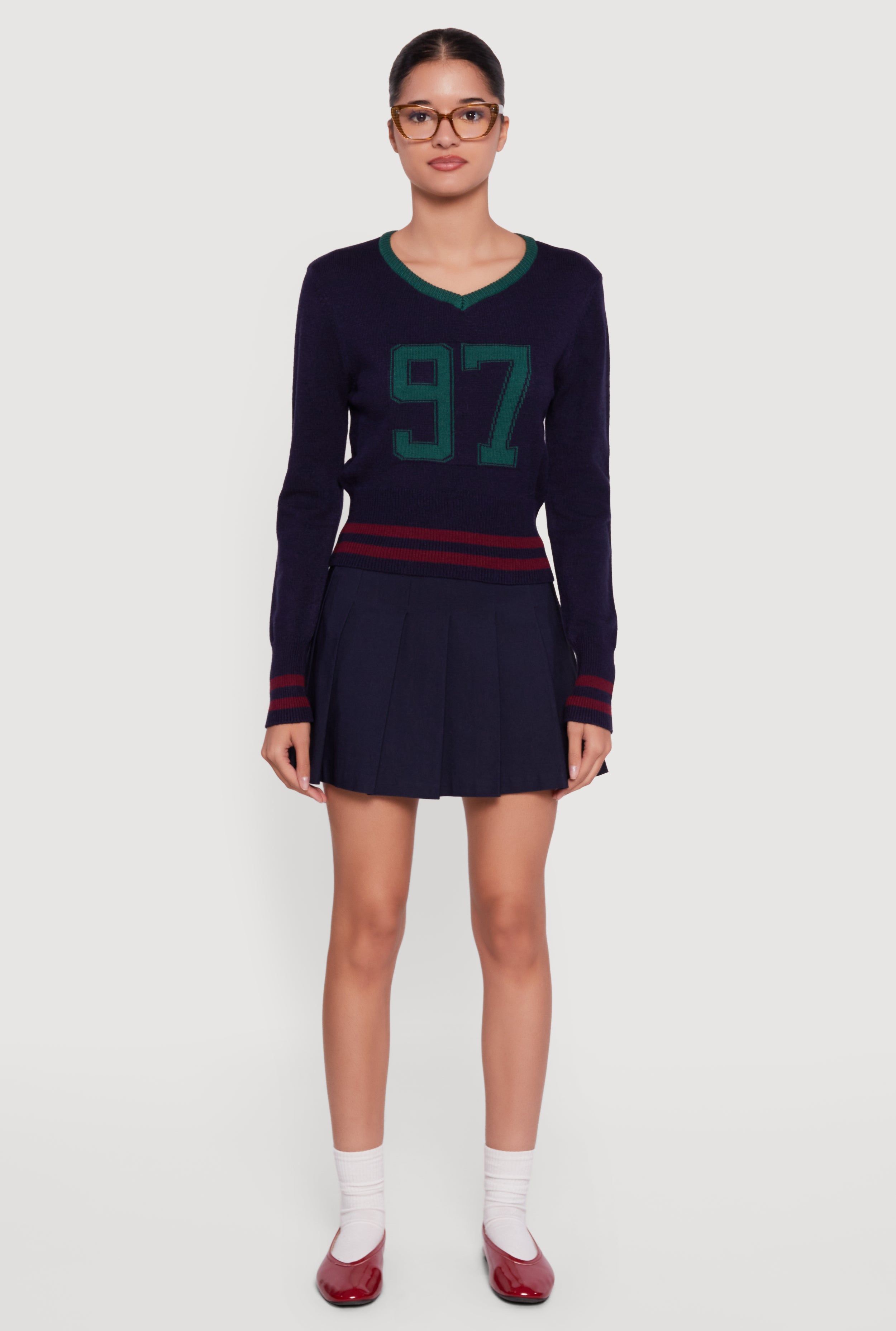 Step up your casual game with the 97 Graphic Varsity Stripe V-Neck Sweater. This classic fit sweater features a trendy varsity stripe and a bold "97" graphic that adds a sporty edge to your everyday look. The flattering V-neck and long sleeves make it perfect for layering or wearing solo on cooler days. Whether you're heading out for coffee or chilling with friends, this sweater brings effortless style and comfort without breaking the bank.