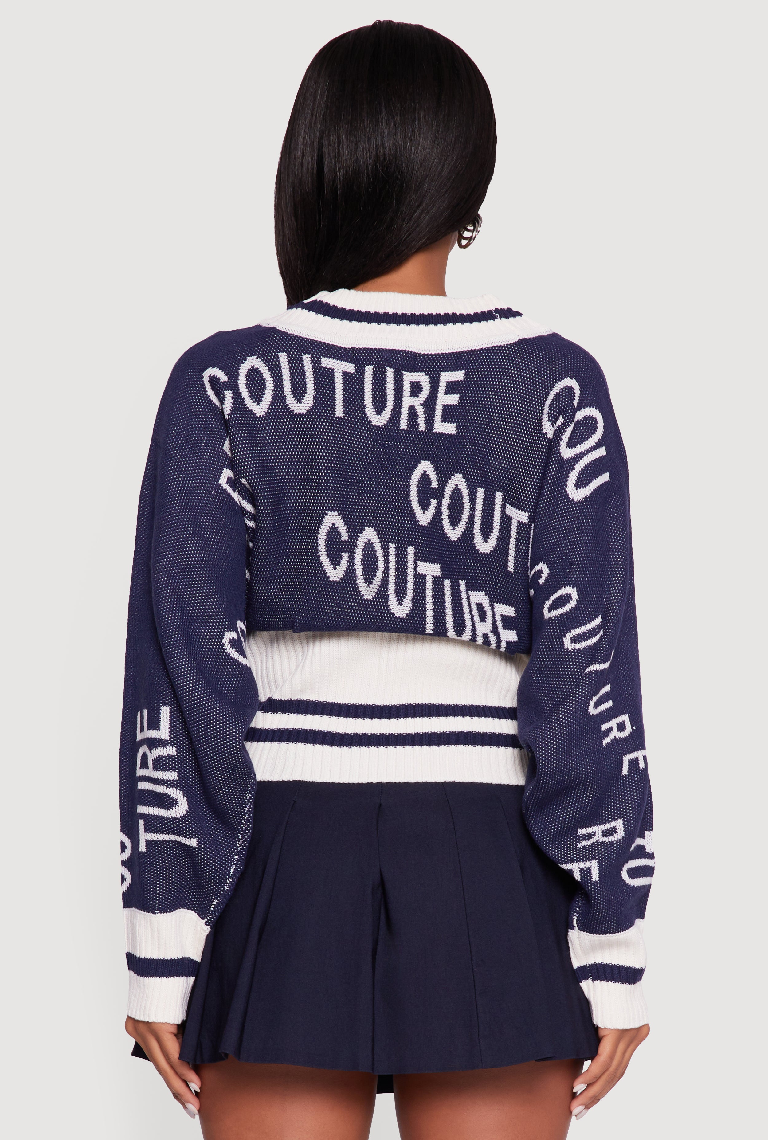 Step up your casual game with the Couture Graphic Long Sleeve Plunge Neck Sweater. This ribbed knit sweater combines a timeless classic fit with a bold plunge neckline, making it effortlessly chic and comfy. The varsity stripe detail and contrast trim add a sporty edge that’s perfect for everyday vibes or weekend hangouts. Whether you’re layering up or rocking it solo, this sweater is your new go-to for style that speaks volumes without saying a word.