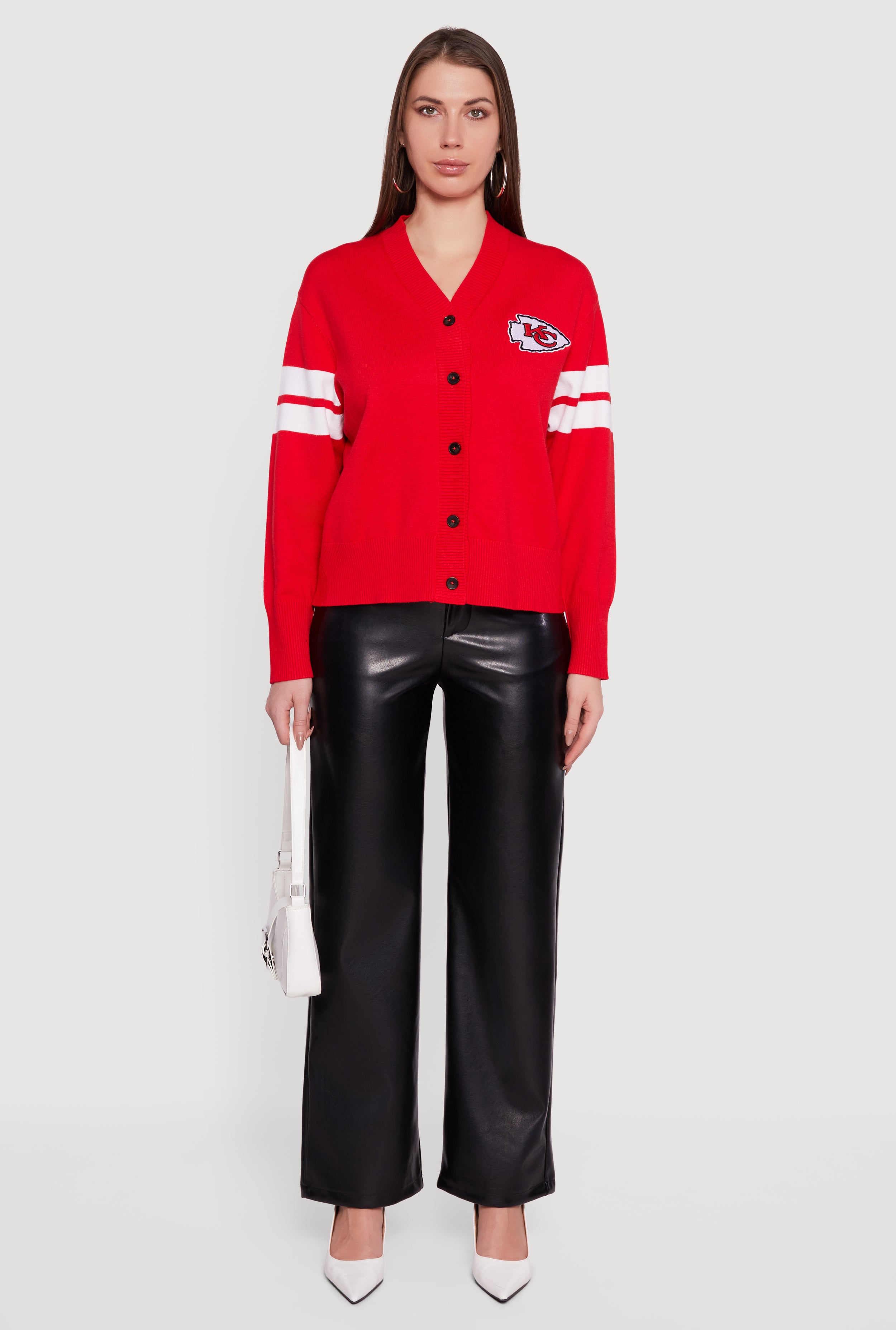 Show off your team spirit with the NFL Kansas City Chiefs Cardigan designed just for women who love casual comfort and style. This relaxed fit cardigan features a flattering V-neck and long sleeves, perfect for layering on game day or any day you want to add a sporty edge to your outfit. The button-front closure makes it easy to wear, while varsity stripe details and embroidered accents bring that authentic fan vibe. Whether you’re cheering from the stands or hanging out with friends, this cardigan keeps you cozy and cool all season long.