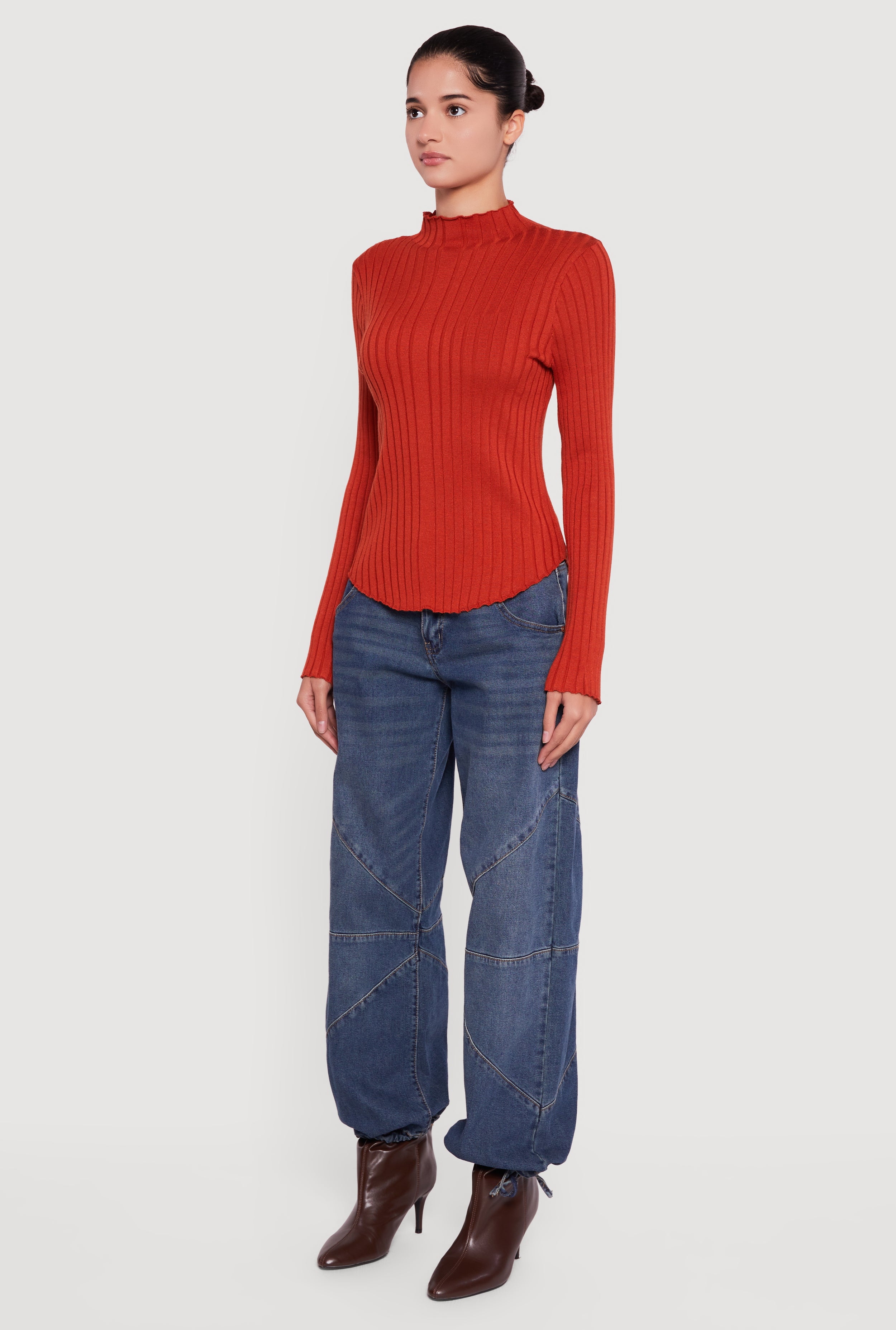 Stay cozy and effortlessly chic in this Rib Knit Long Sleeve Mock Neck Sweater. Designed with a classic fit and a flattering rounded hem, it’s your go-to for casual days when you want to look put together without trying too hard. The soft ribbed knit fabric hugs your silhouette while the mock neck adds a touch of sophistication that’s perfect for layering or wearing solo.
